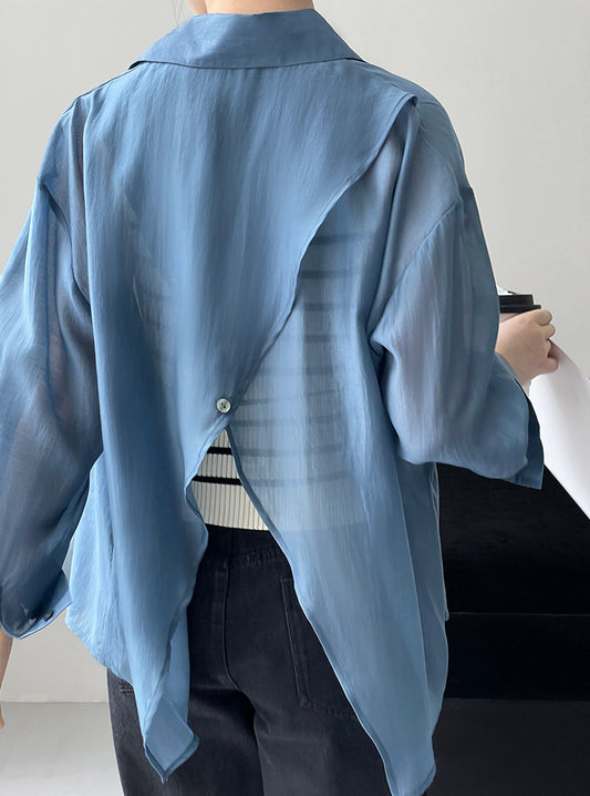 在台現貨灰藍色【cim5371】實拍韓國春夏天絲後背開叉防曬襯衫