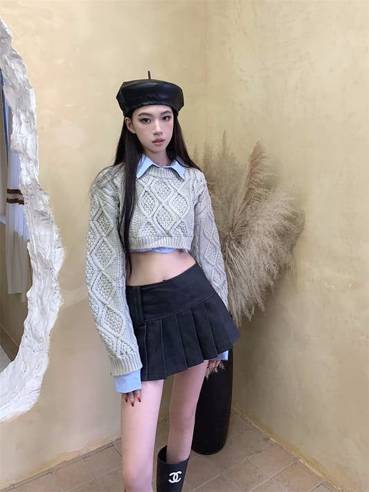 【F01124】實拍假兩件麻花短版針織毛衣+百褶皮裙(分開下單)250106