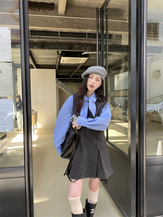 【F01223】實拍2025春季新款復古純棉襯衫送領結+毛呢背心裙(分開下單)250113