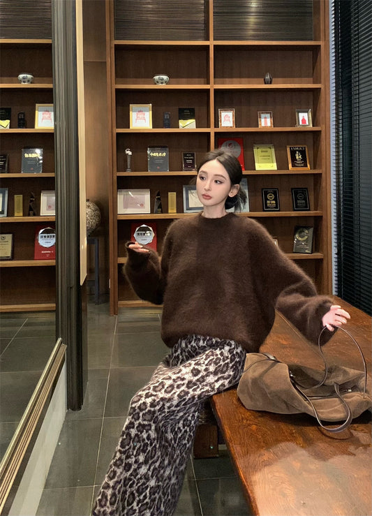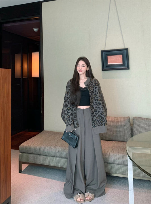 【F01237】實拍復古氣質寬鬆慵懶豹紋針織開衫+直筒闊腿西裝長褲(分開下單)250113