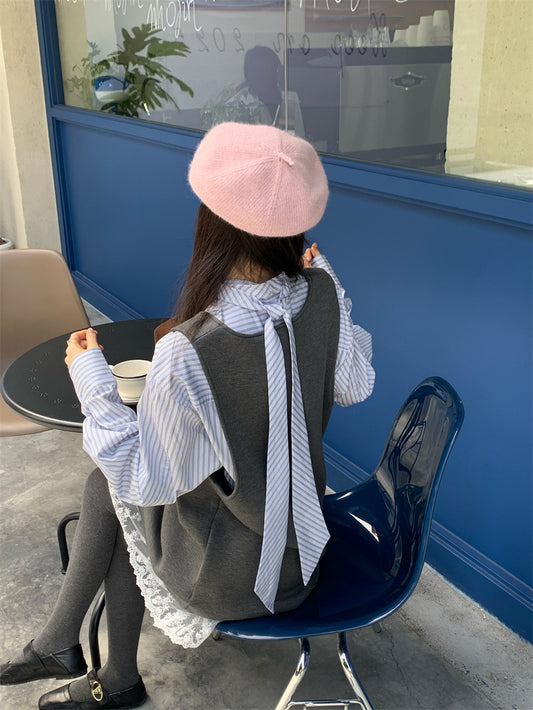 【F01131】實拍復古蕾絲拼接背心裙+純棉領結襯衫(分開下單)250106