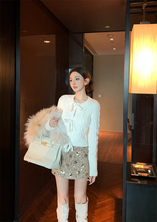 【F01234】實拍復古蝴蝶結毛衣上衣+重工亮片裙(分開下單)250113