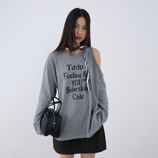 【H5407】實拍慵懶個性灰色斜肩字母衞衣250909