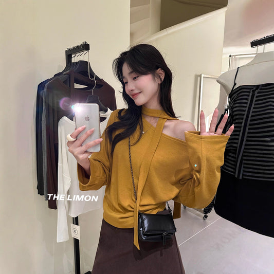 【L9217】實拍檸檬秋季氣質斜肩顯瘦長袖T恤+飄帶250915