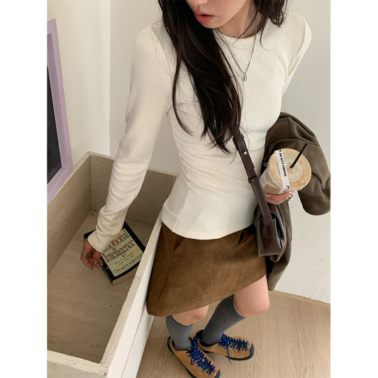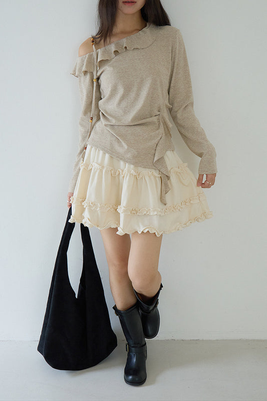 【LD3216】實拍斜肩小荷葉混紡棉長袖T恤250929