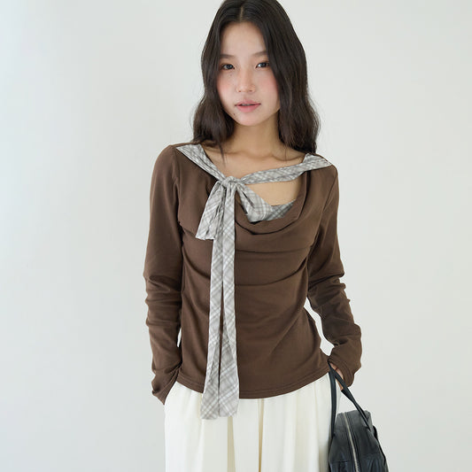 【LD3192】實拍法式菱格飄帶假兩件蕩領T恤250922