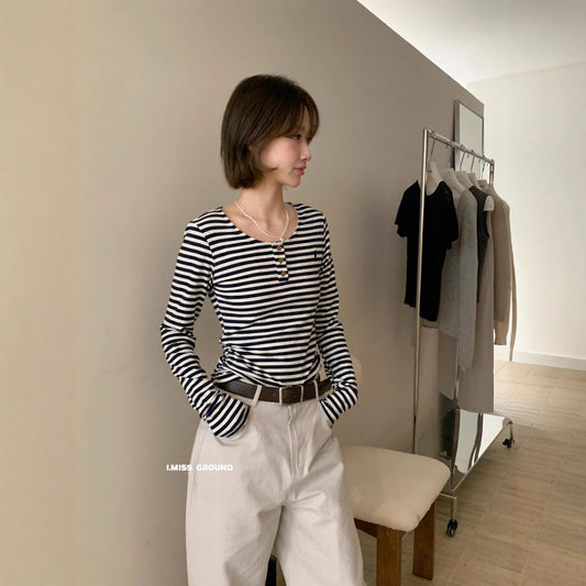 【L2172】實拍初秋圓領刺繡棉質條紋長袖T恤250923