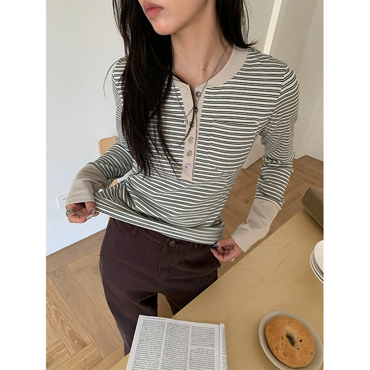 【H5431】實拍半開襟條紋圓領長袖T恤250916