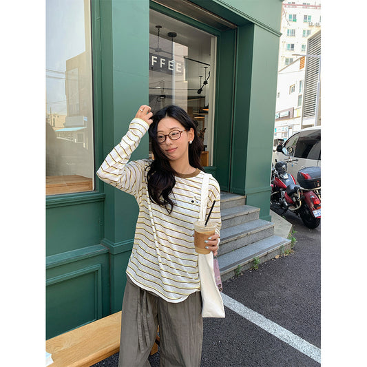 【H5386】實拍寬鬆薄款防曬圓領條紋長袖T恤250902