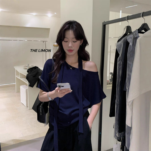 【L1128】實拍檸檬家慵懶羊絨斜肩T恤+飄帶250901