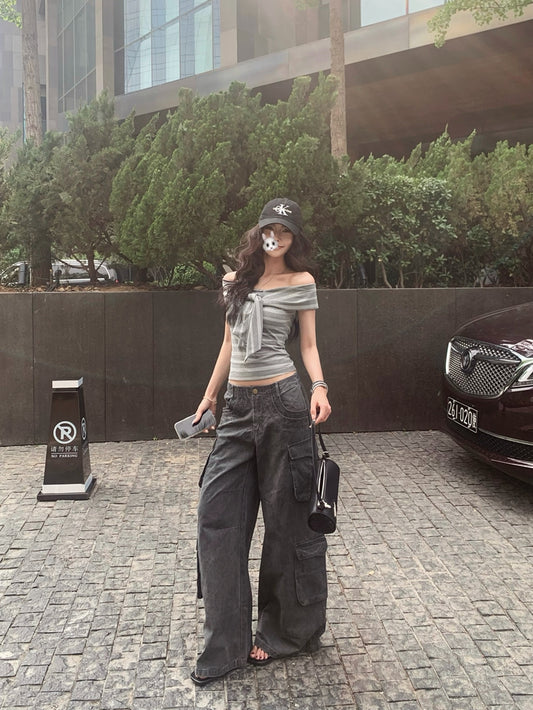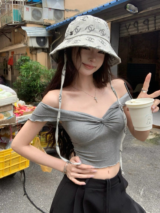 【F60432】實拍夏天一字肩棉質綁帶扭結T恤250609