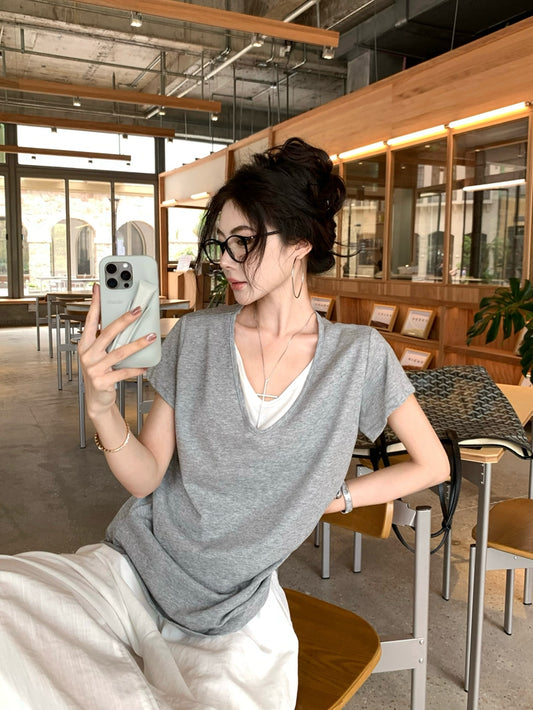 【F60436】實拍夏季假兩件寬鬆慵懶短袖T恤250609