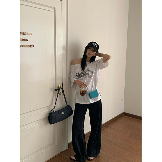 【F60465】實拍美式寬鬆印花斜肩T恤250616