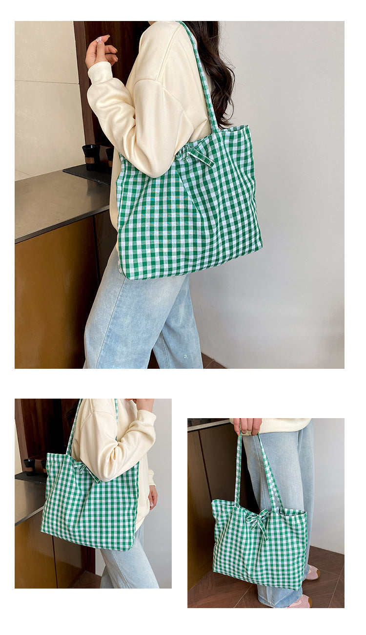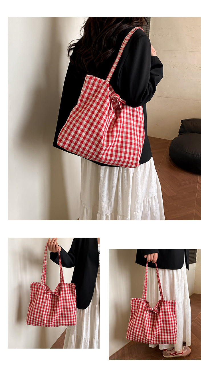 【B7807】夏季韓版紅格帆布包|清爽大容量上課通勤手提袋250514