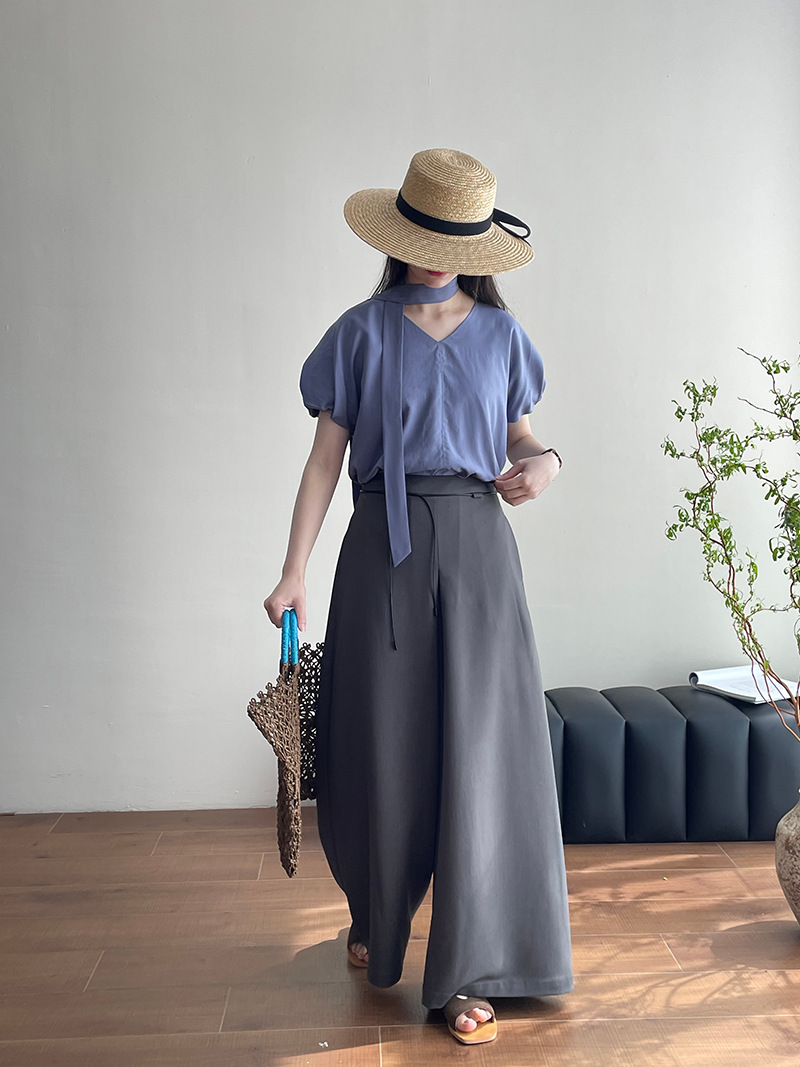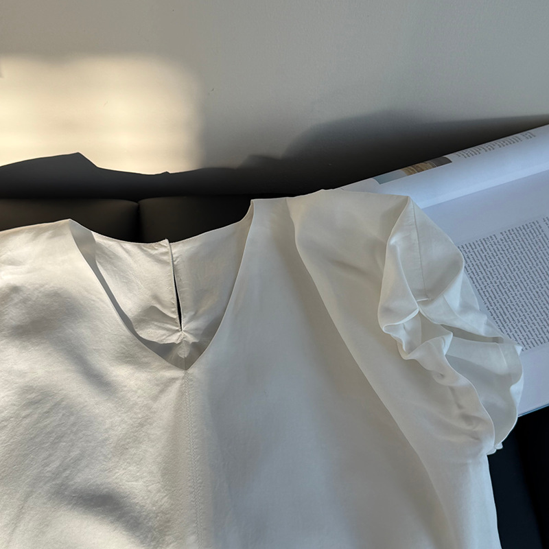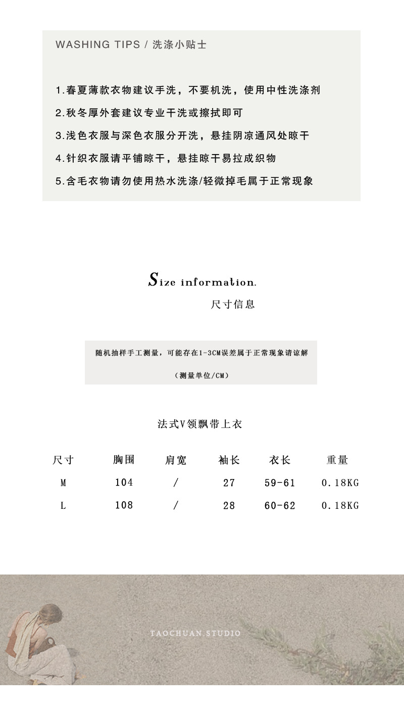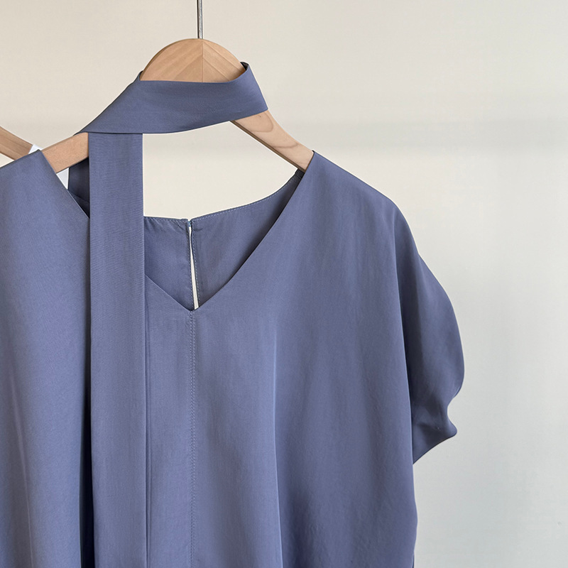【cim2697】實拍法式V領簡約泡泡袖天絲襯衫+飄帶250403