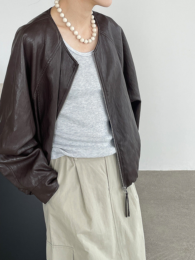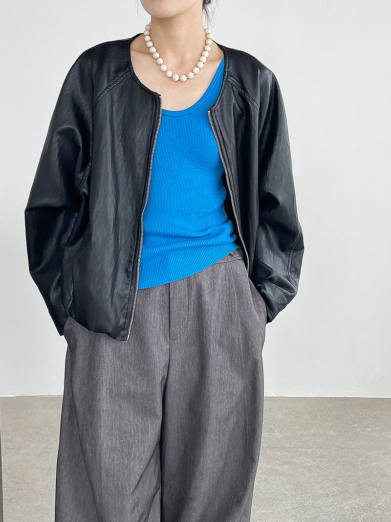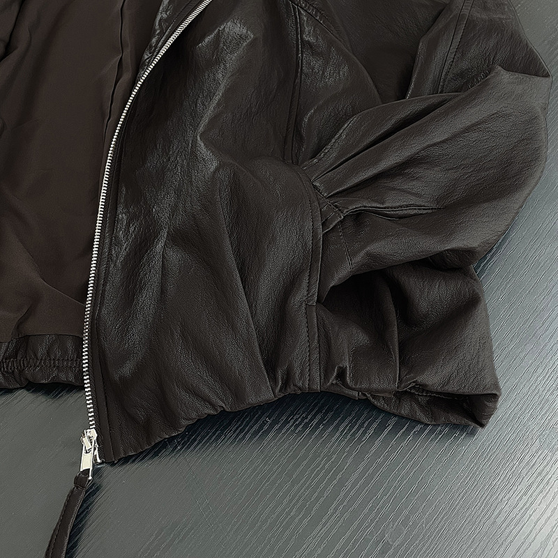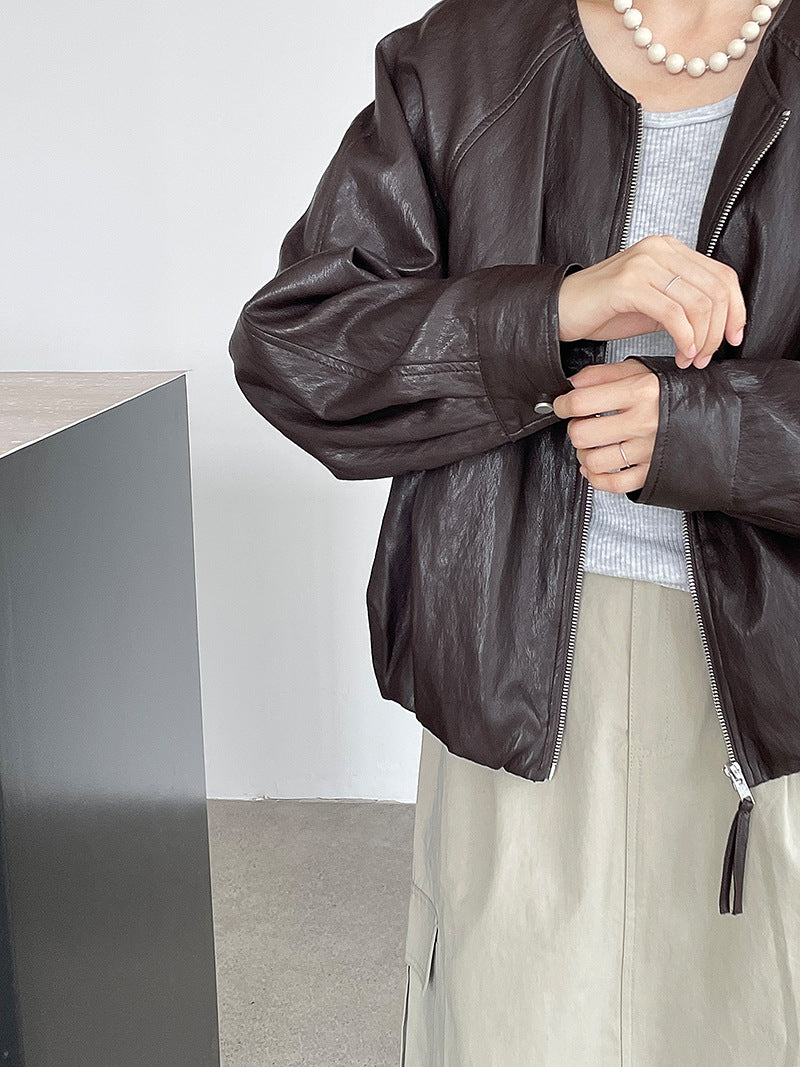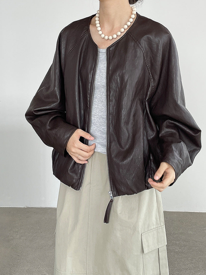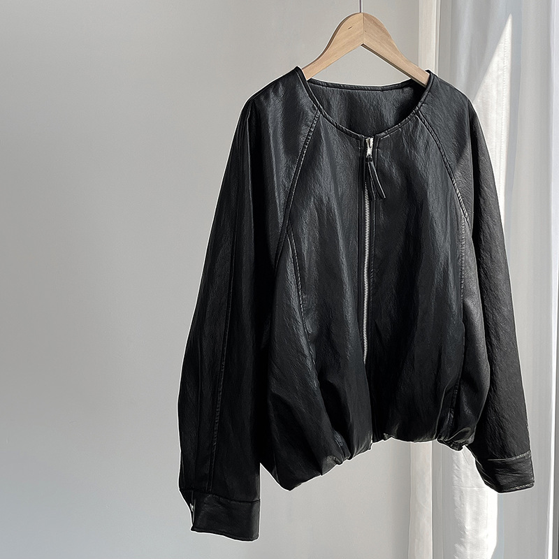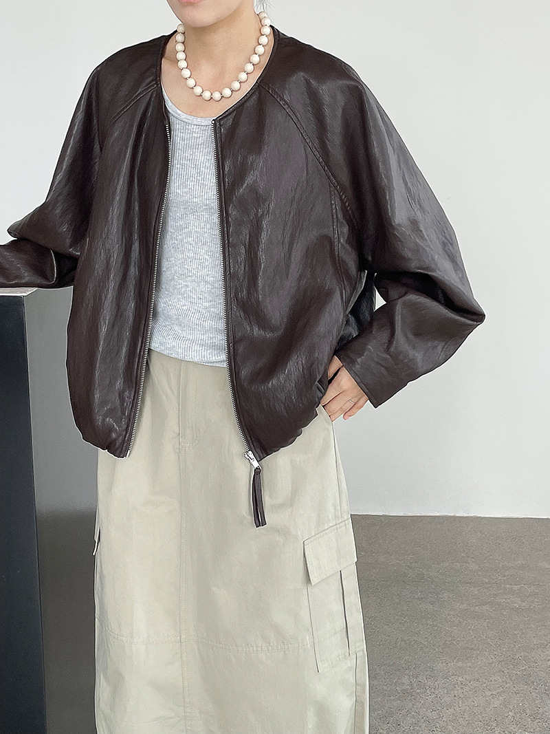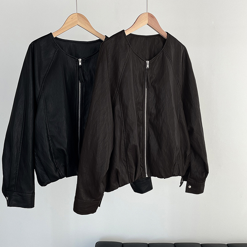 【cim2786】實拍高級小圓領柔軟pu皮外套皮衣251002