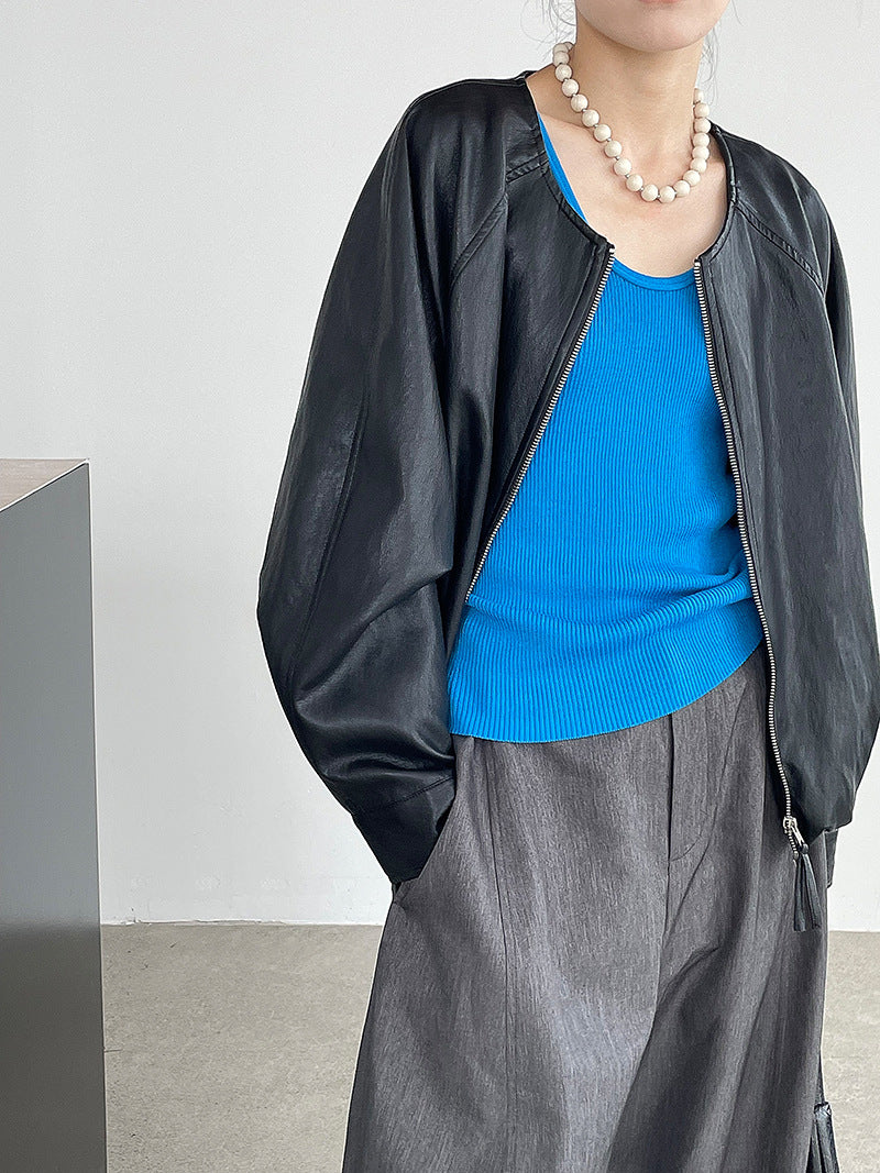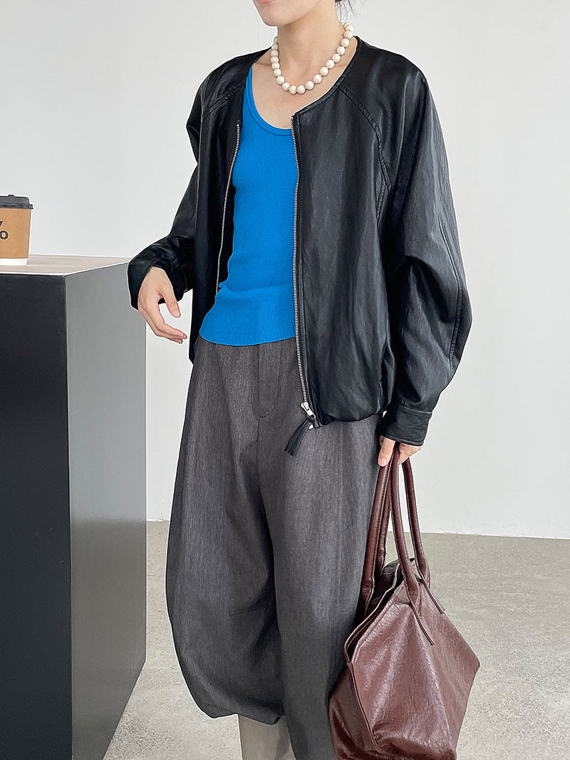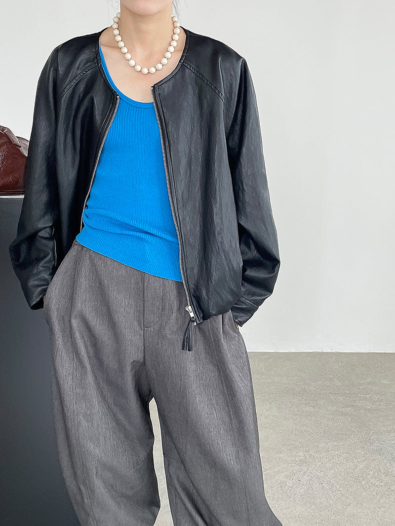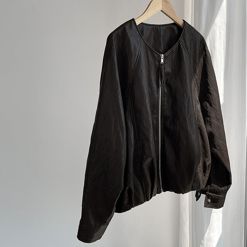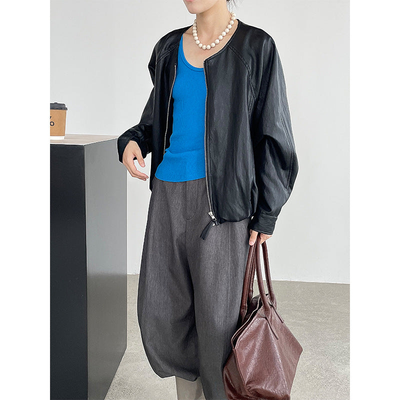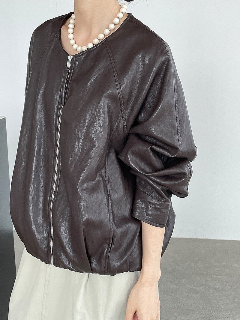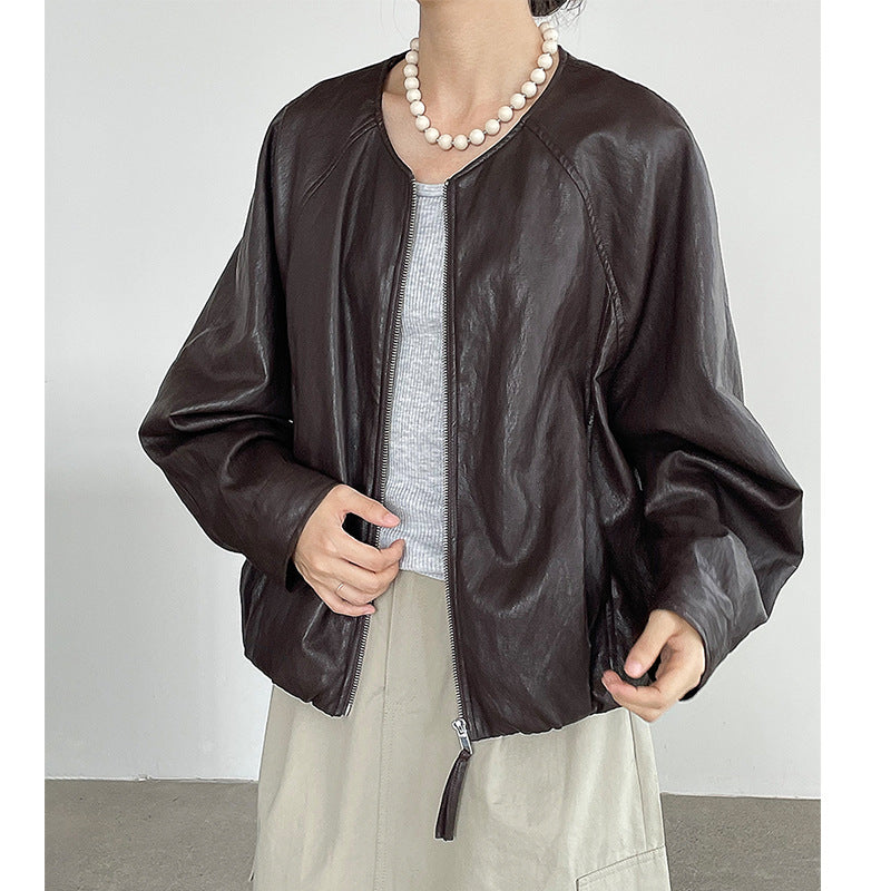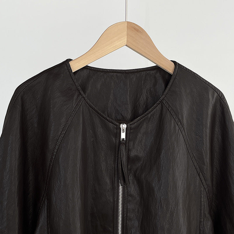 【cim2786】實拍高級小圓領柔軟pu皮外套皮衣251002