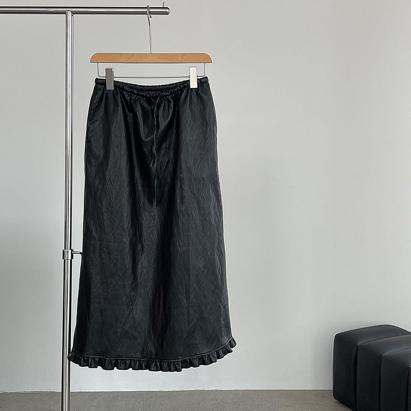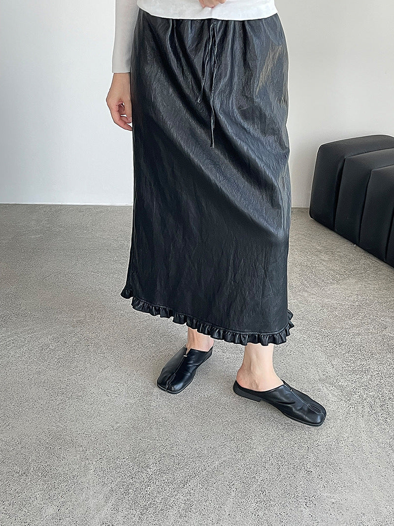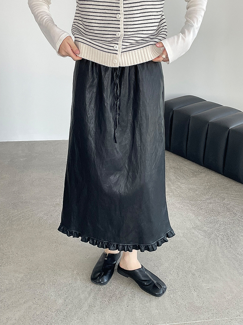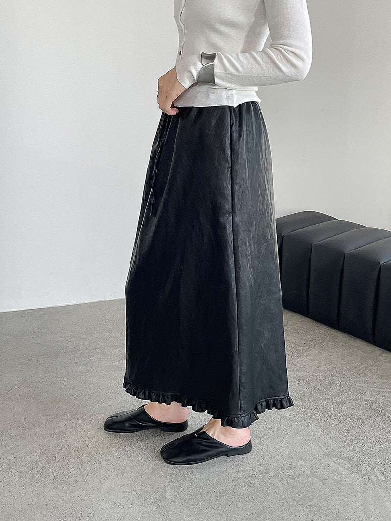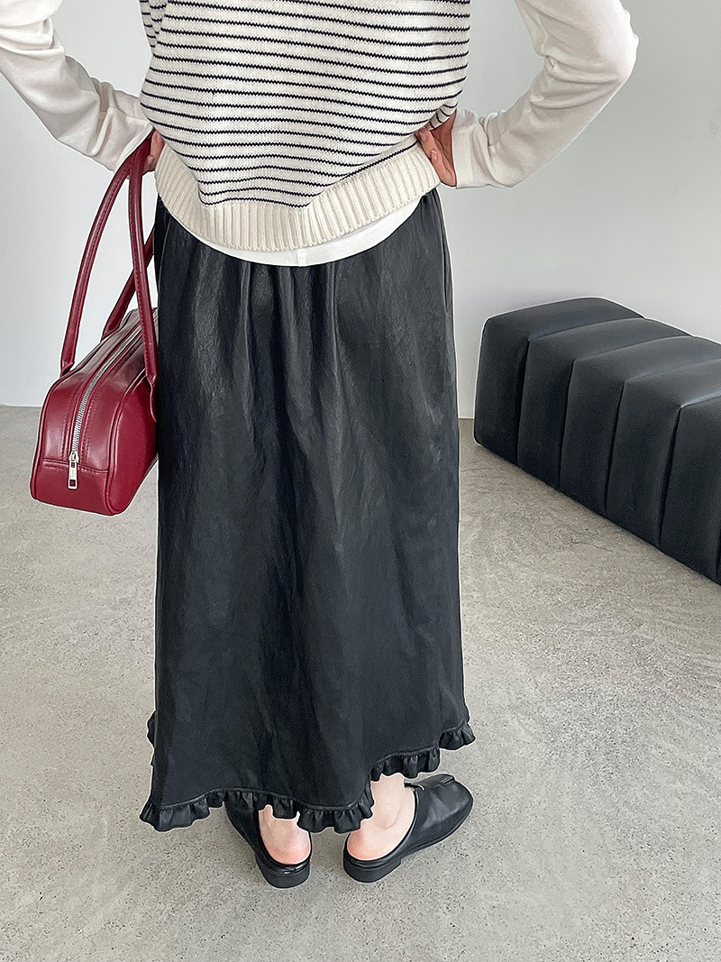 【cim2799】實拍鬆緊腰下襬荷葉PU皮長裙250904