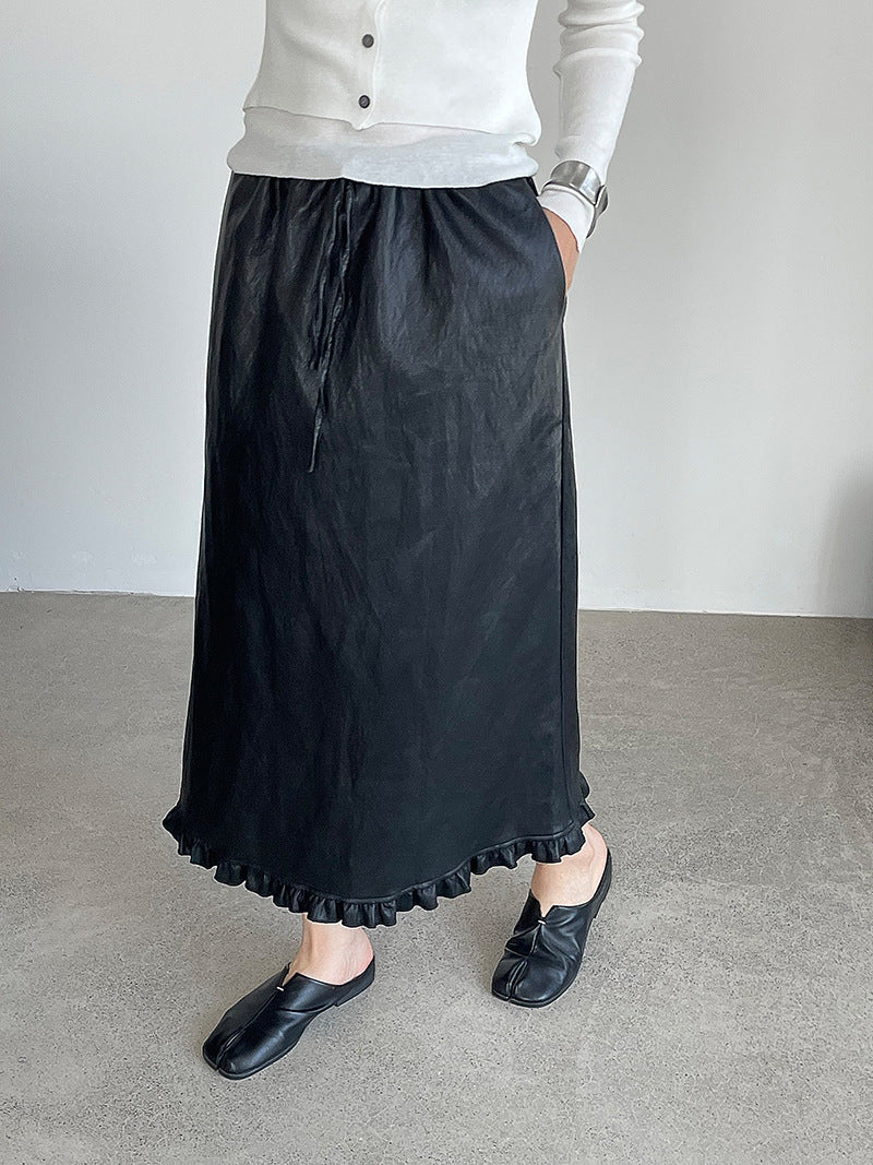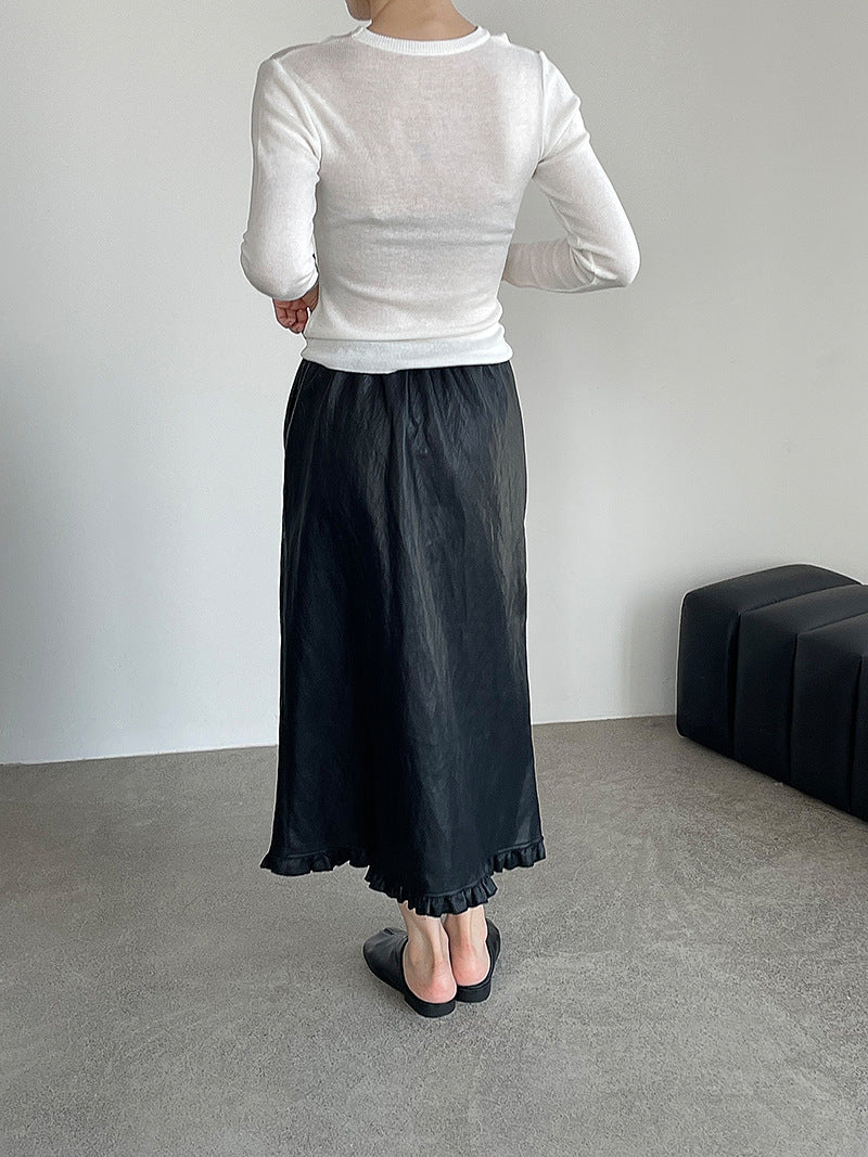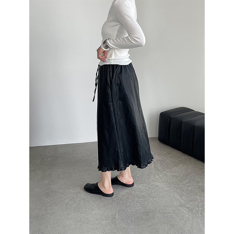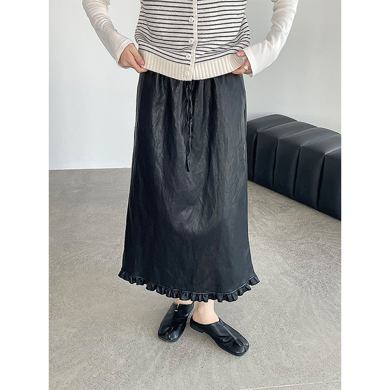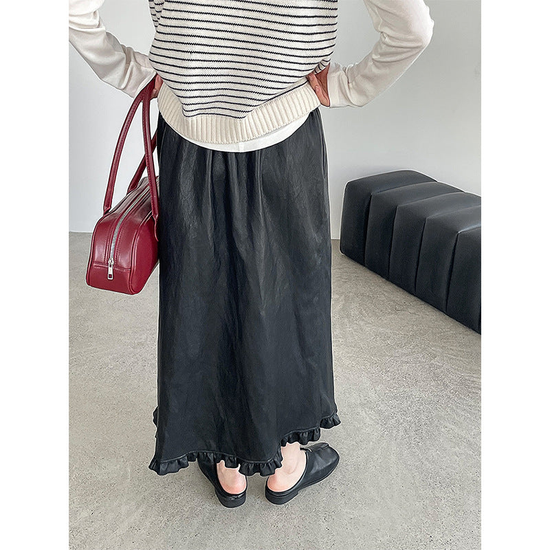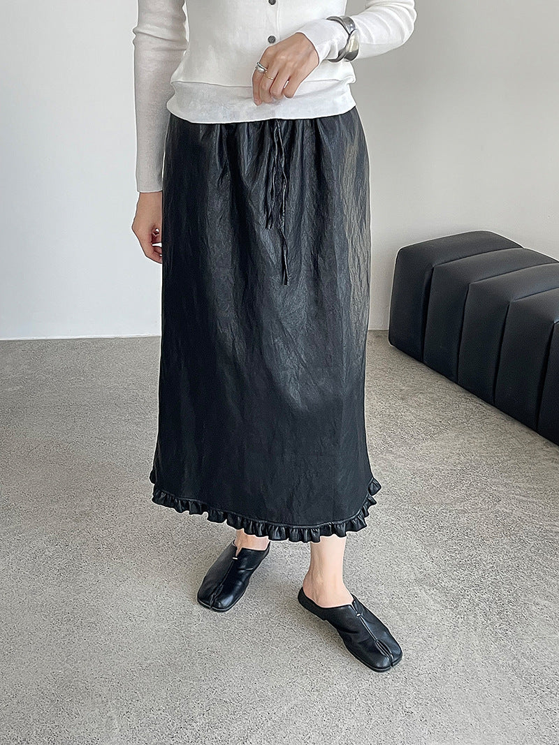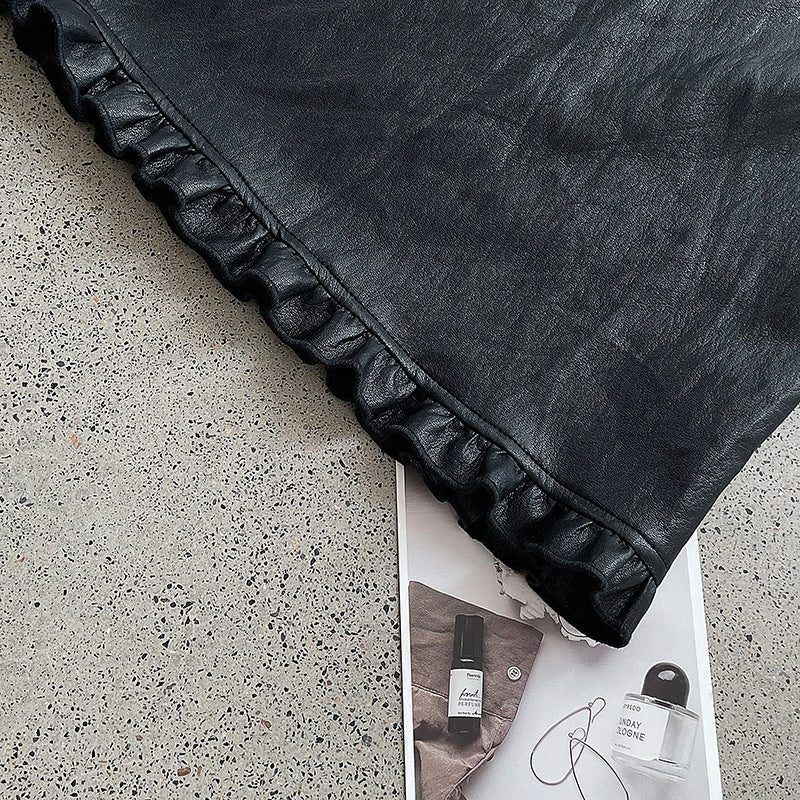 【cim2799】實拍鬆緊腰下襬荷葉PU皮長裙250904