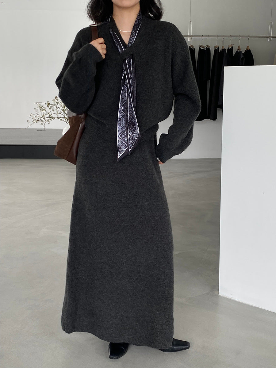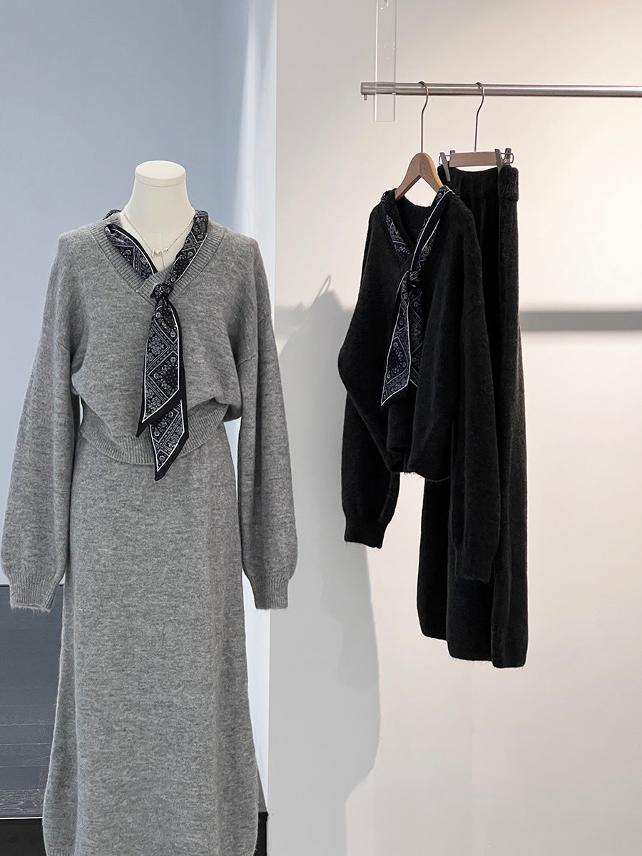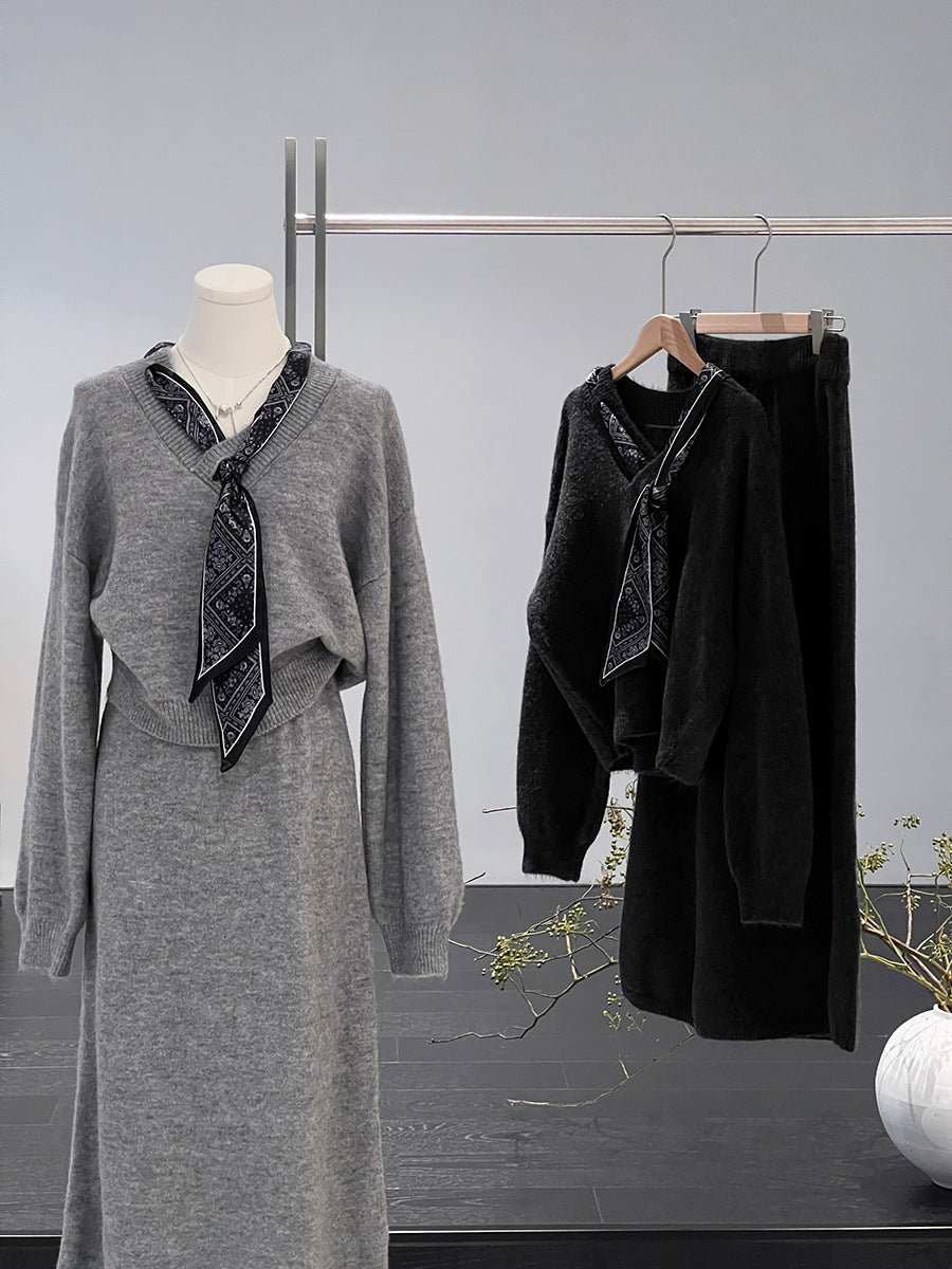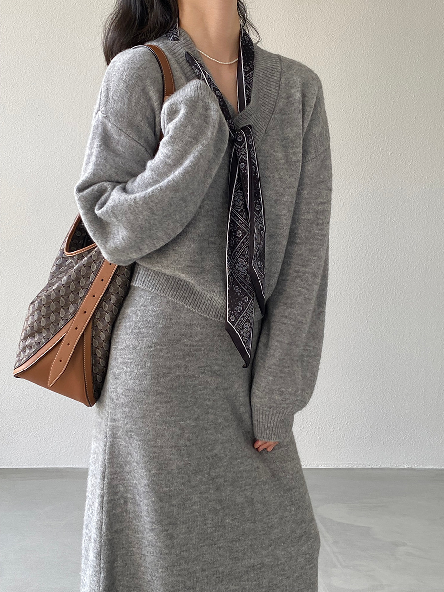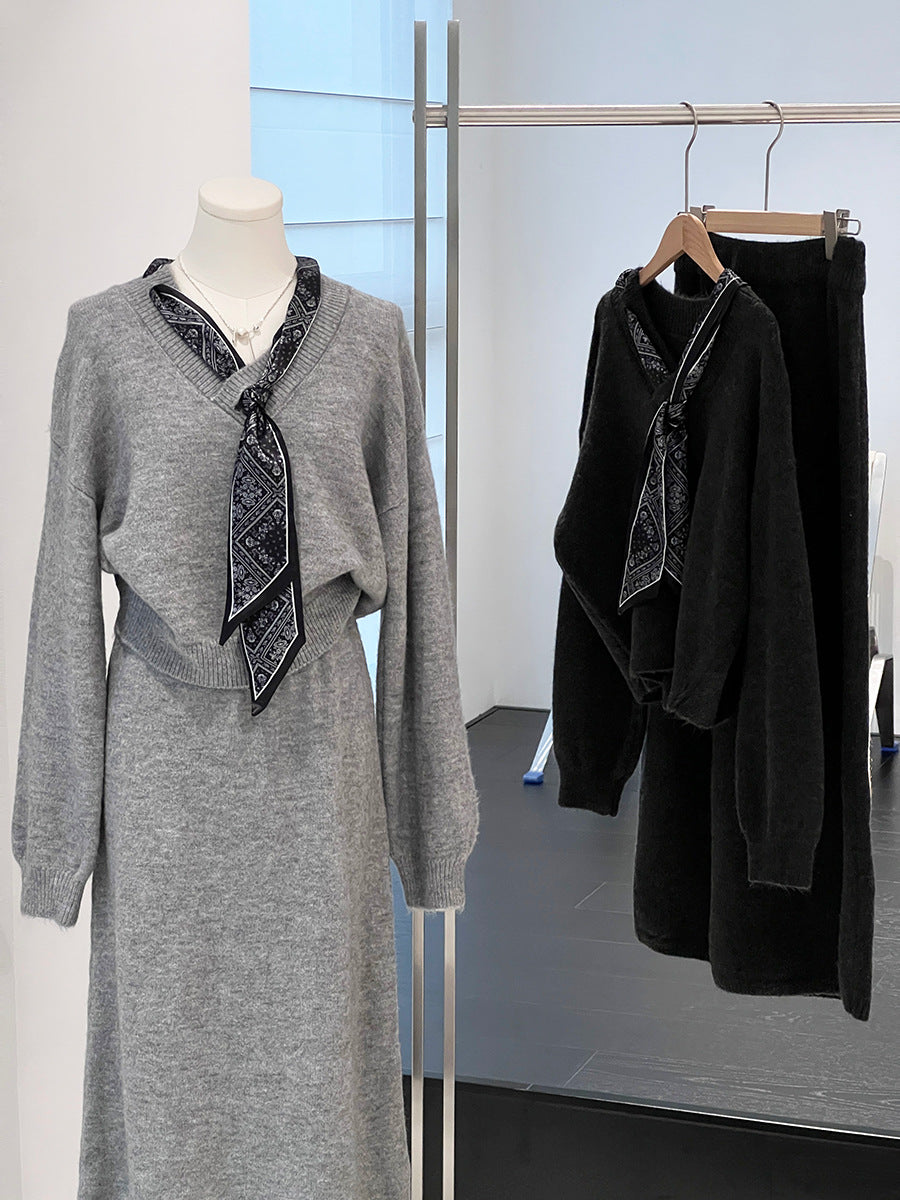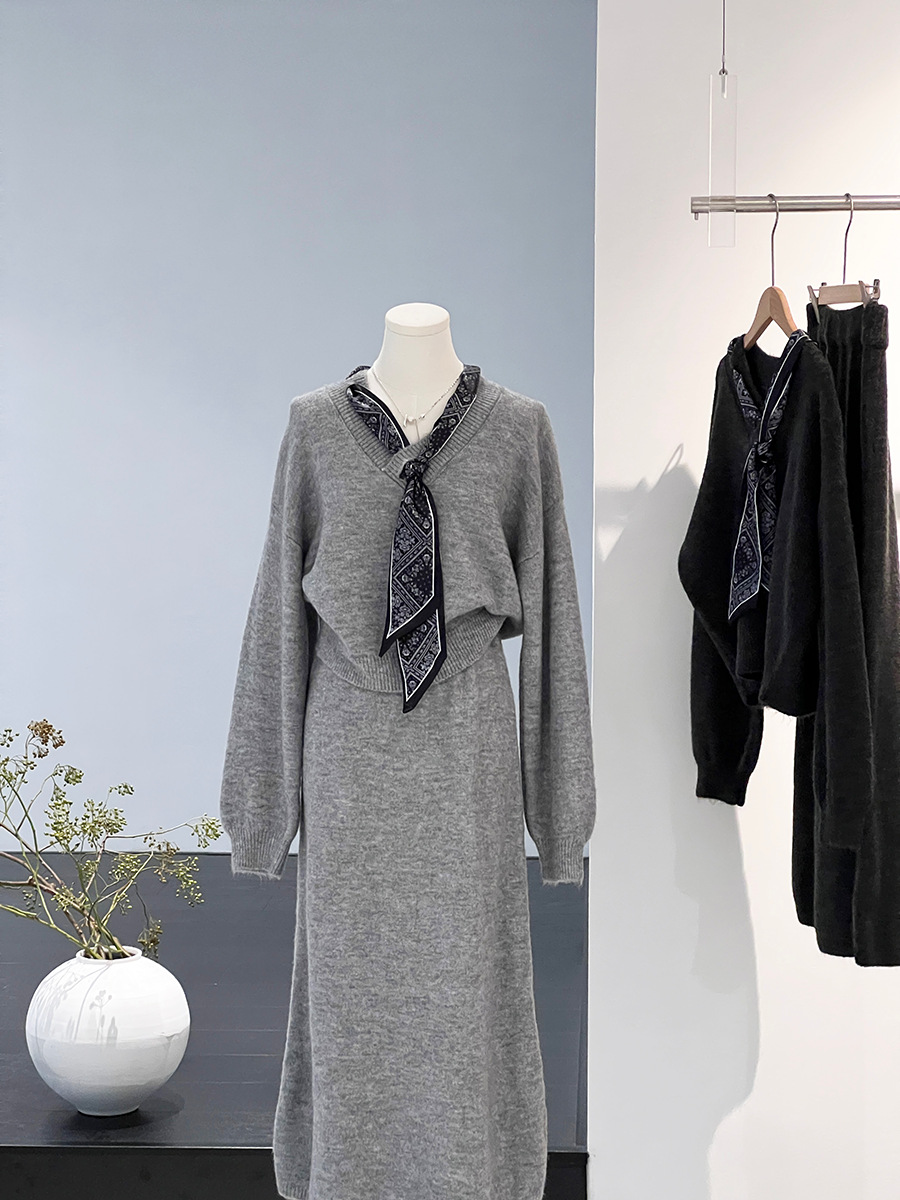 【cim823】實拍韓系軟糯短版針織毛衣+絲巾+針織長裙251030