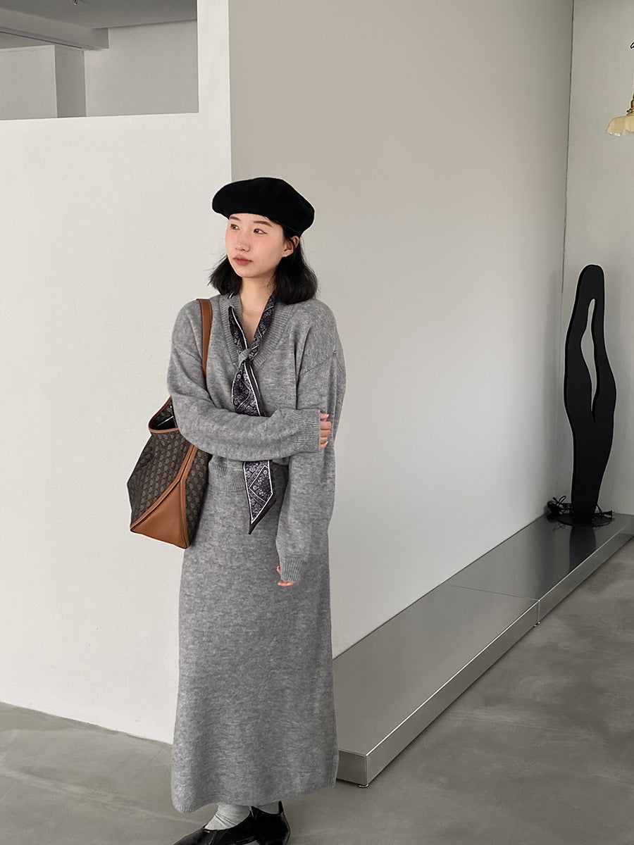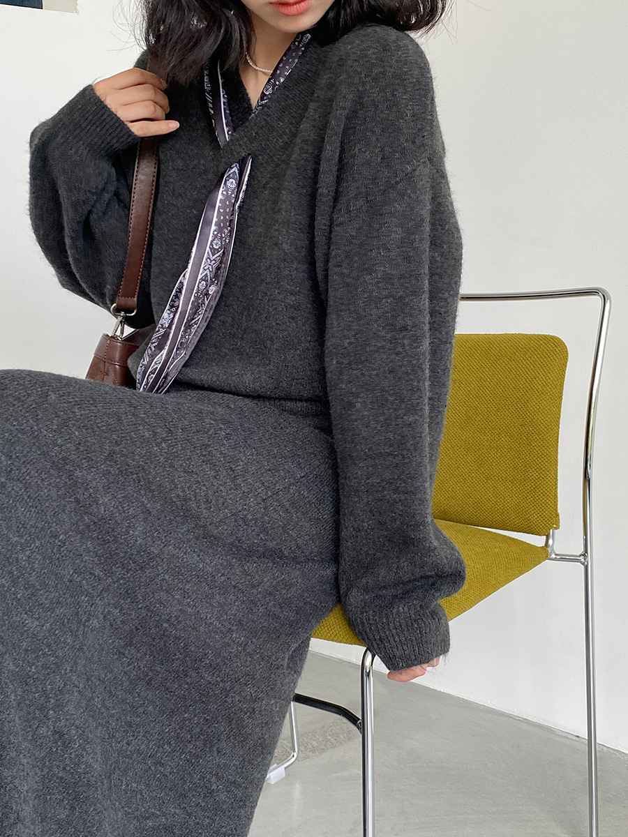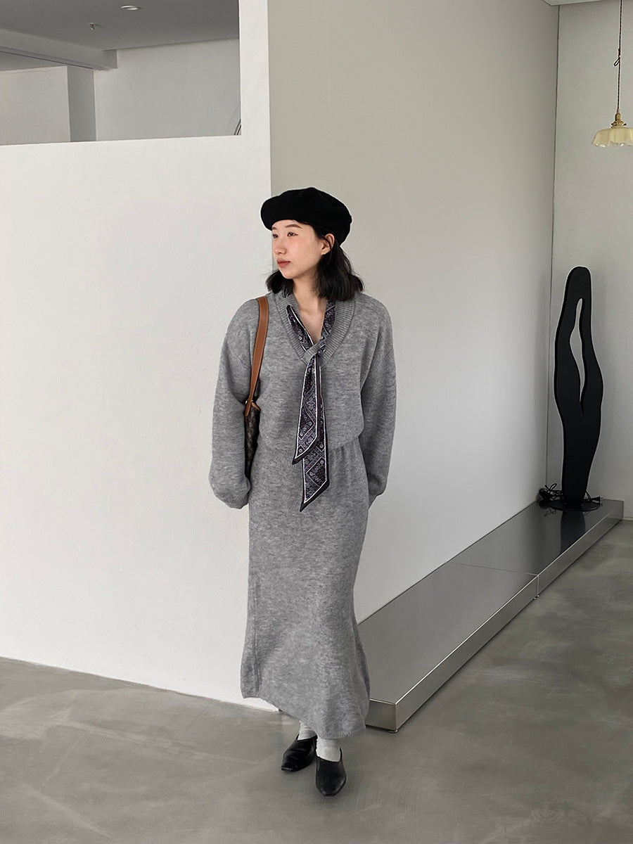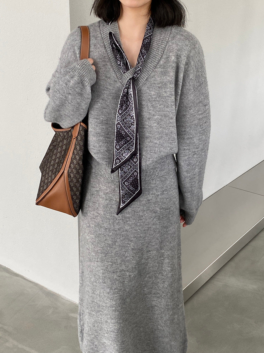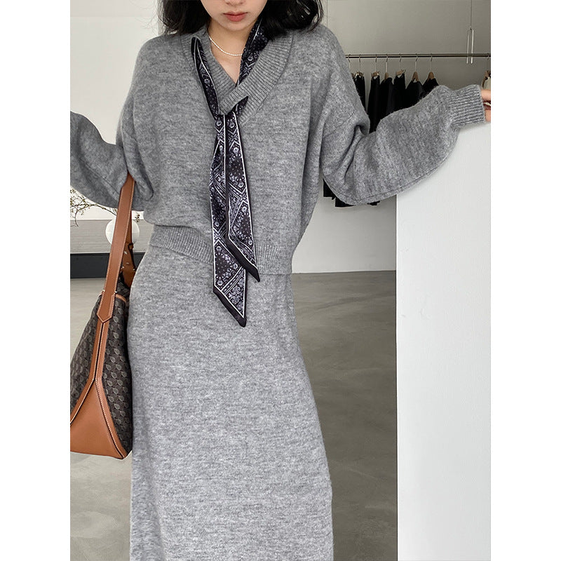 【cim823】實拍韓系軟糯短版針織毛衣+絲巾+針織長裙251030