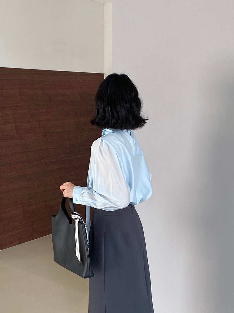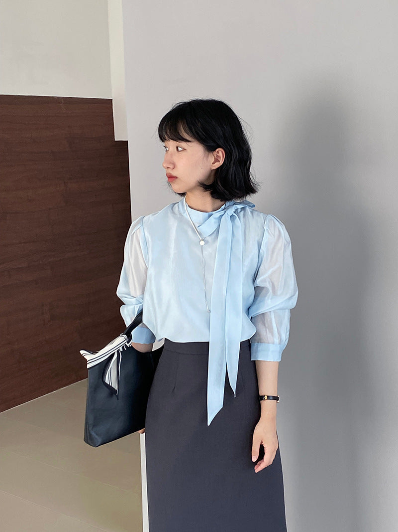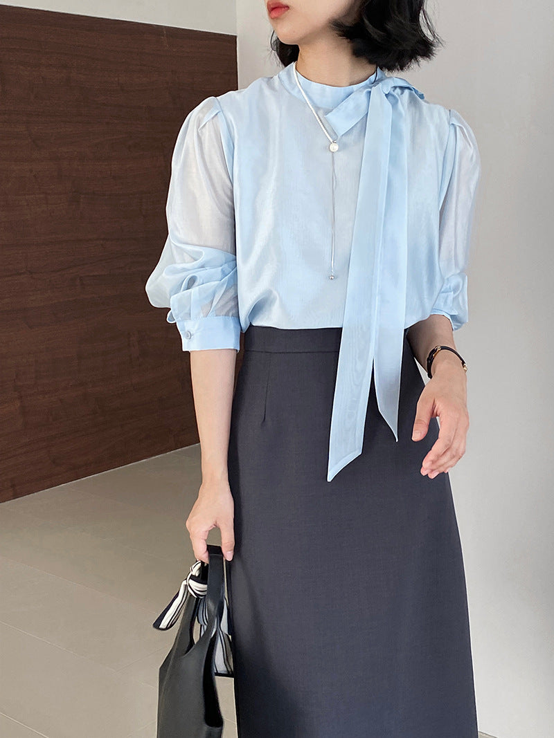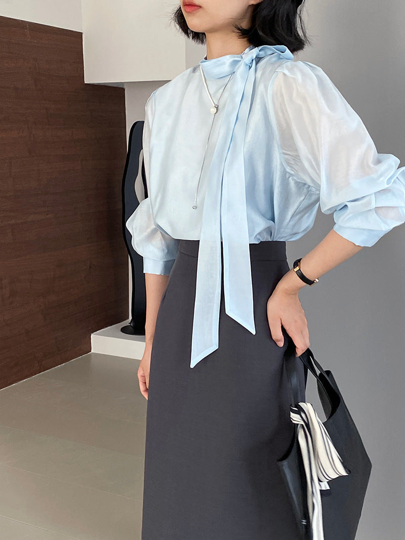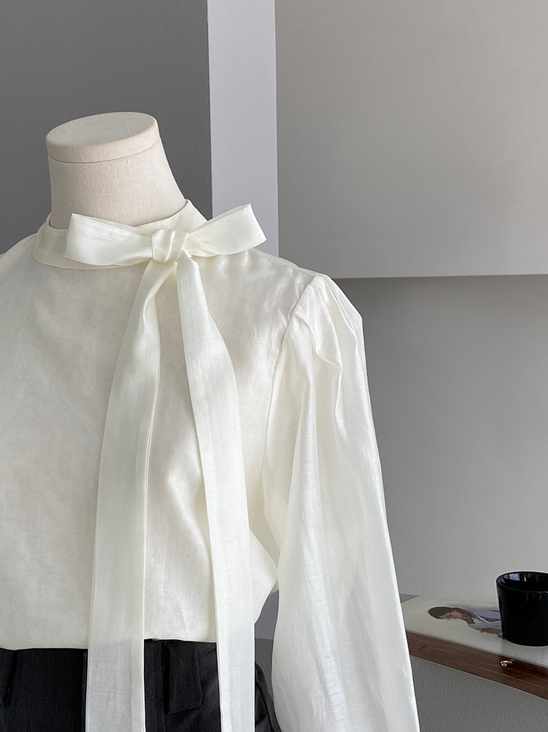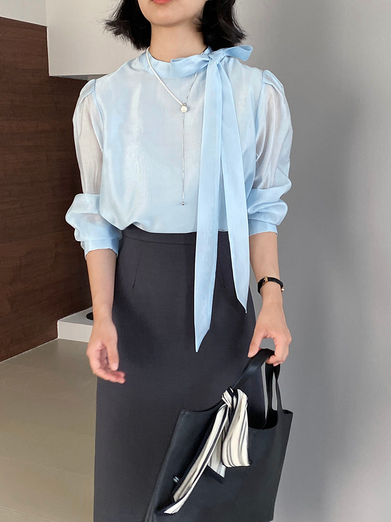 【cimz1186】韓系知性通勤🤍質感蝴蝶結飄帶天絲半高領長袖襯衫260319