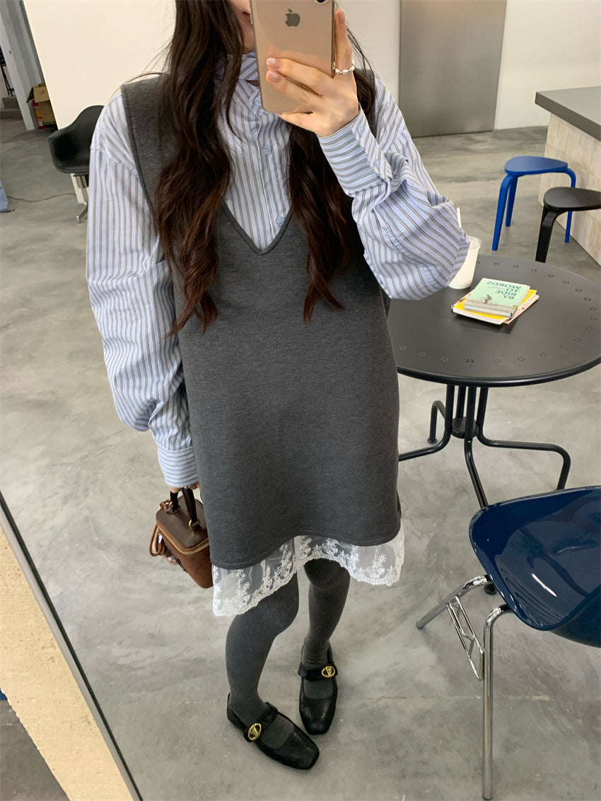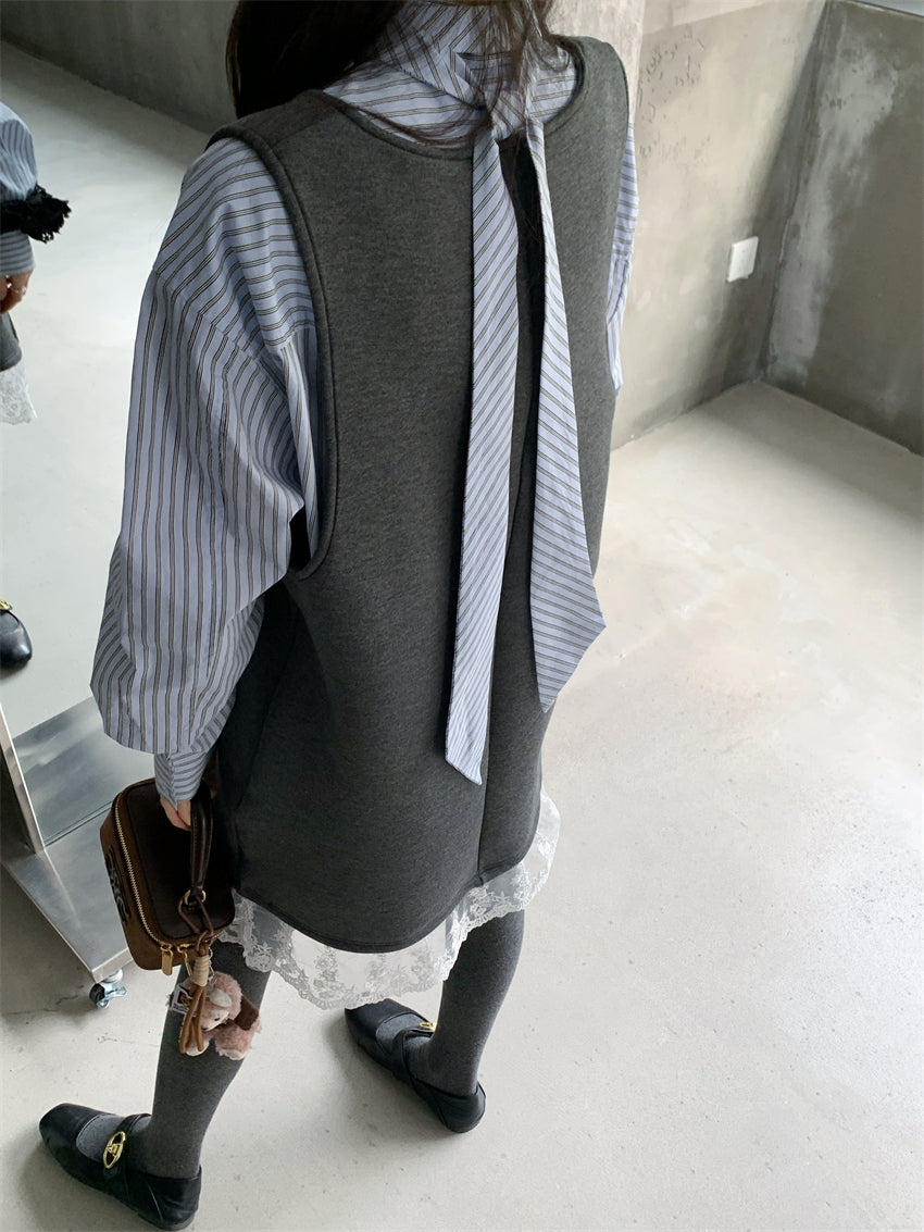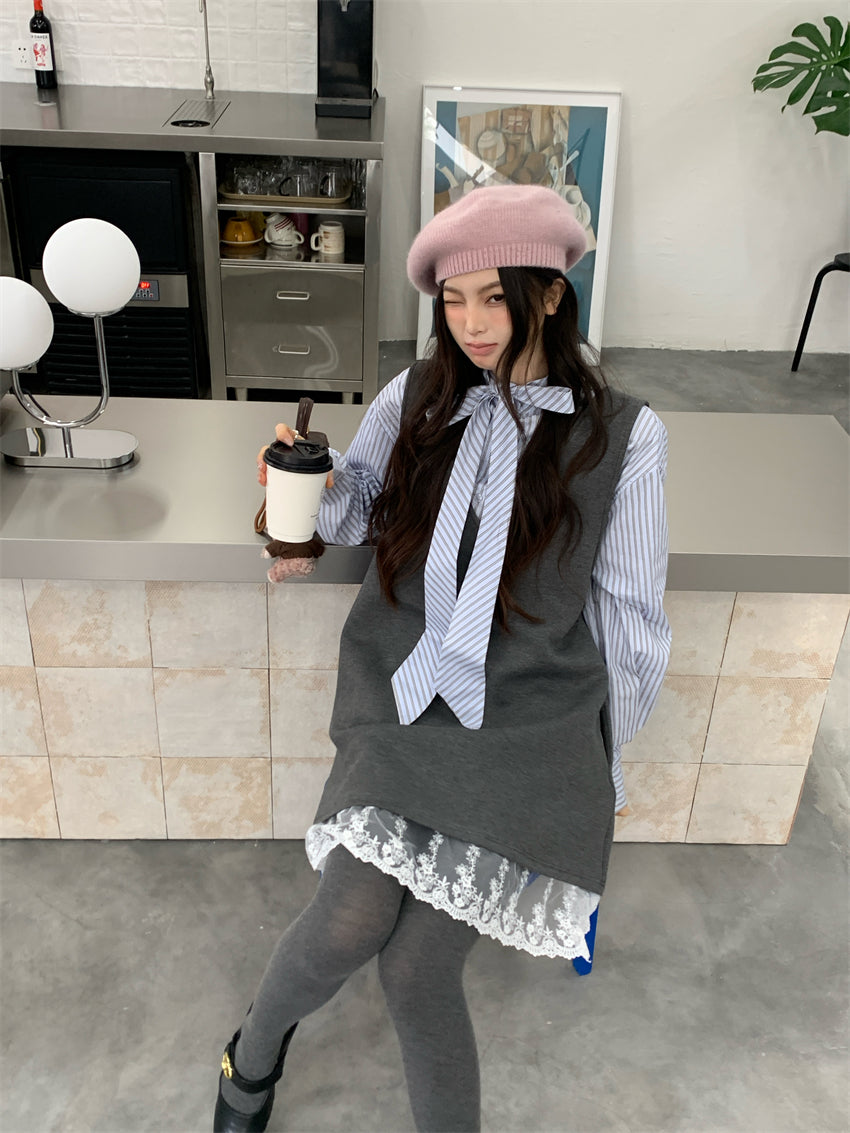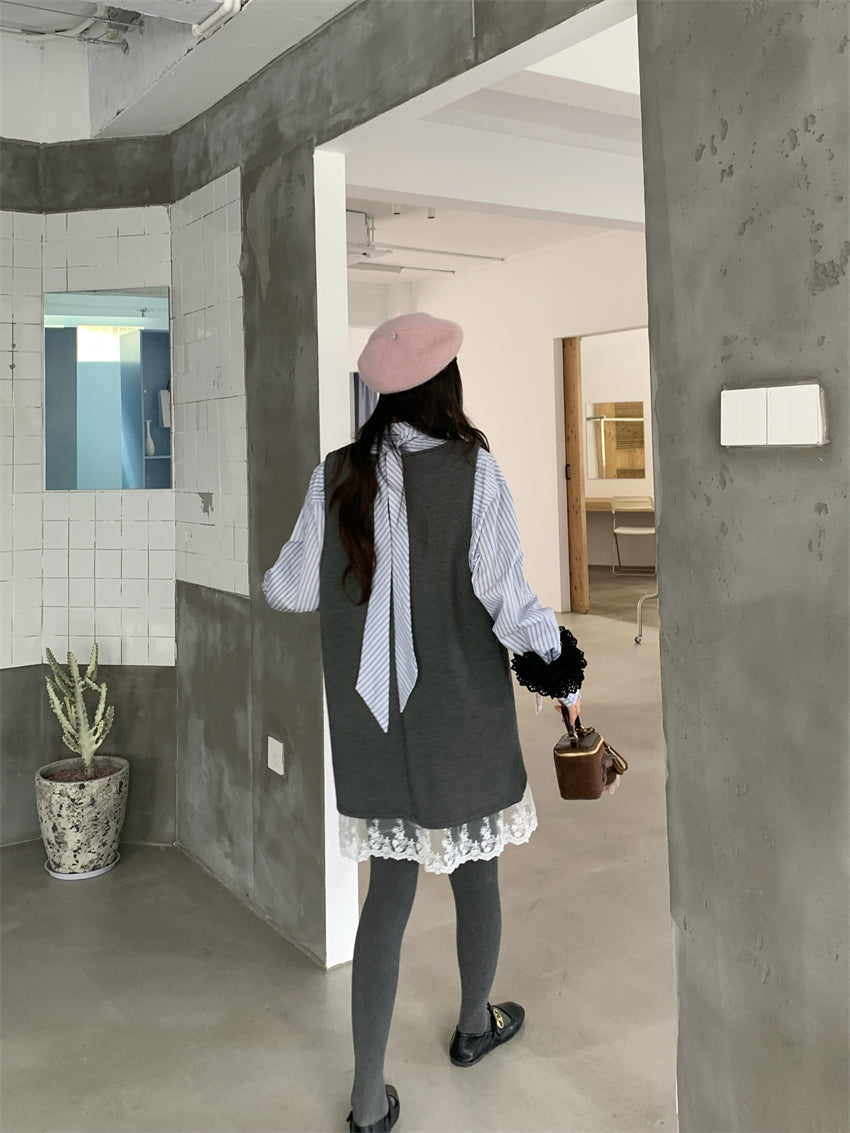 【F01131】實拍復古蕾絲拼接背心裙+純棉領結襯衫(分開下單)250106