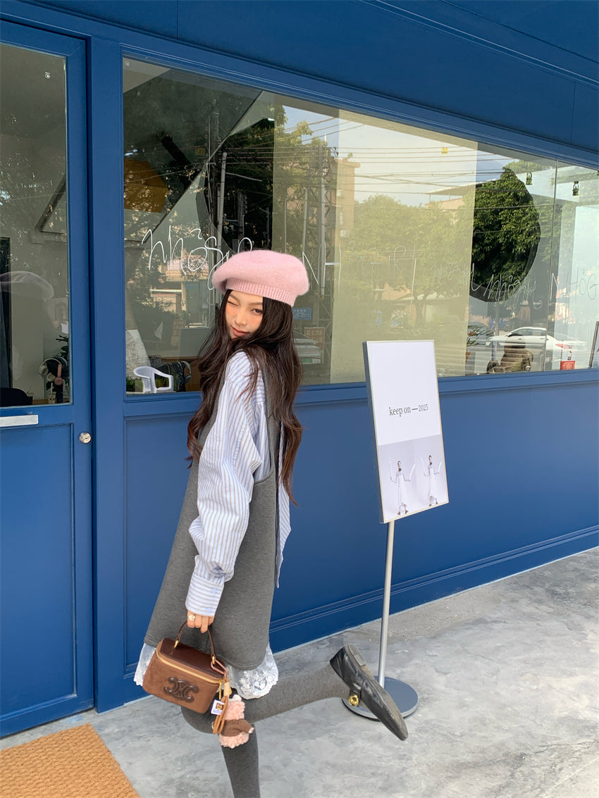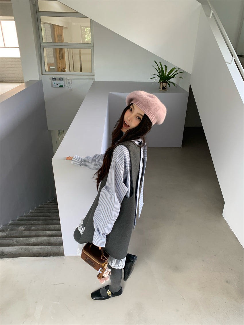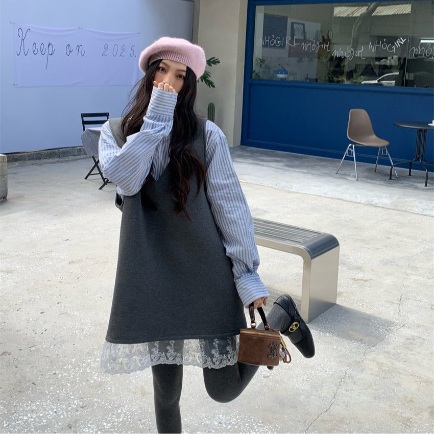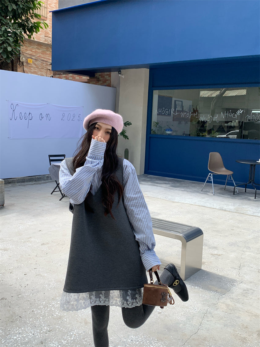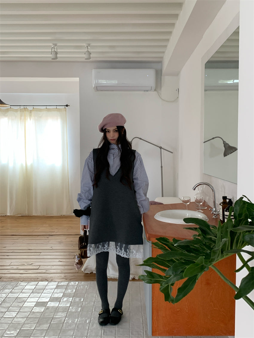 【F01131】實拍復古蕾絲拼接背心裙+純棉領結襯衫(分開下單)250106