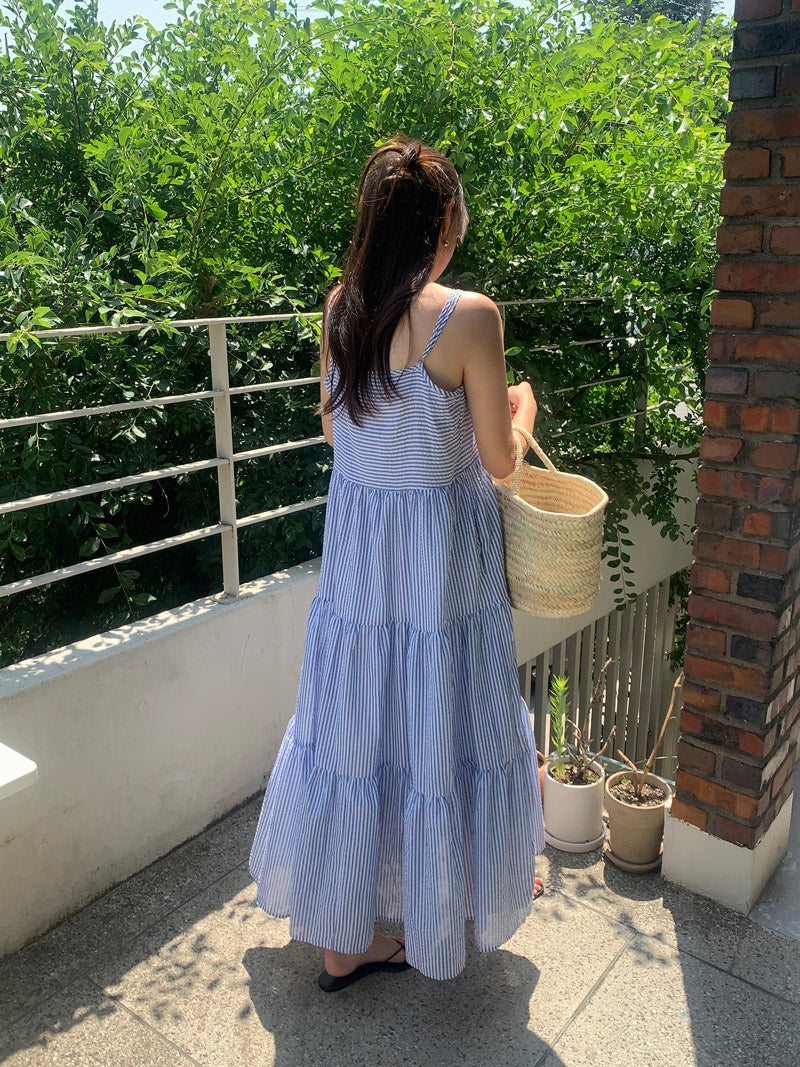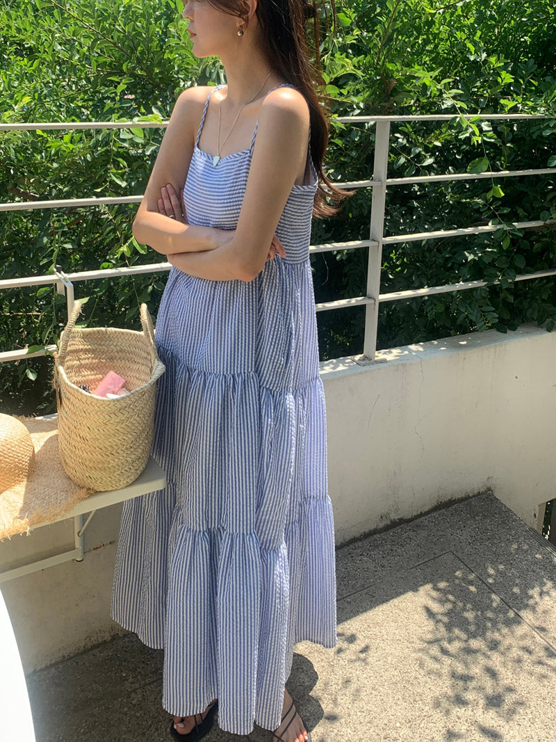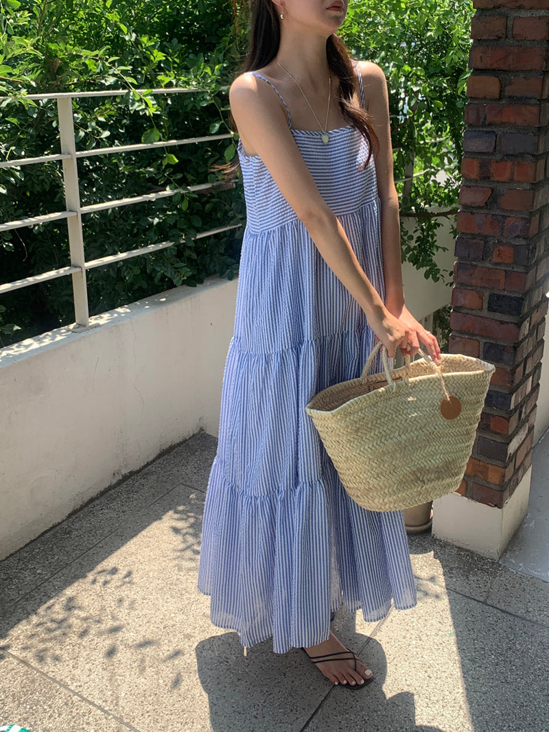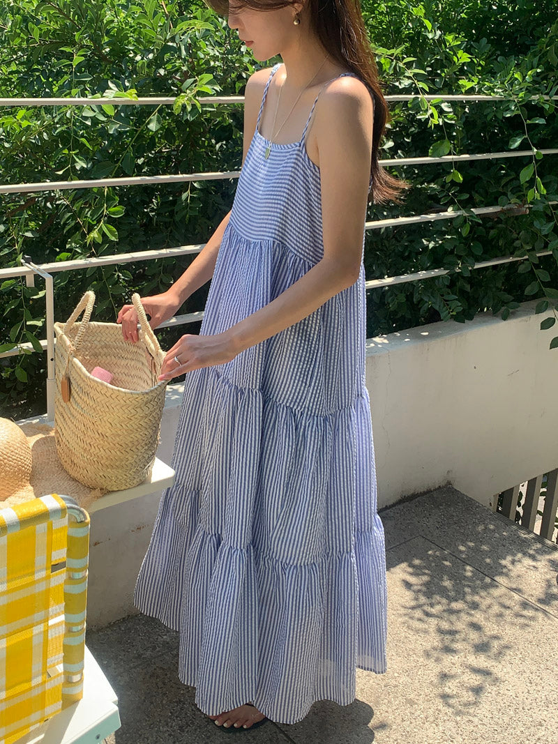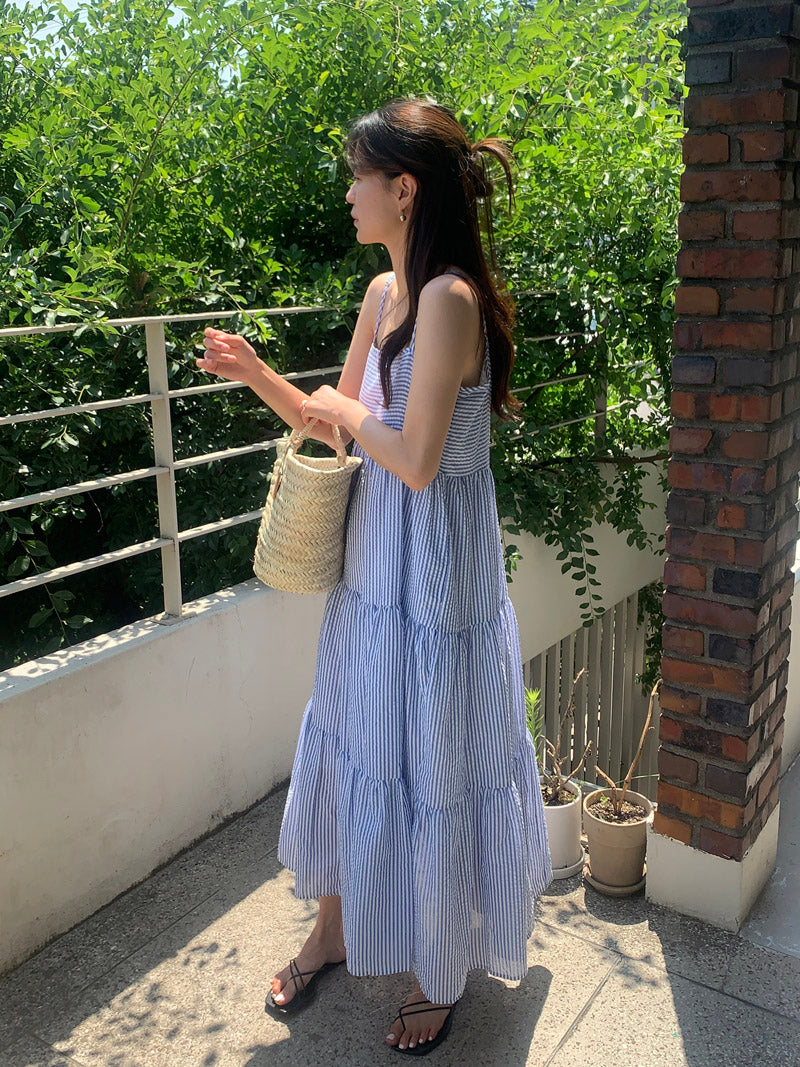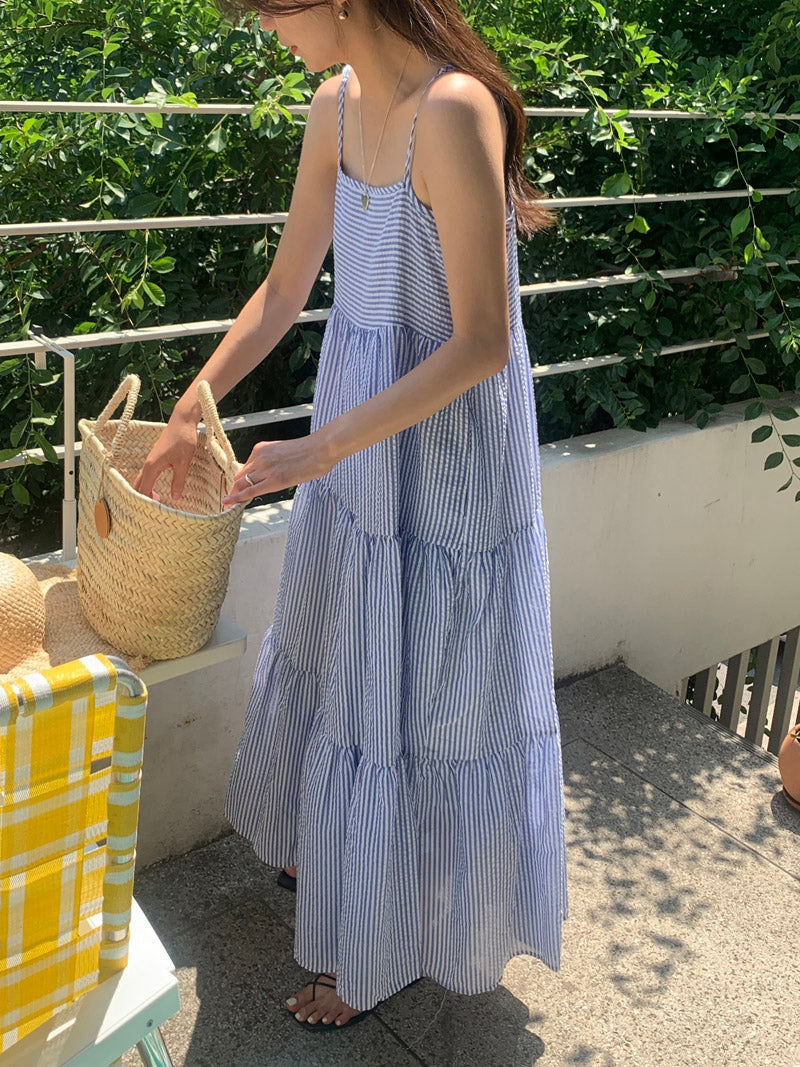 【F032264】韓國夏季度假寬鬆吊帶條紋洋裝250311