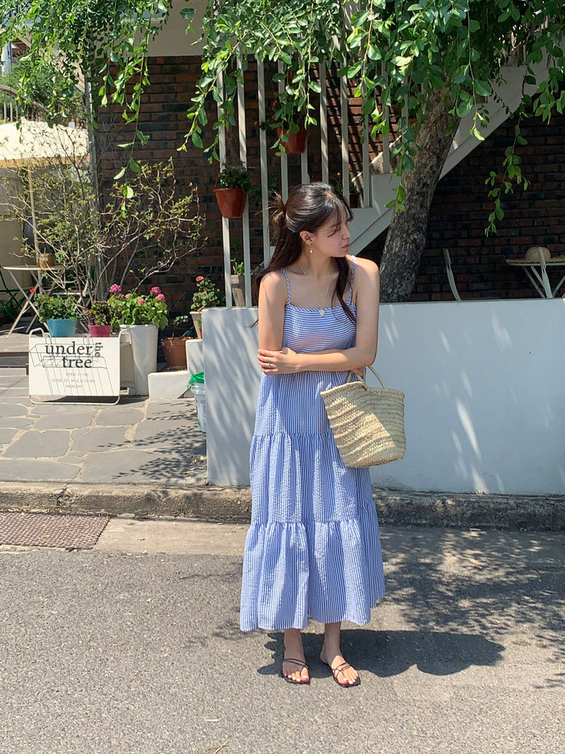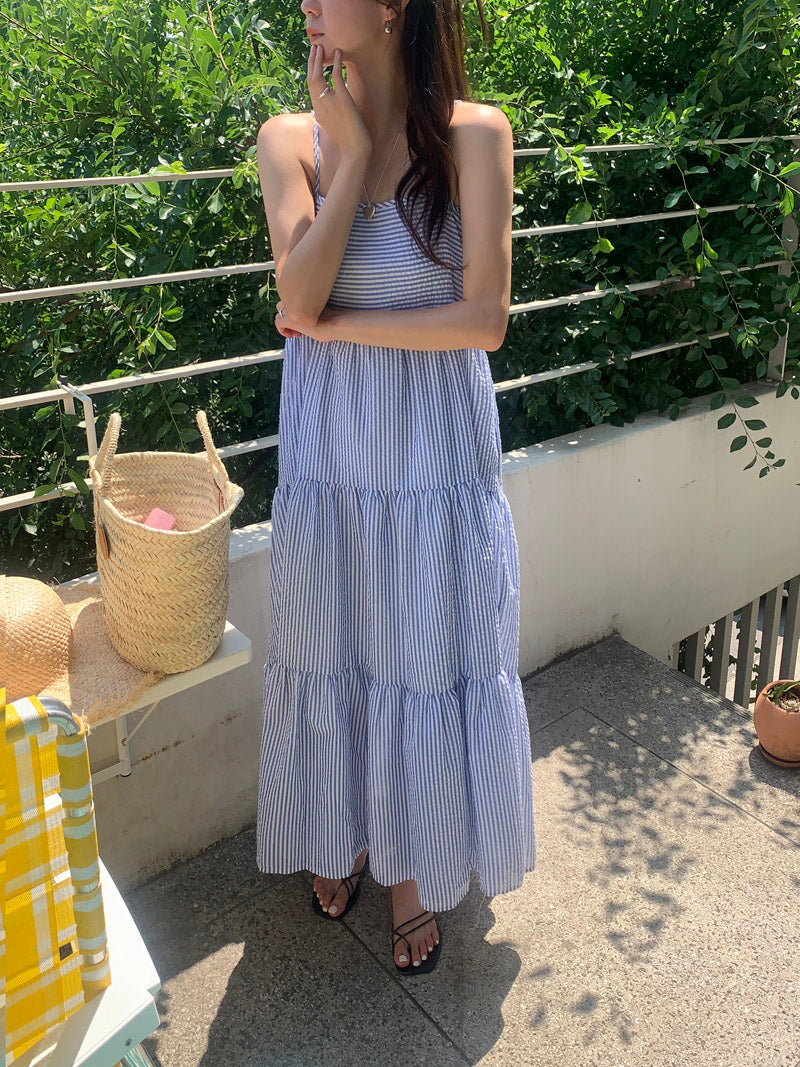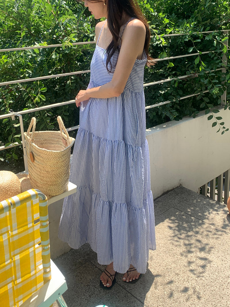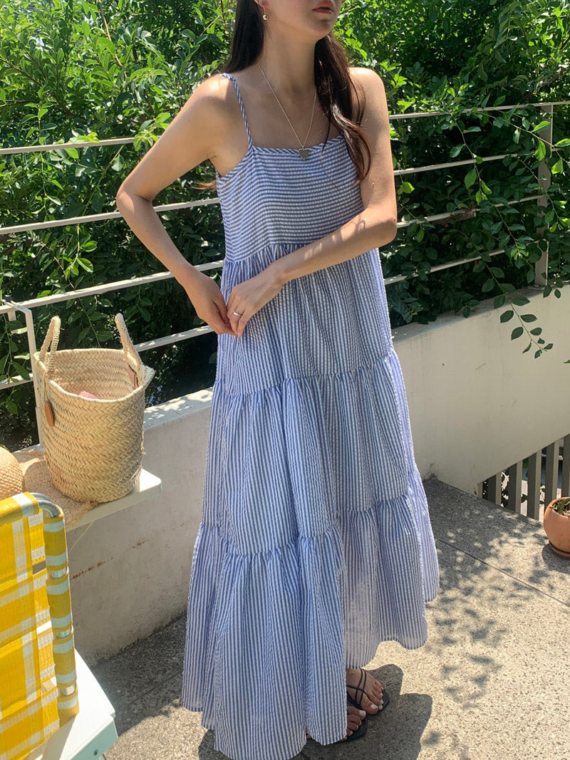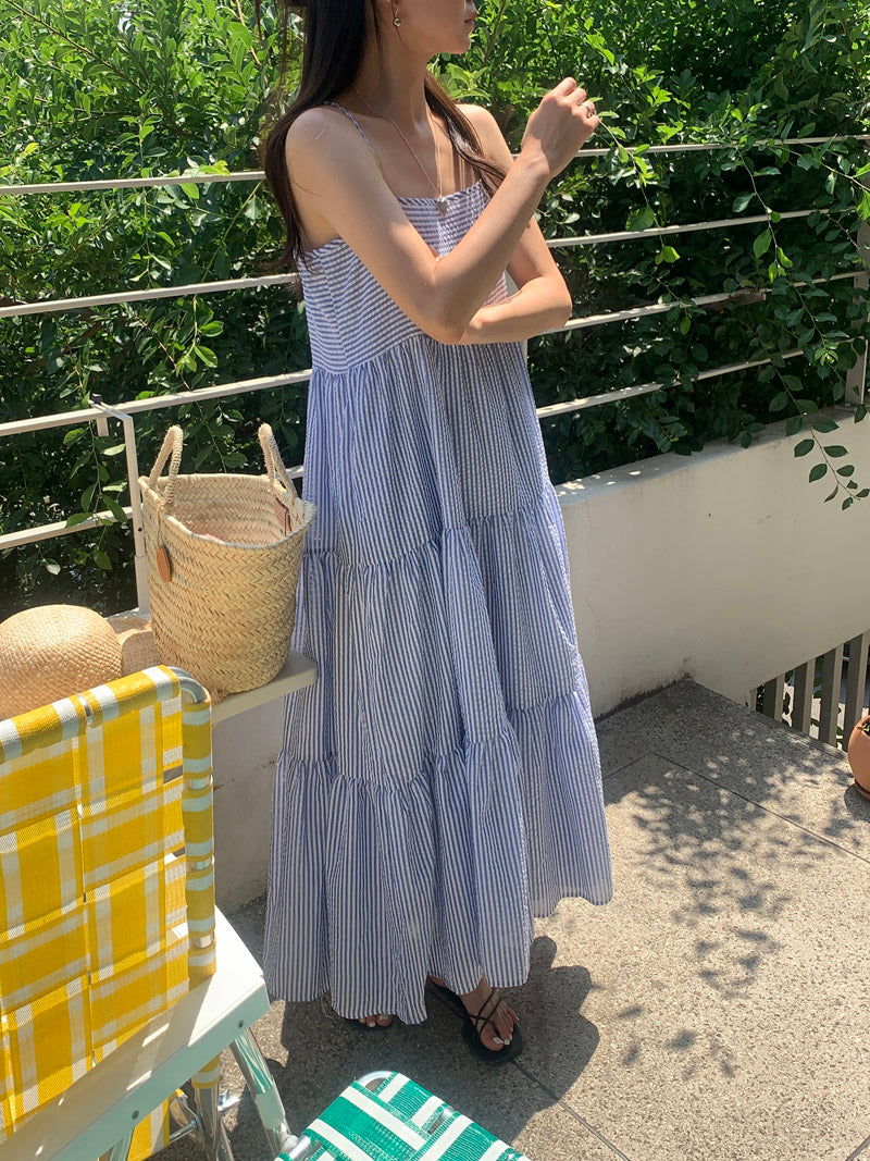 【F032264】韓國夏季度假寬鬆吊帶條紋洋裝250311