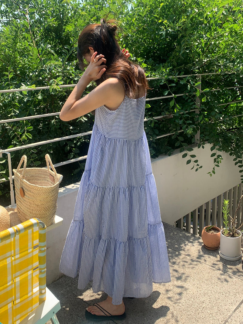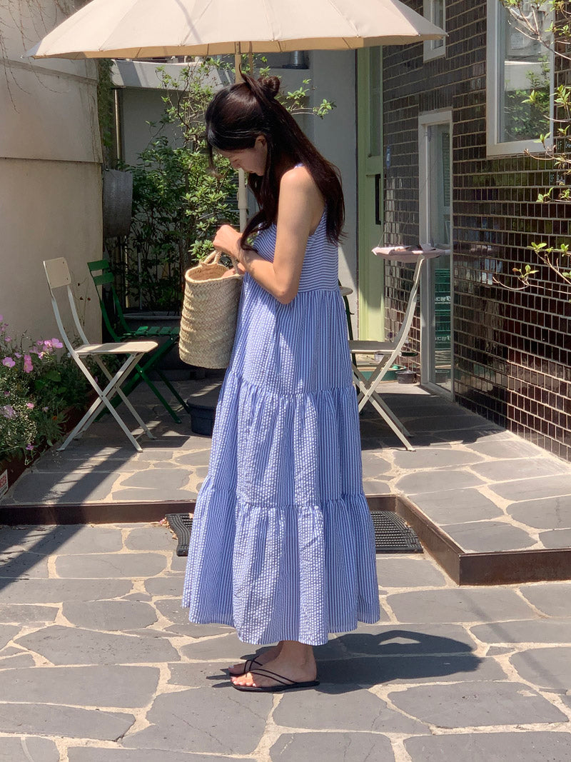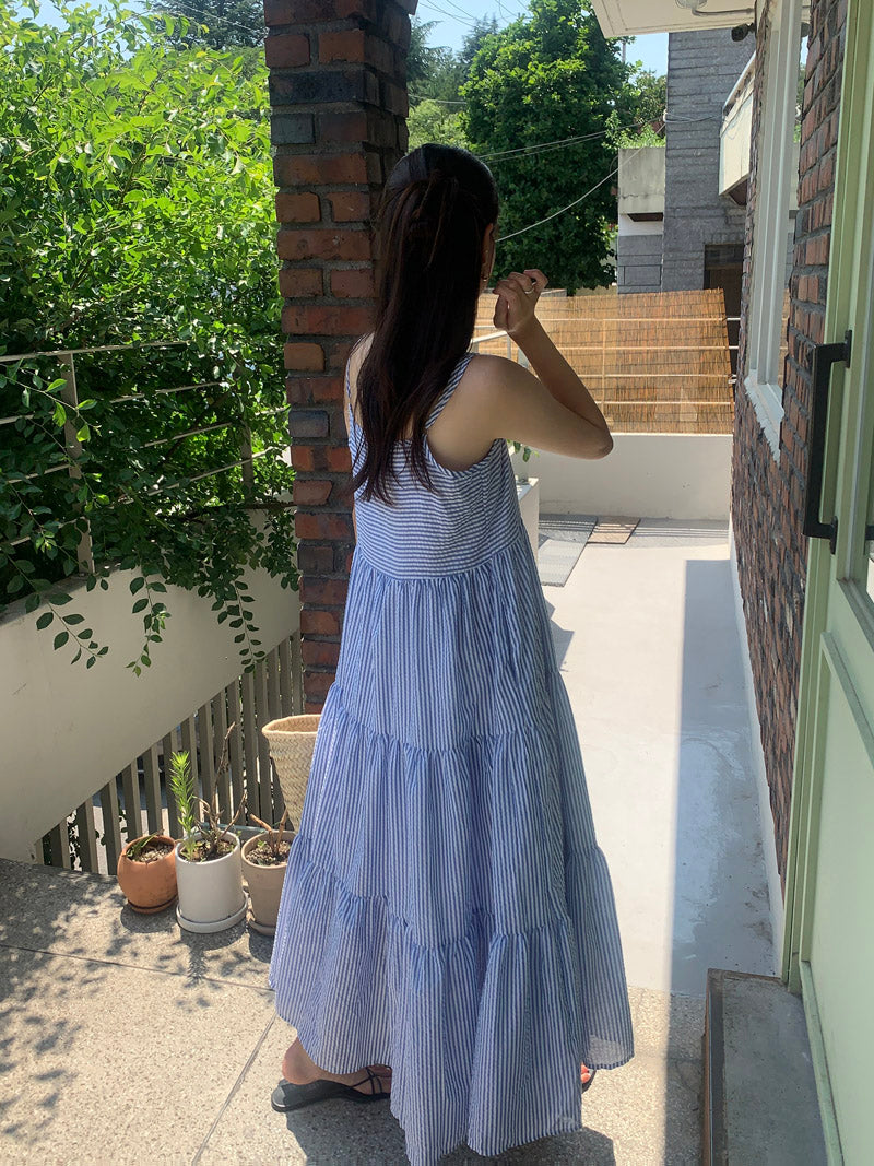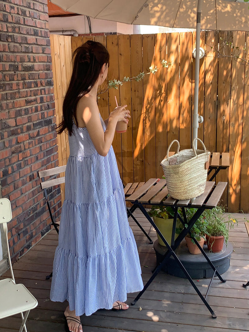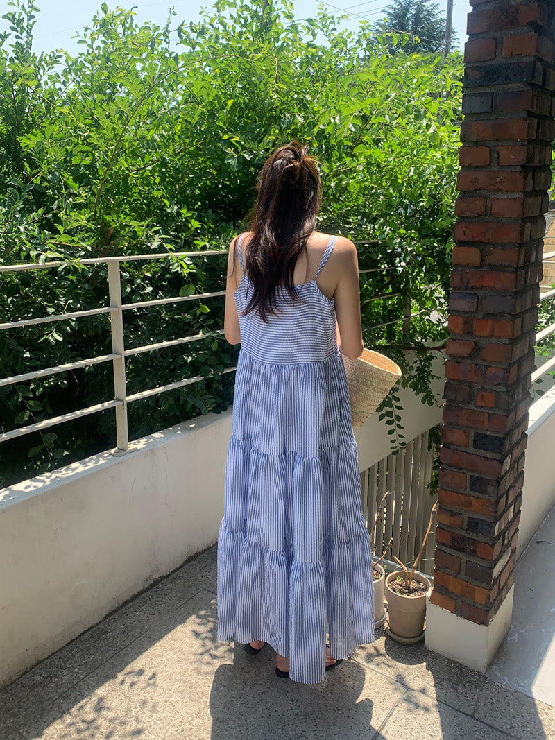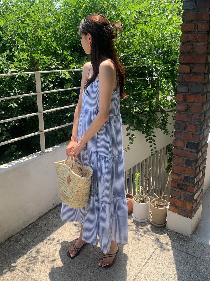 【F032264】韓國夏季度假寬鬆吊帶條紋洋裝250311