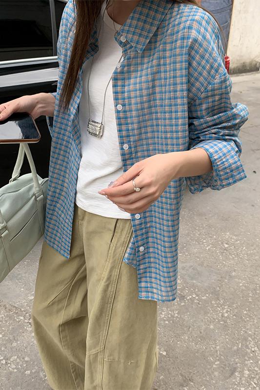 【F032269】實拍S~XL早春簡約清新藍格子襯衫250311