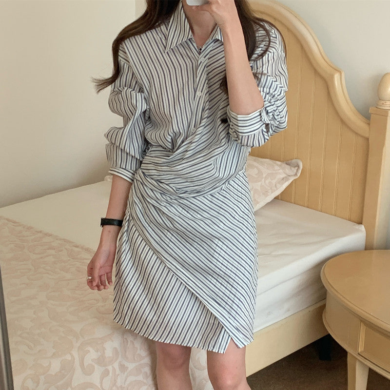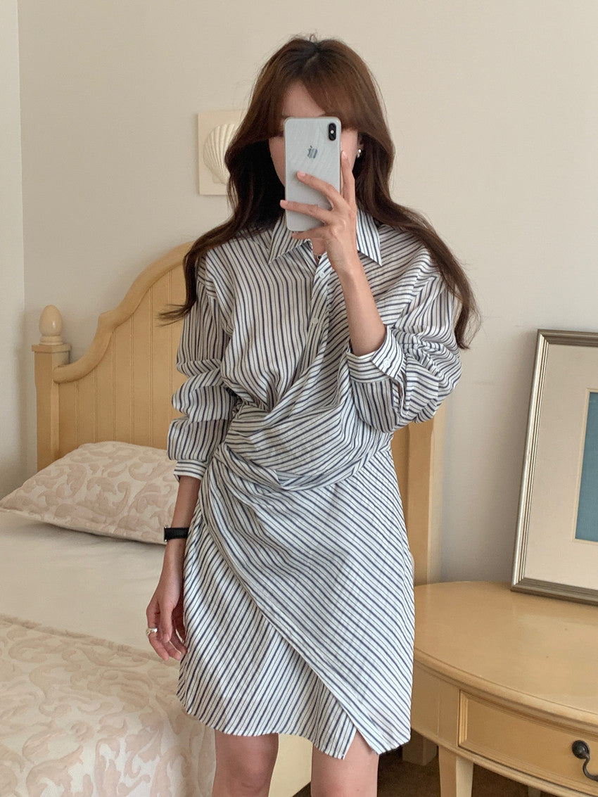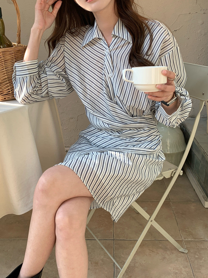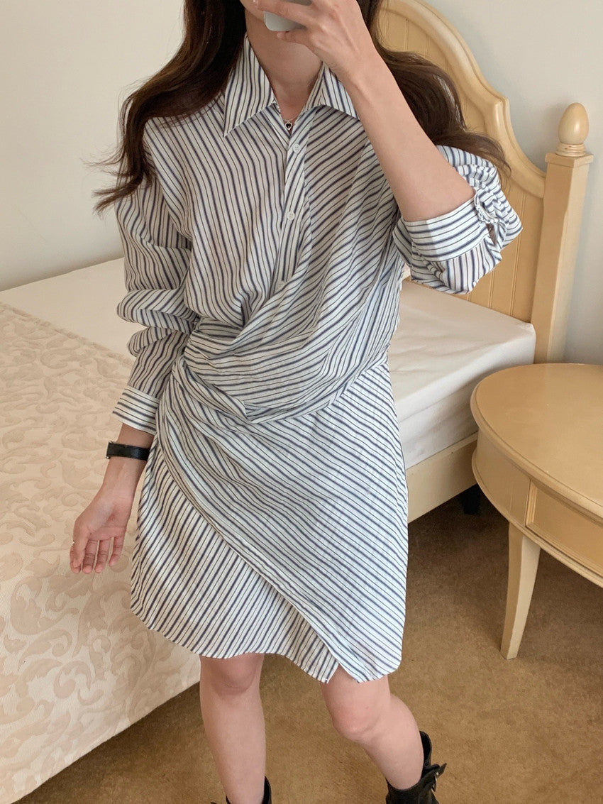 【F032282】實拍復古小眾不規則綁帶收腰條紋洋裝250311