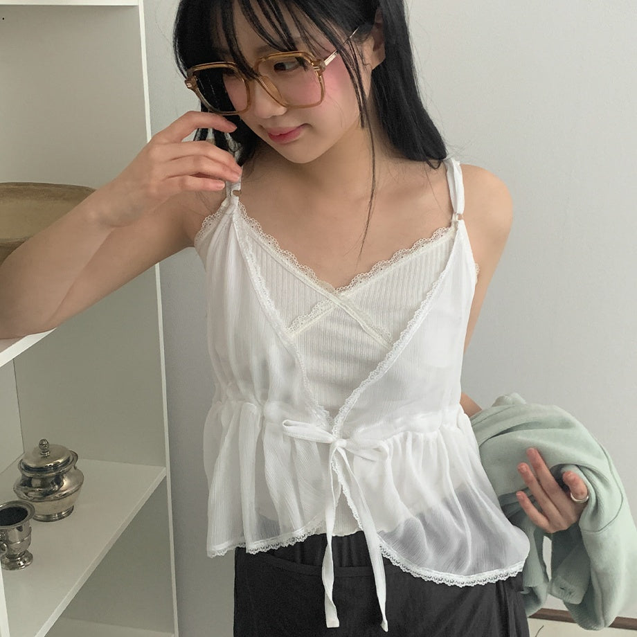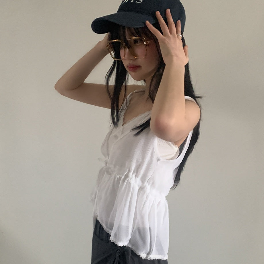 【F032283】韓國清新蕾絲花邊抽繩疊穿雪紡小背心罩衫250311