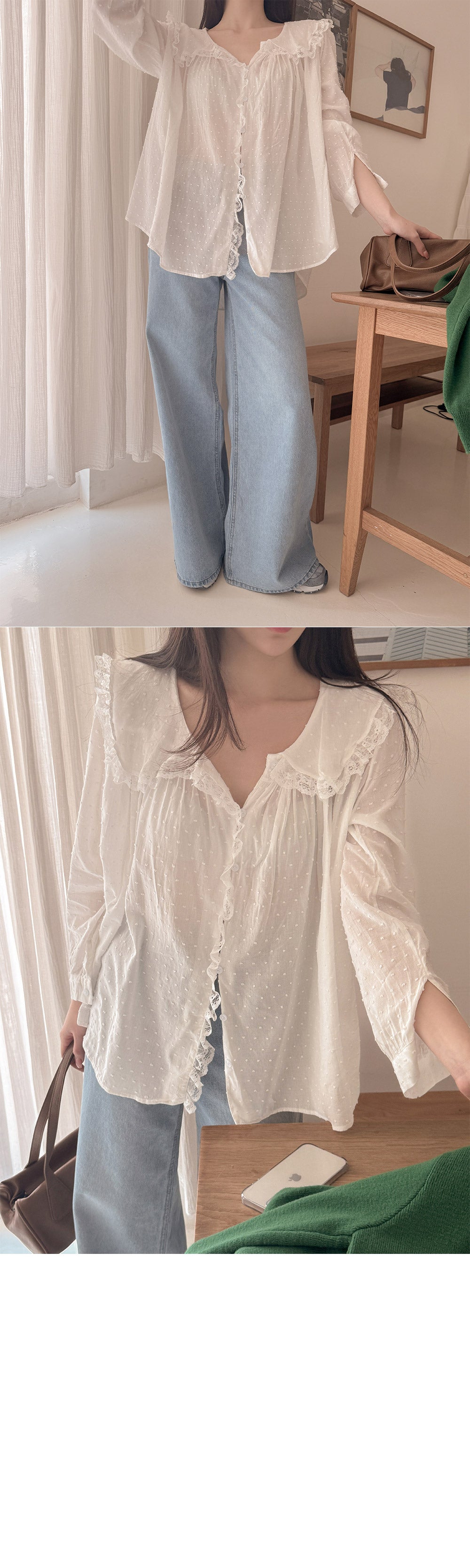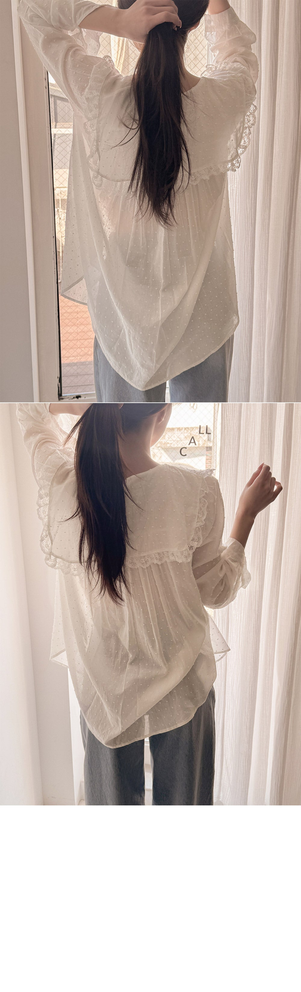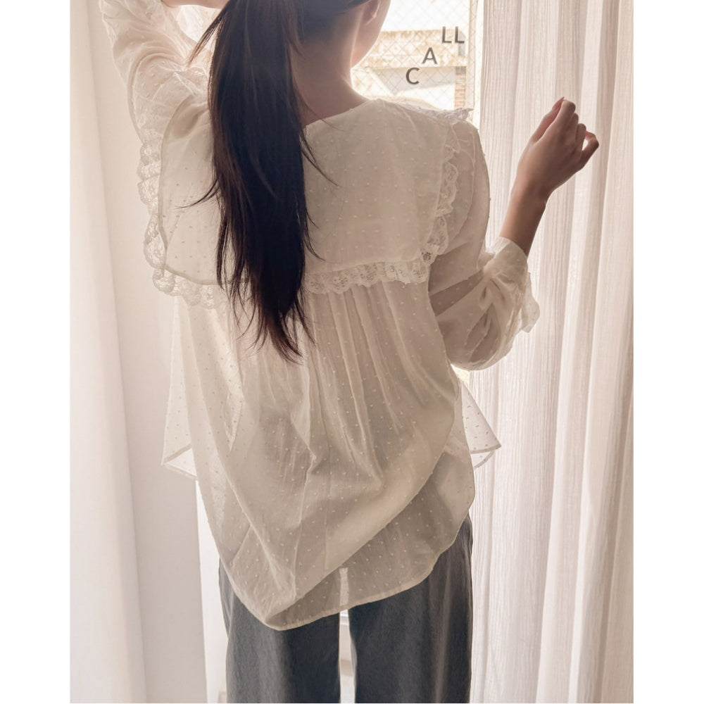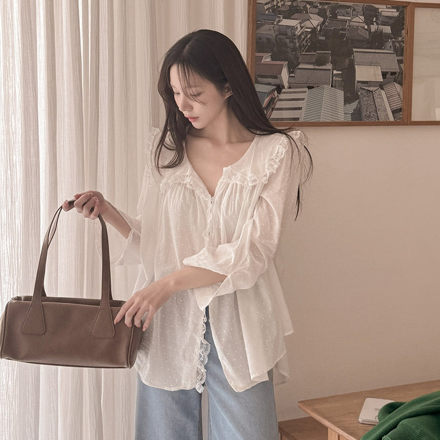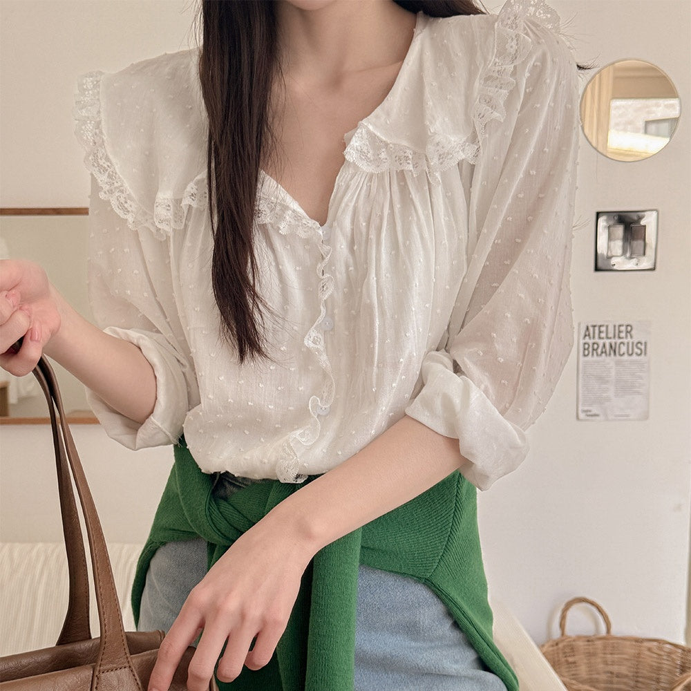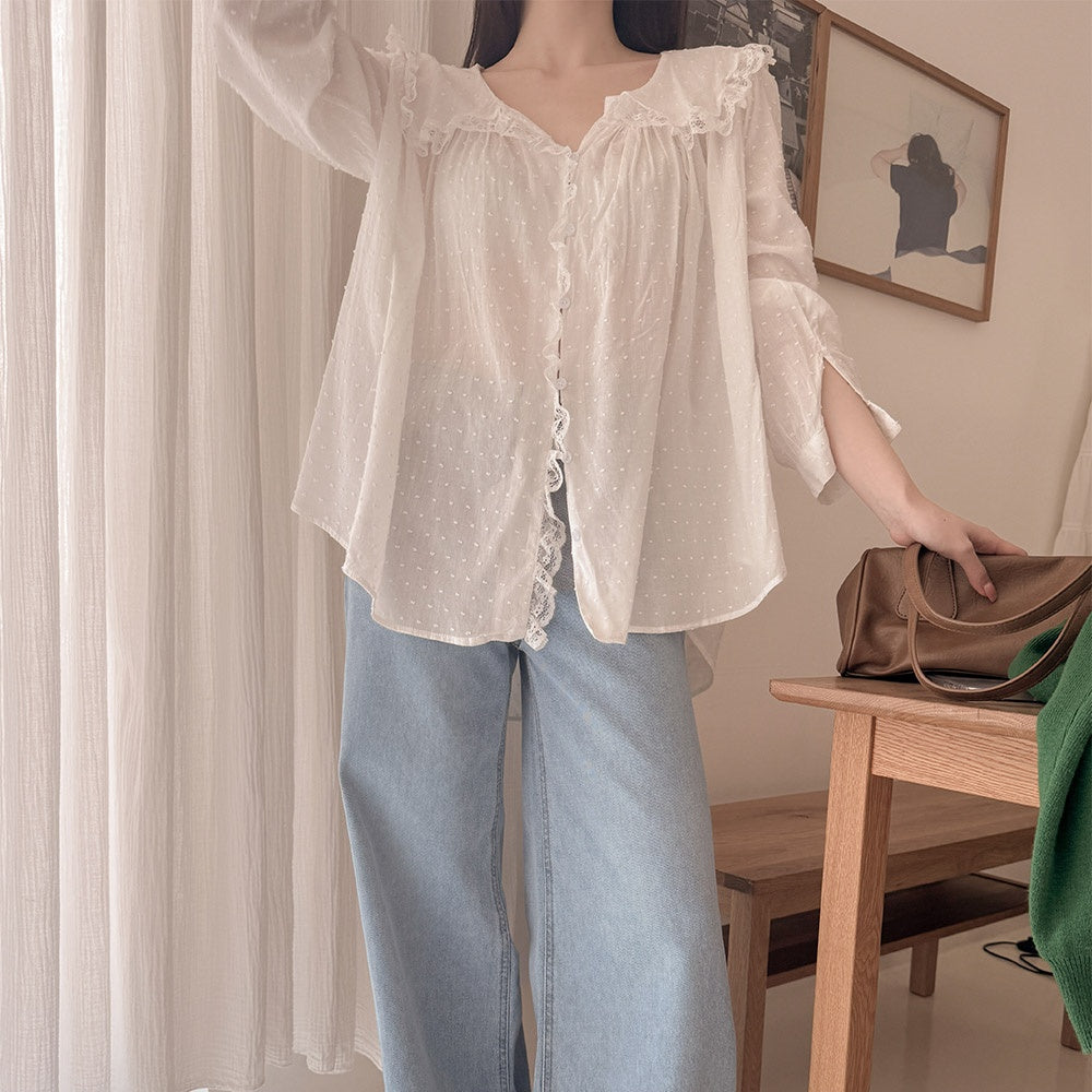 【F032284】韓國温柔浪漫蕾絲點點長袖雪紡衫250311