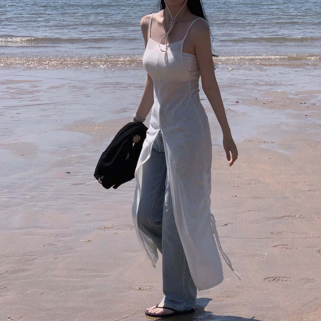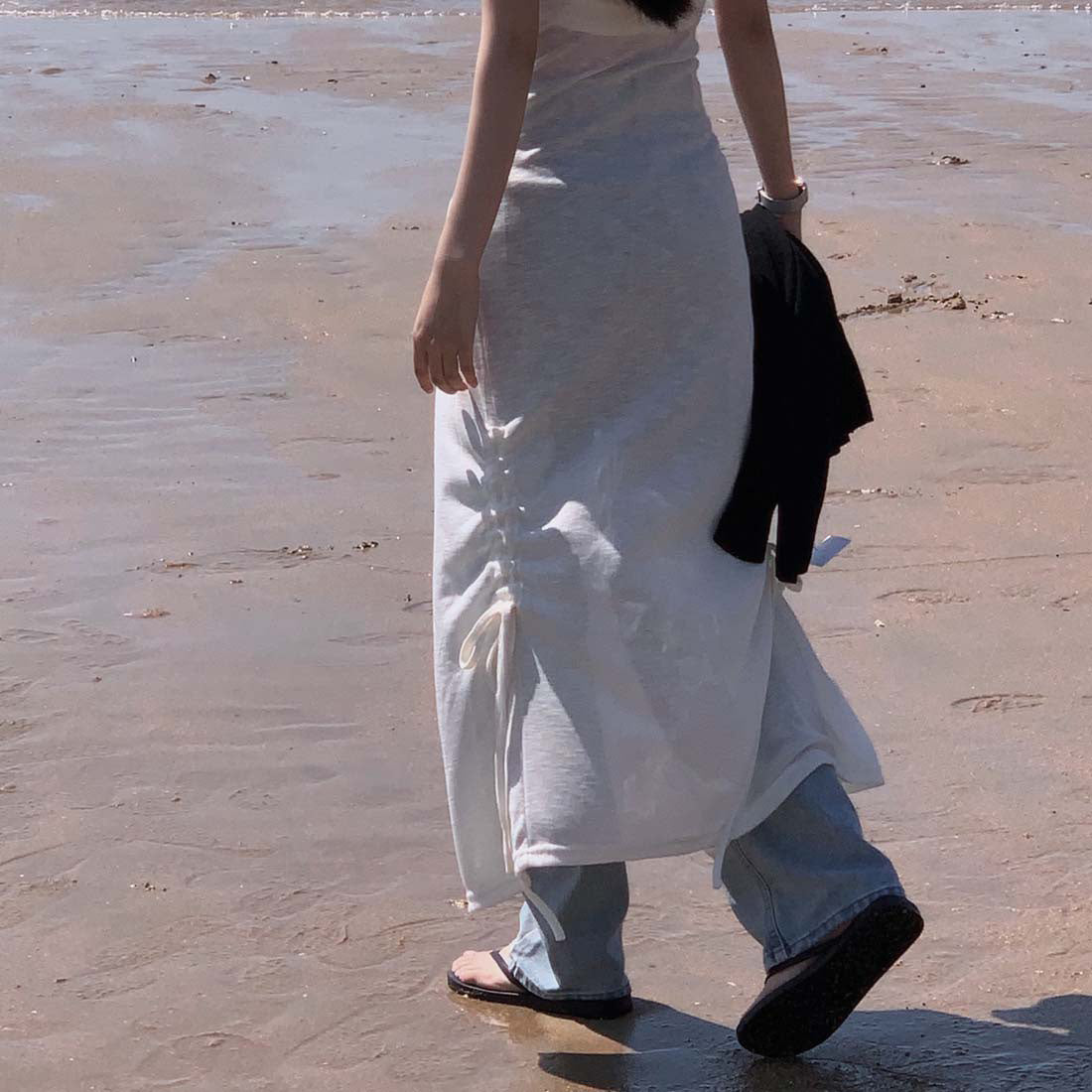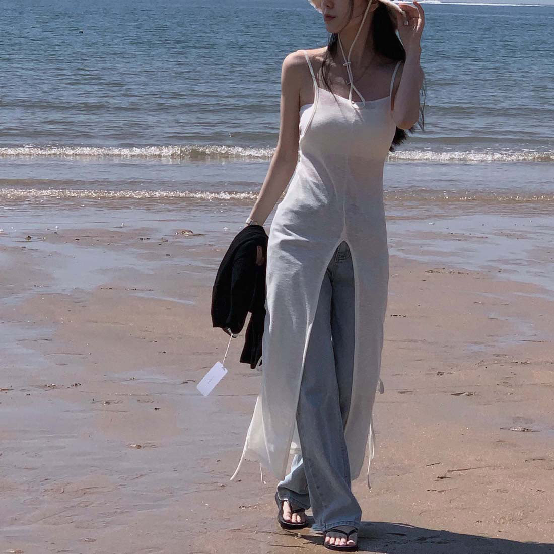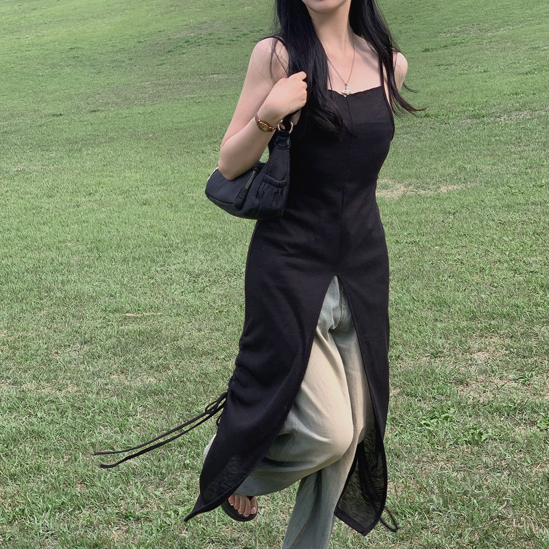【F032288】韓國ins法式氣質開叉設計針織抽繩長吊帶洋裝250311