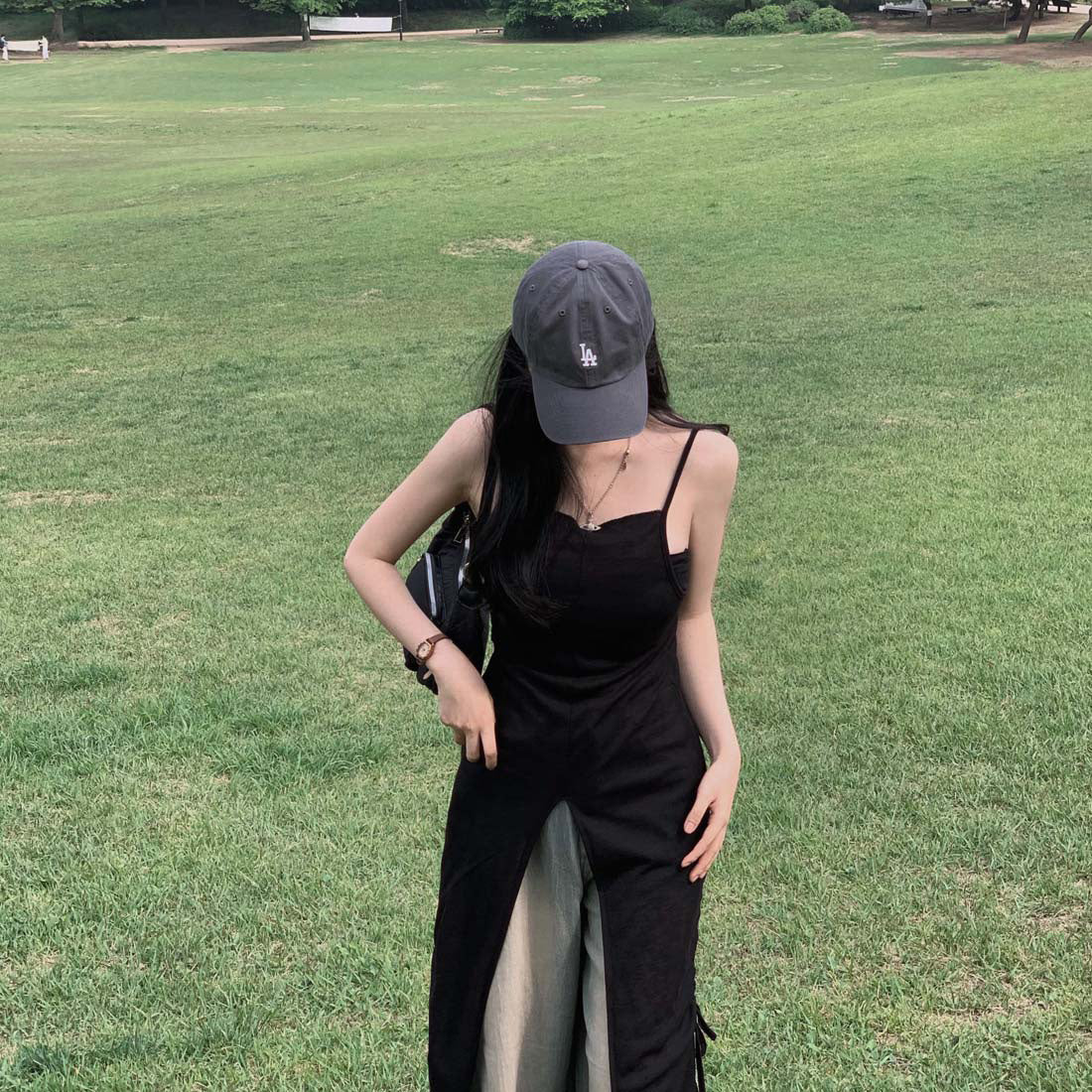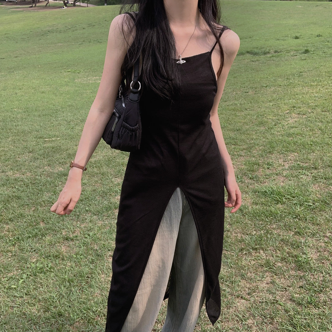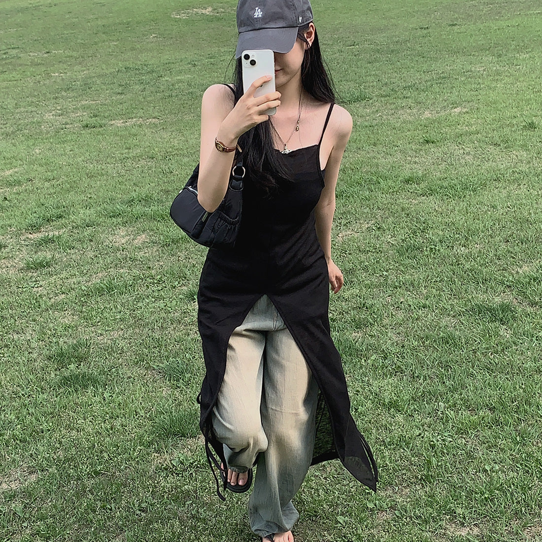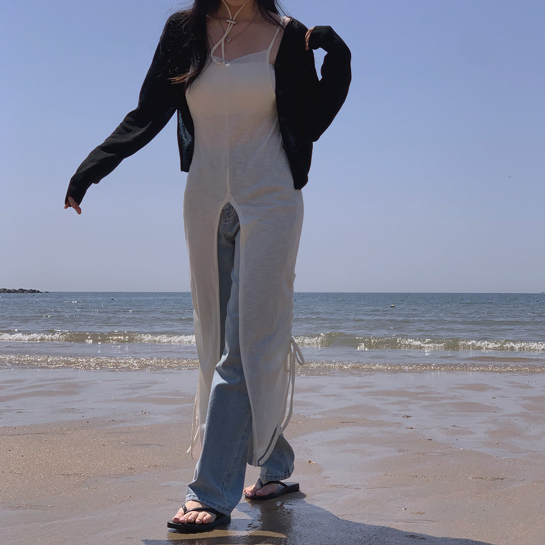 【F032288】韓國ins法式氣質開叉設計針織抽繩長吊帶洋裝250311