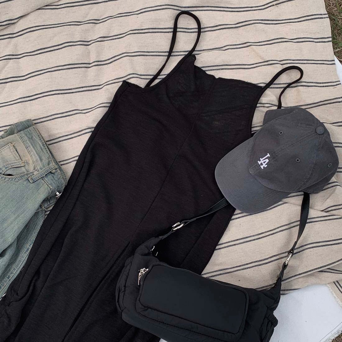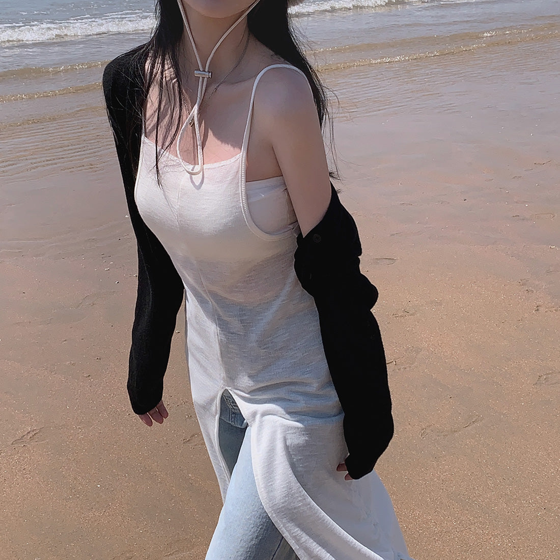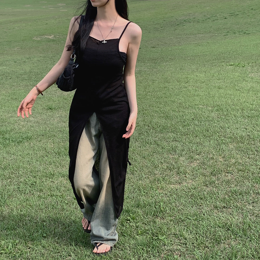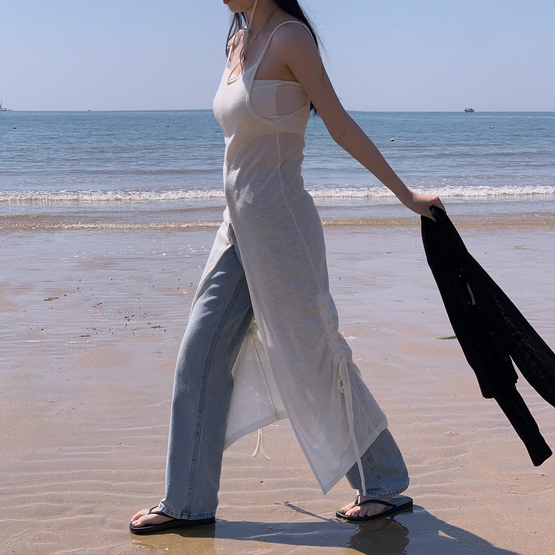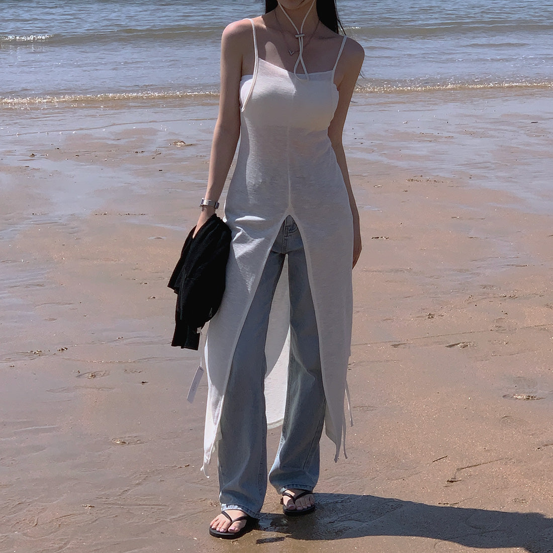 【F032288】韓國ins法式氣質開叉設計針織抽繩長吊帶洋裝250311