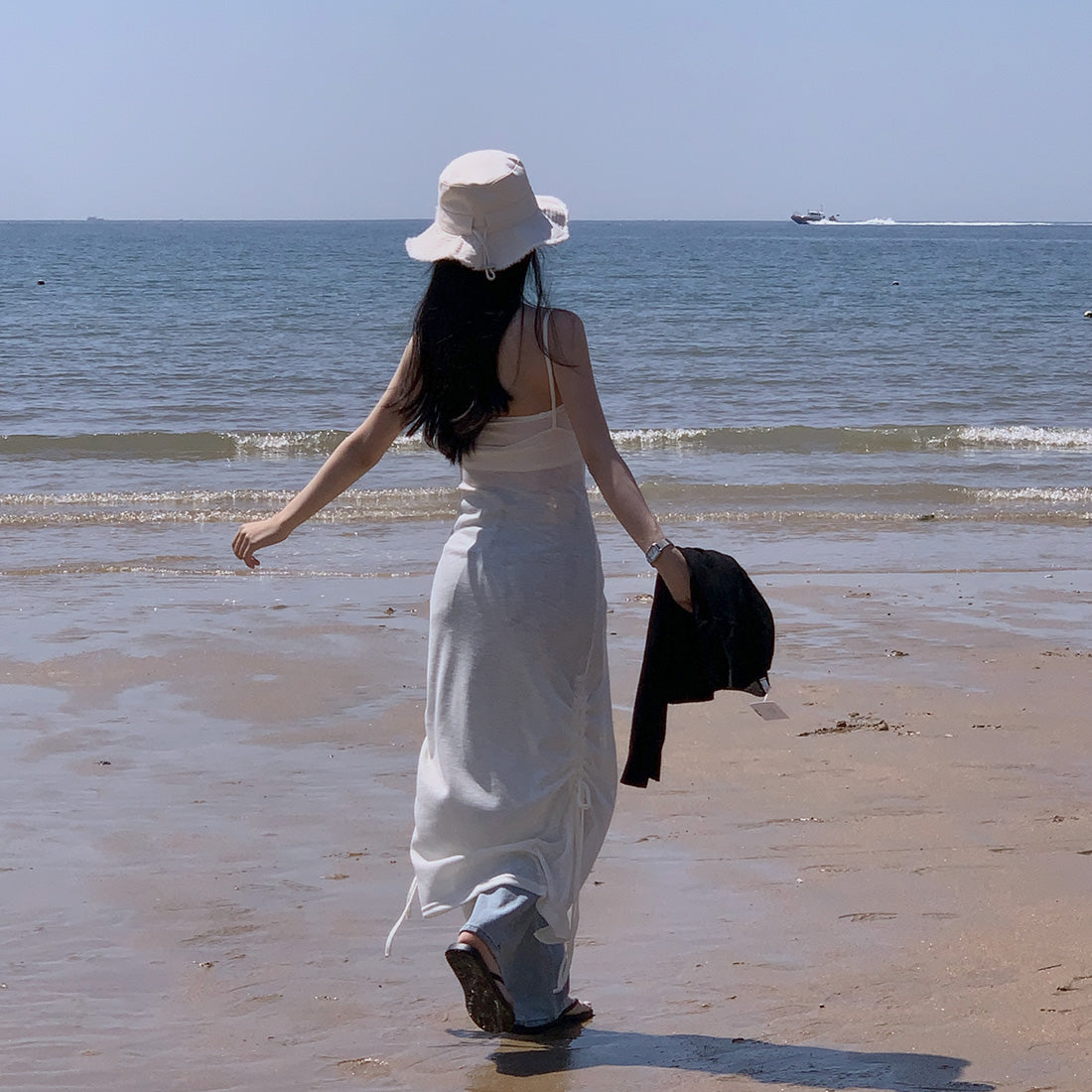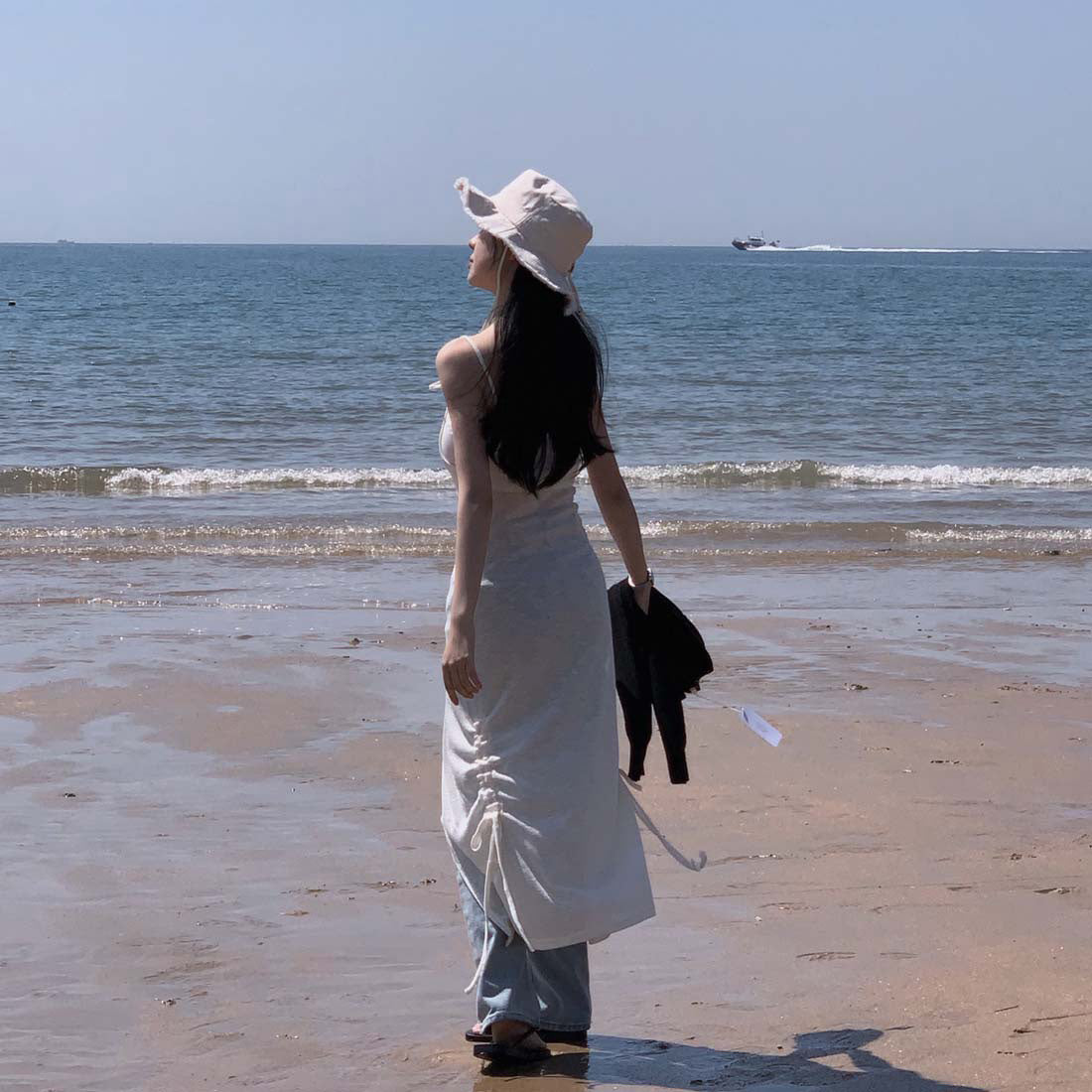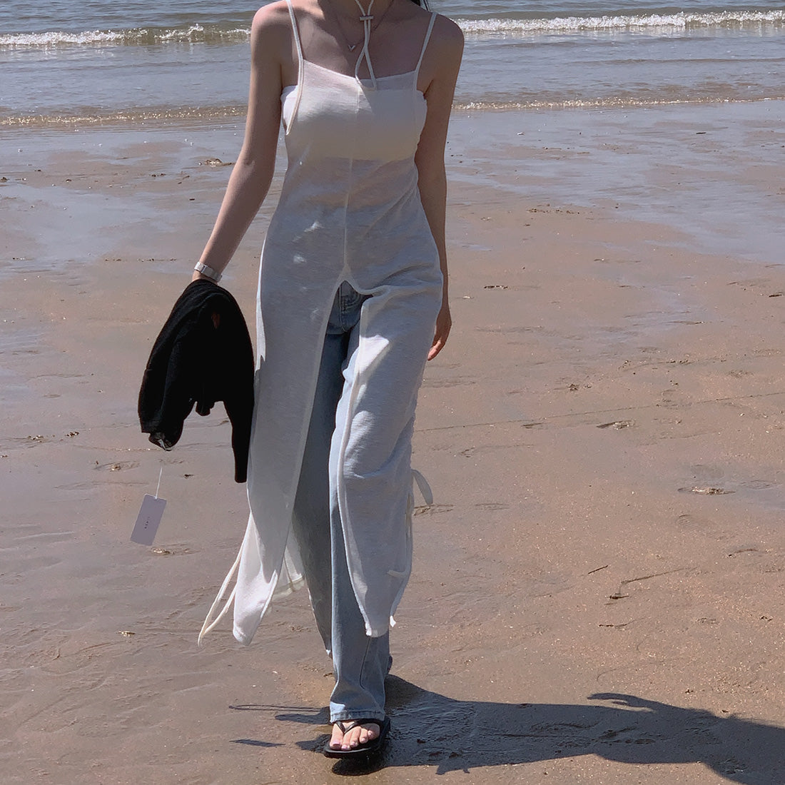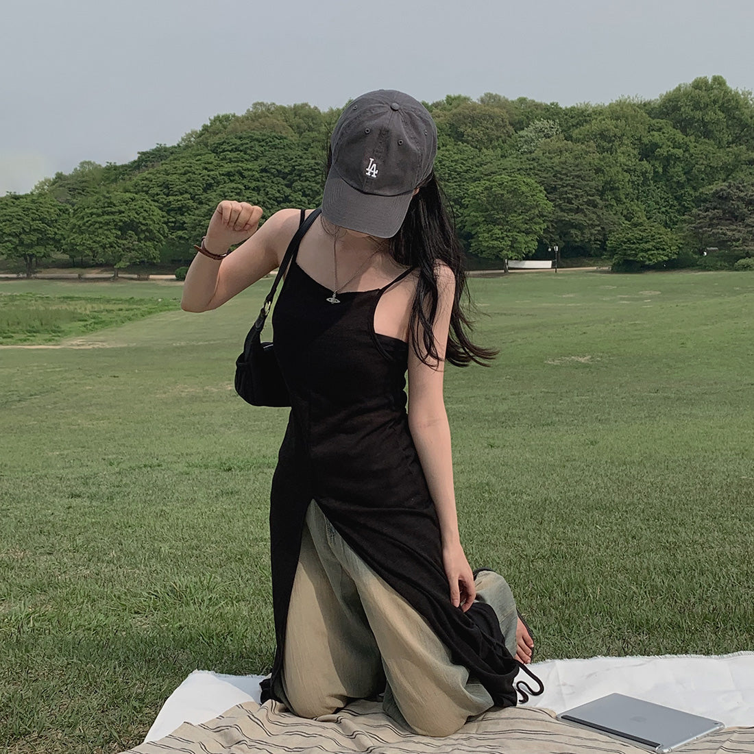【F032288】韓國ins法式氣質開叉設計針織抽繩長吊帶洋裝250311