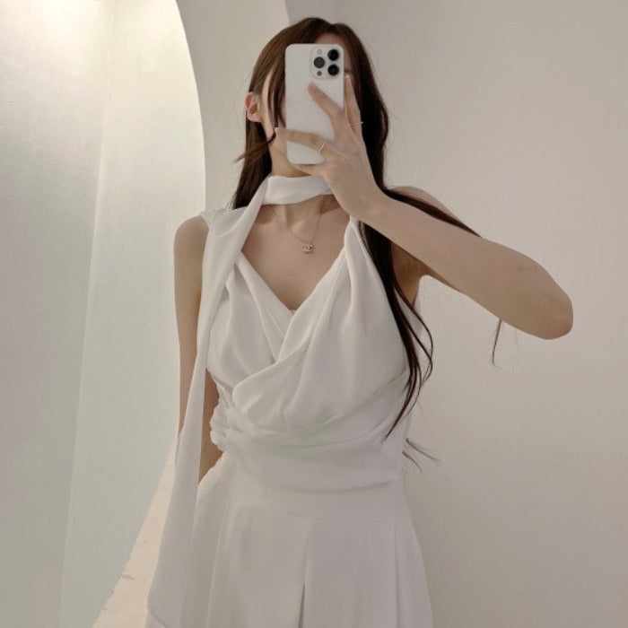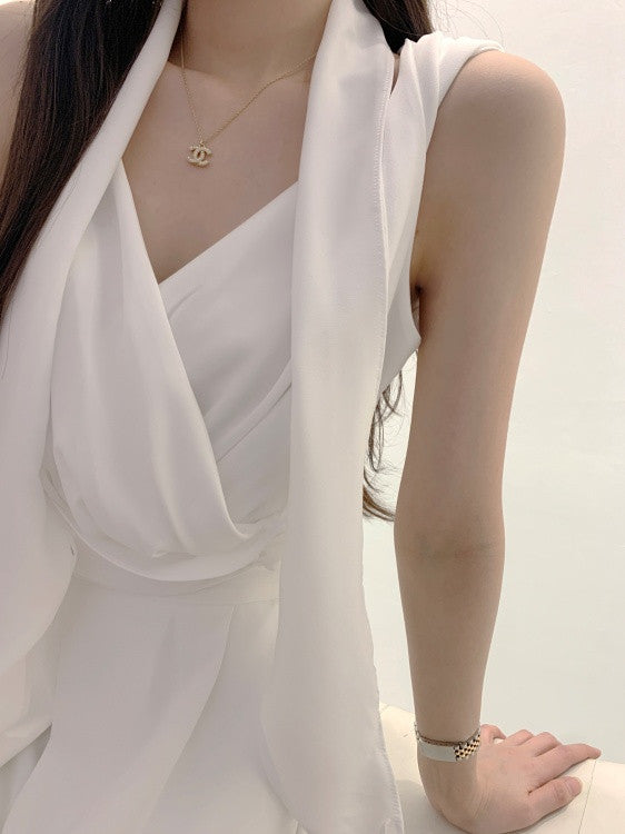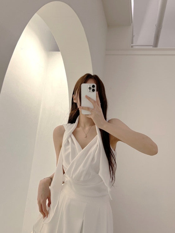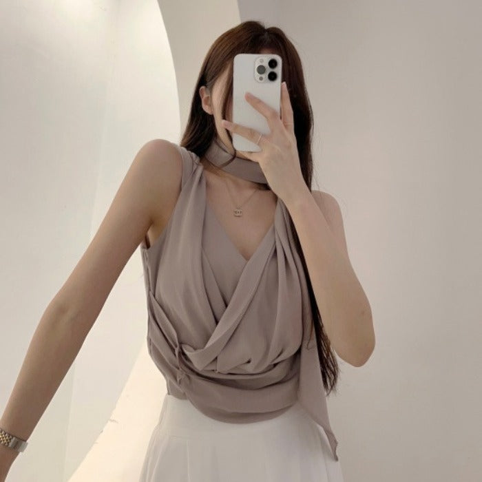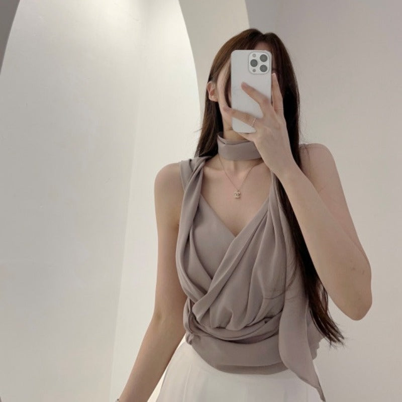 【F034286】韓國設計款V領褶皺雪紡衫+飄帶250325