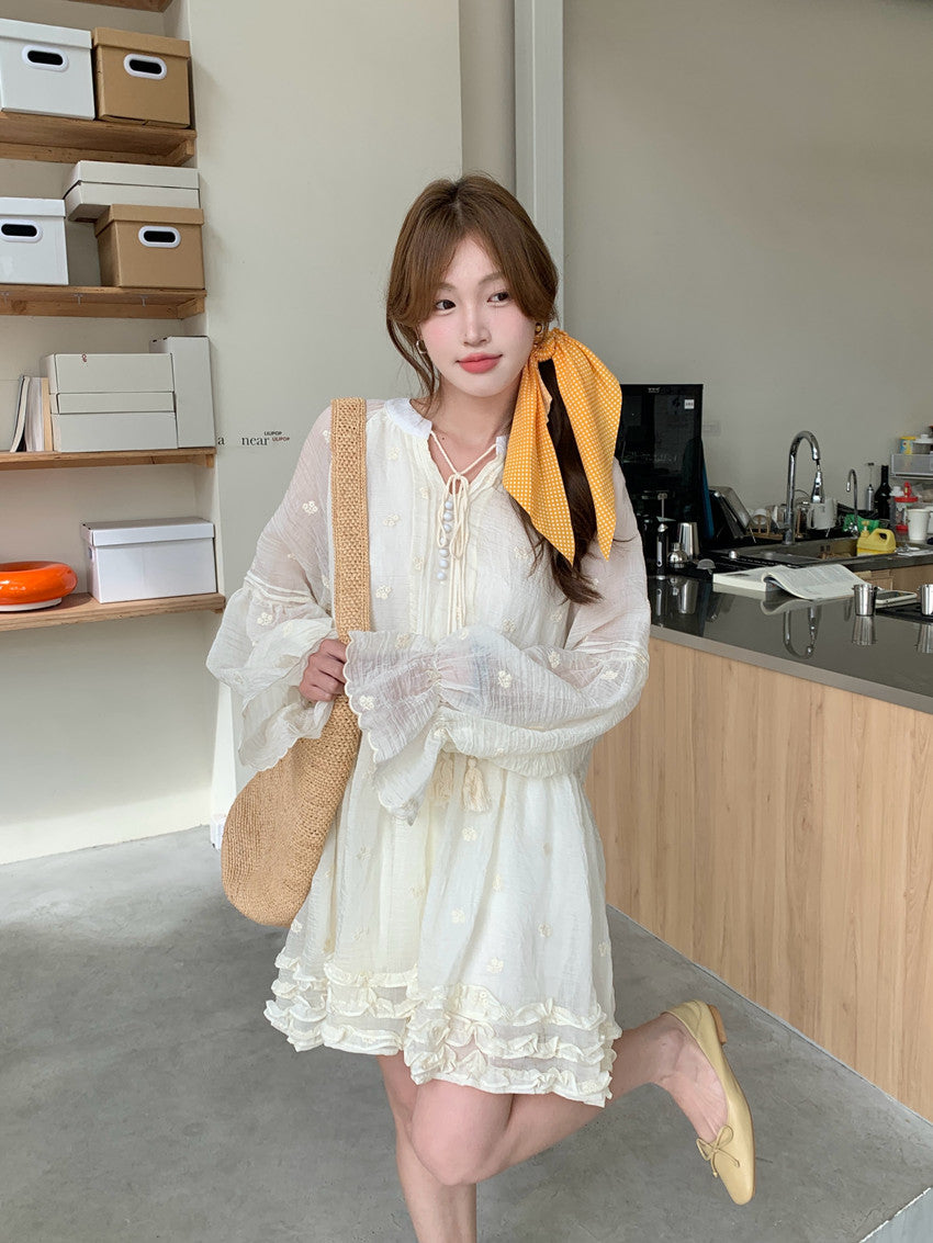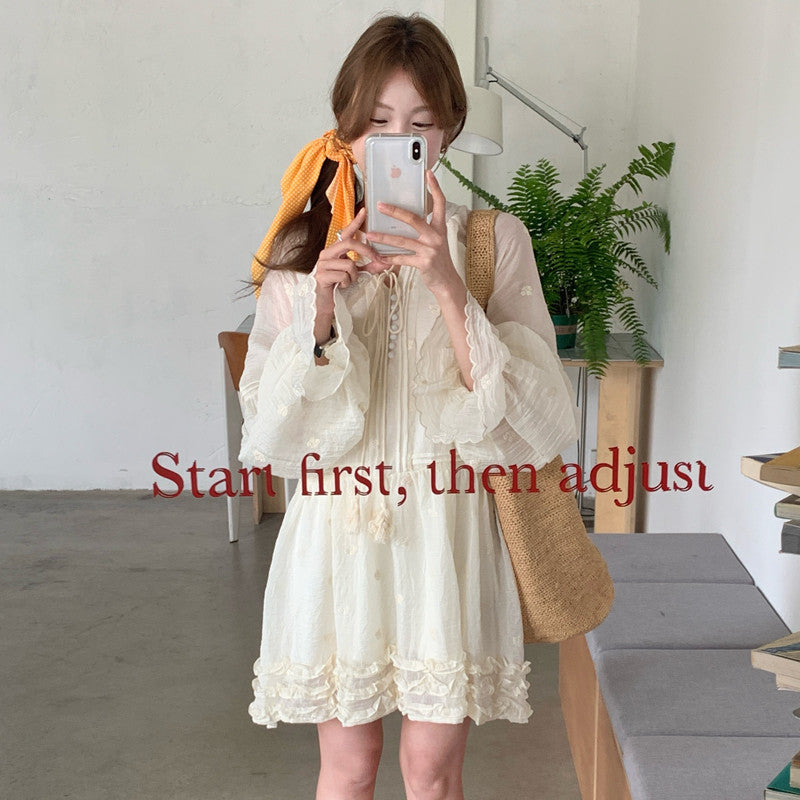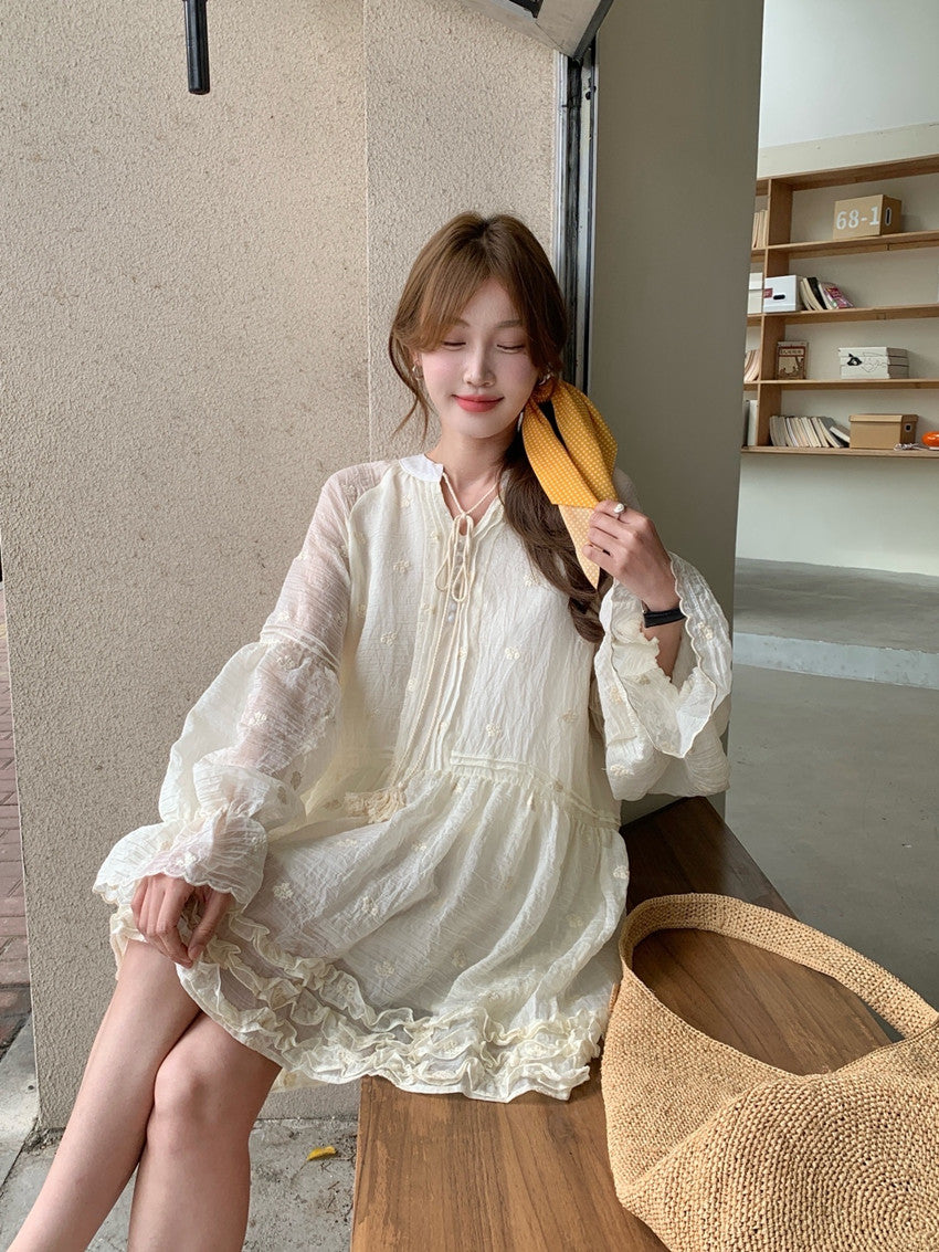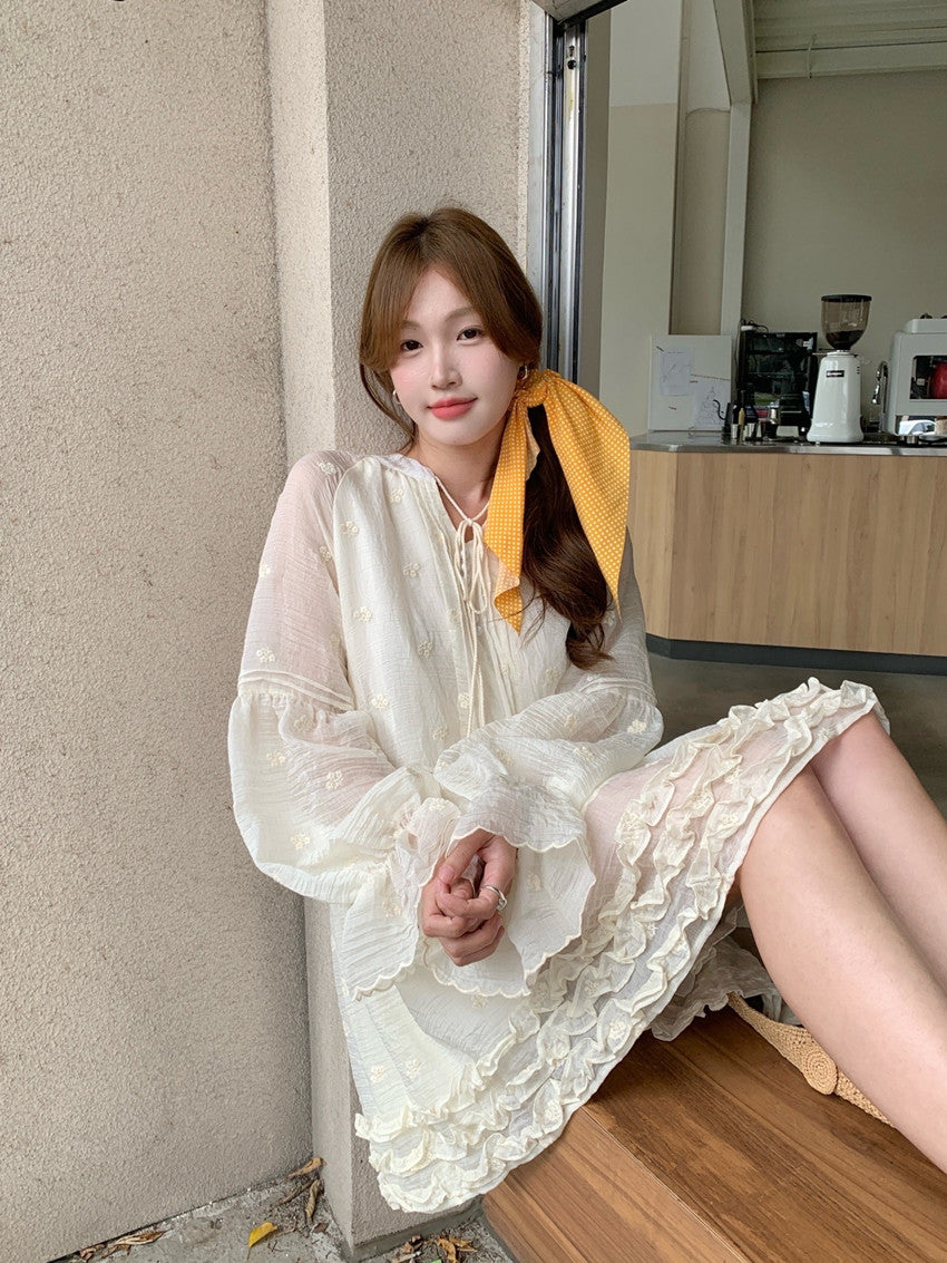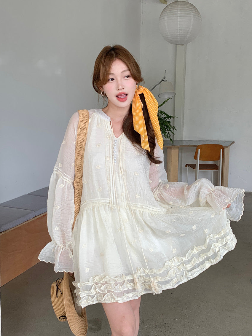 【F034290】實拍甜美復古荷葉繫帶喇叭袖長袖洋裝250325