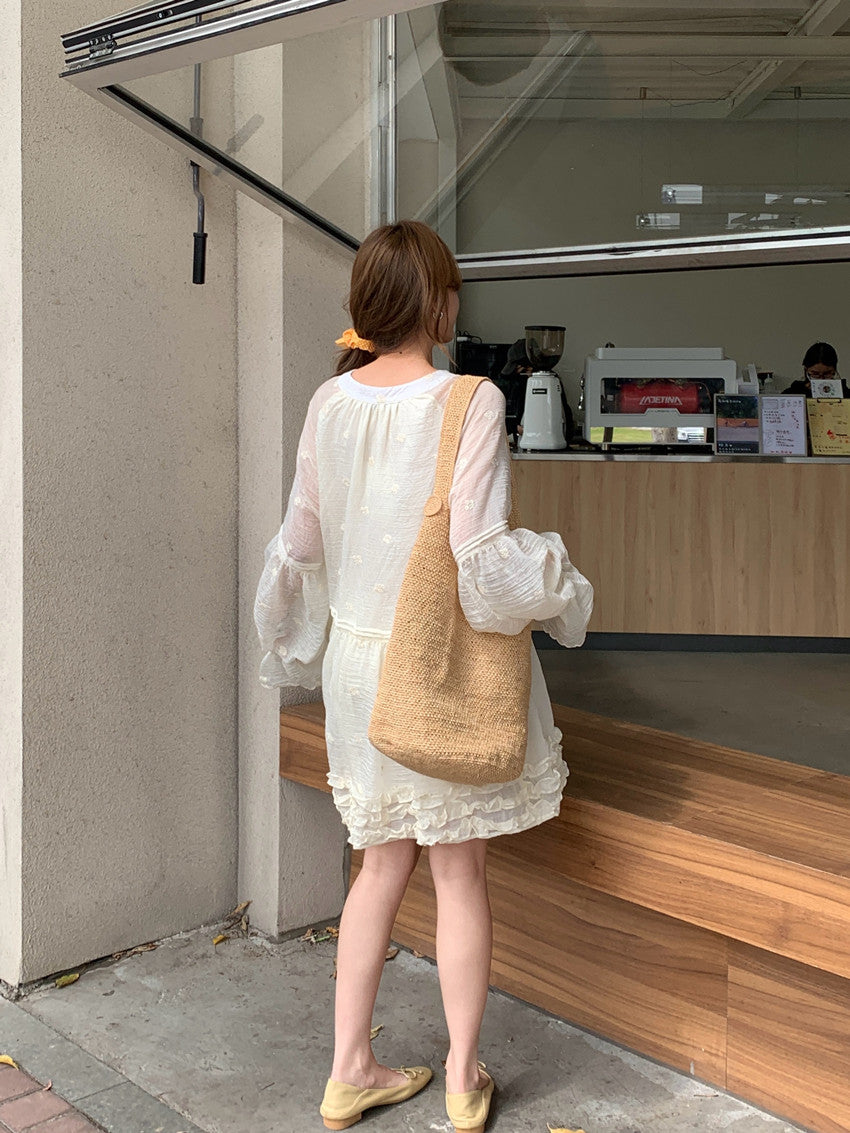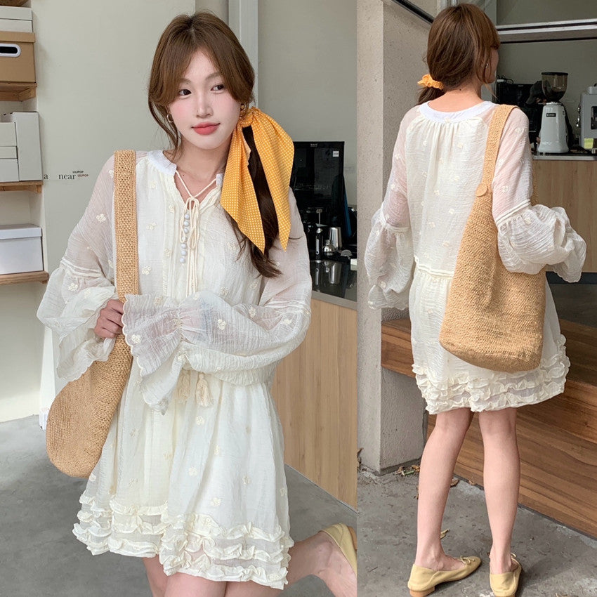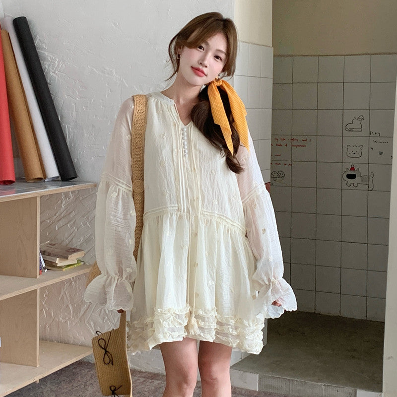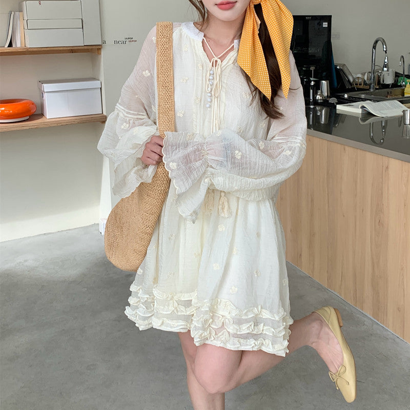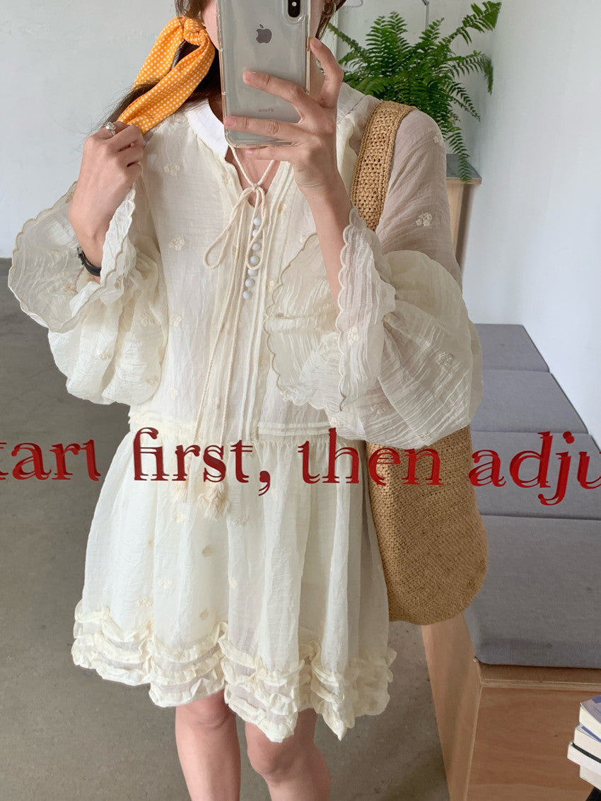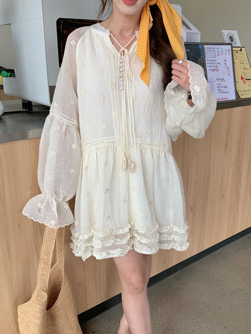 【F034290】實拍甜美復古荷葉繫帶喇叭袖長袖洋裝250325