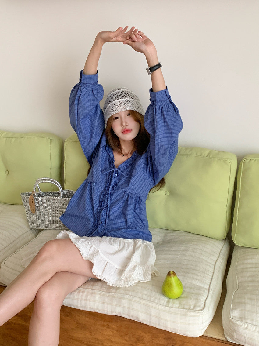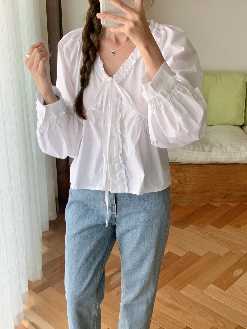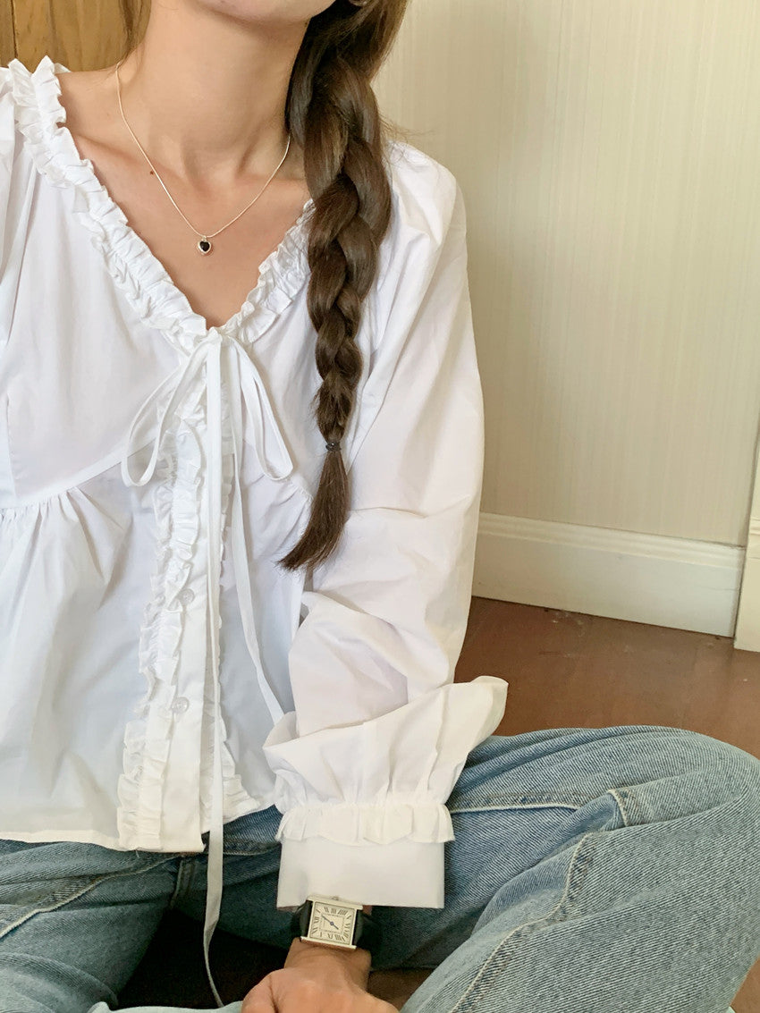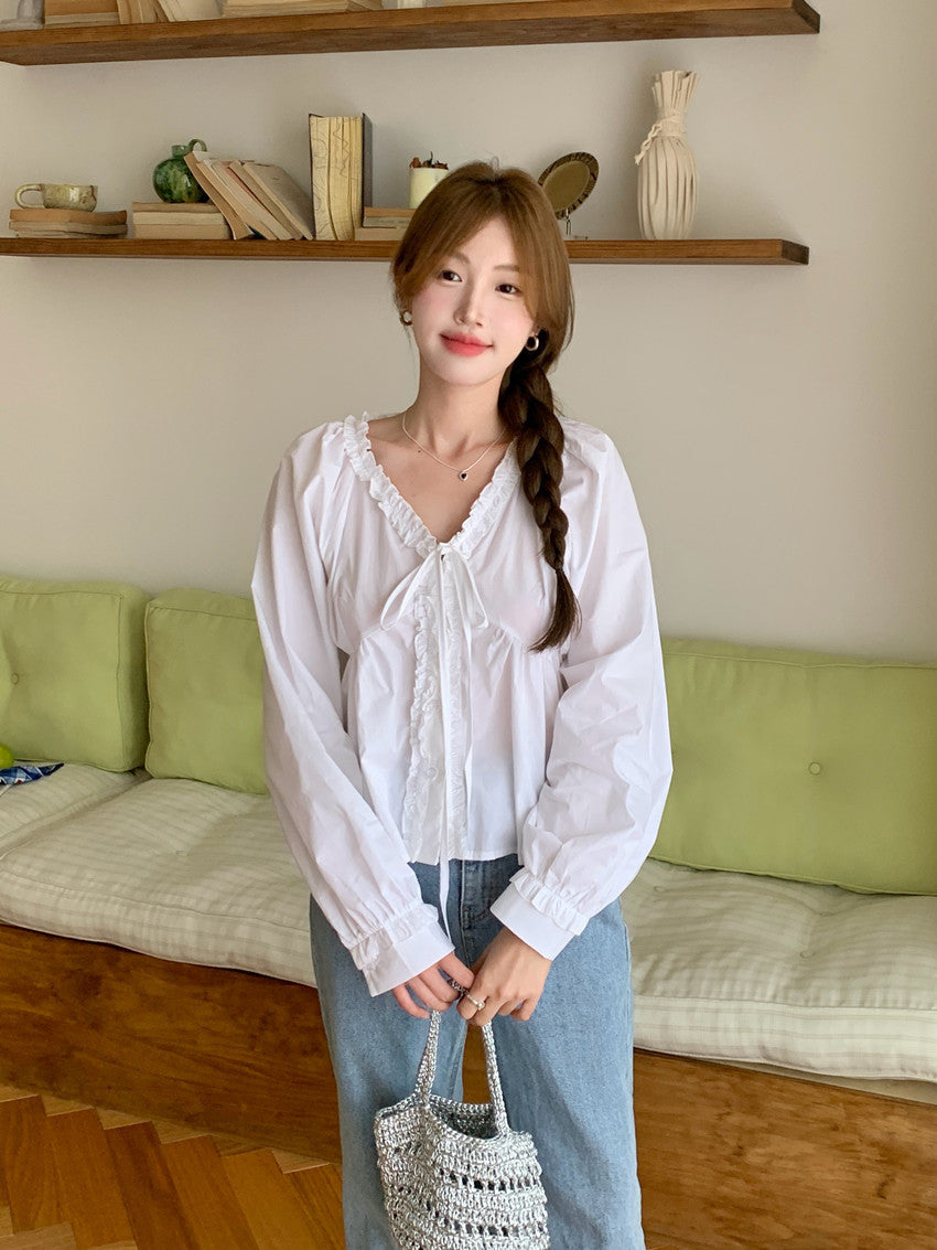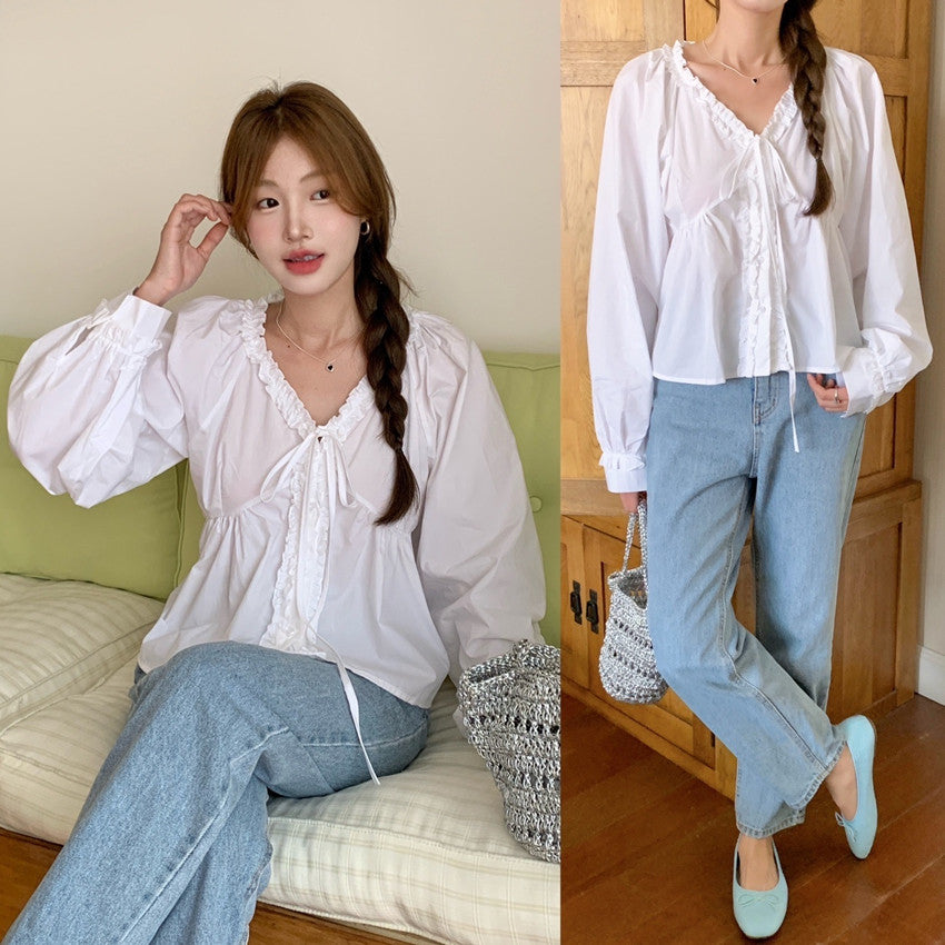 【F034292】實拍夏季清新荷葉繫帶長袖袖襯衫250325
