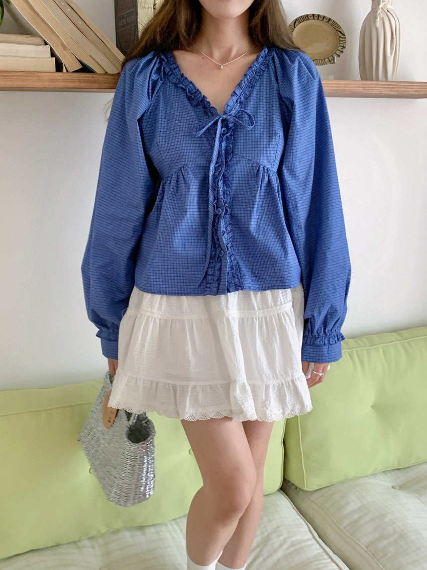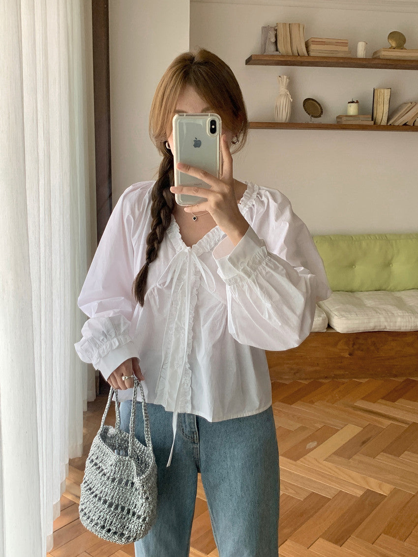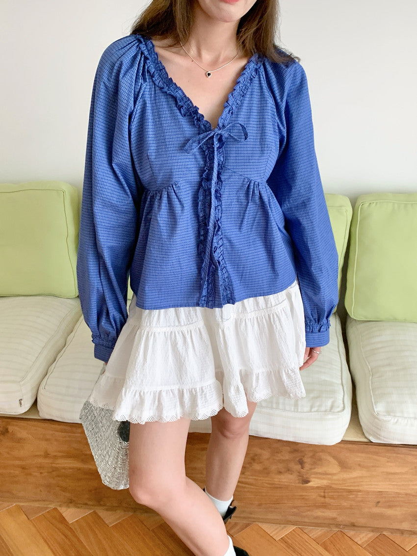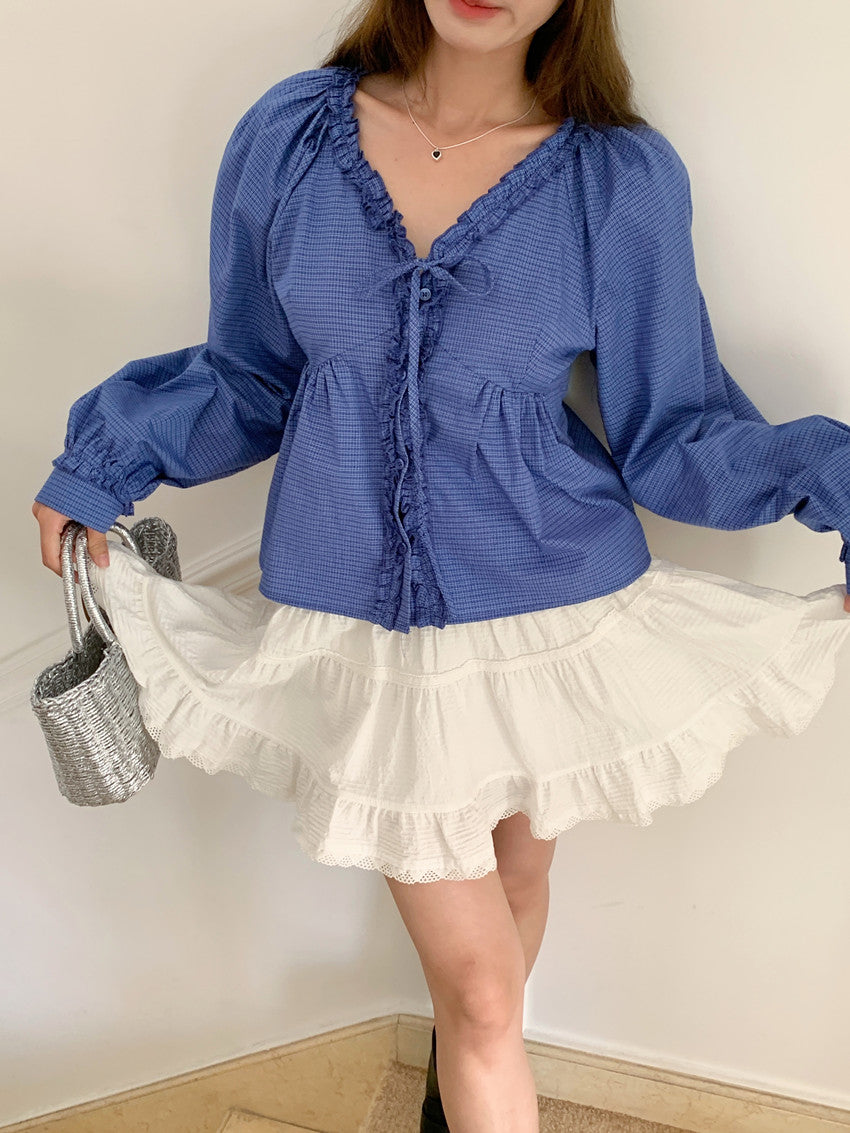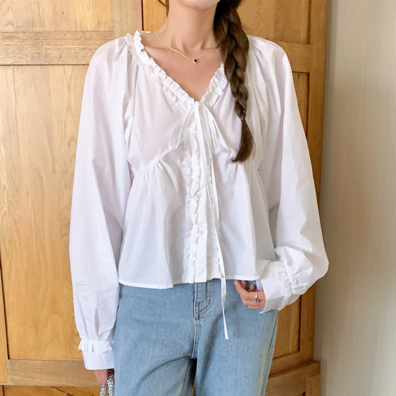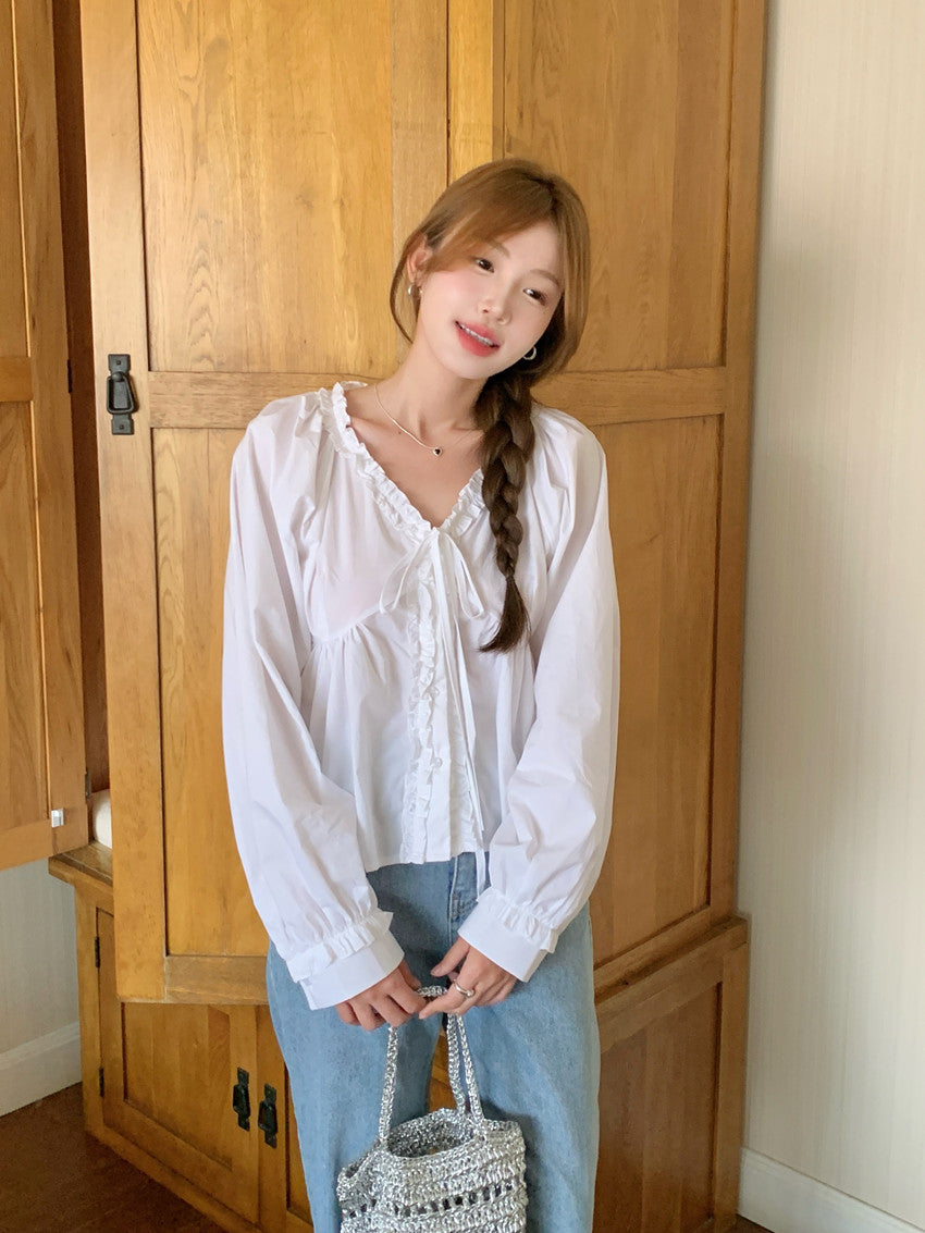 【F034292】實拍夏季清新荷葉繫帶長袖袖襯衫250325
