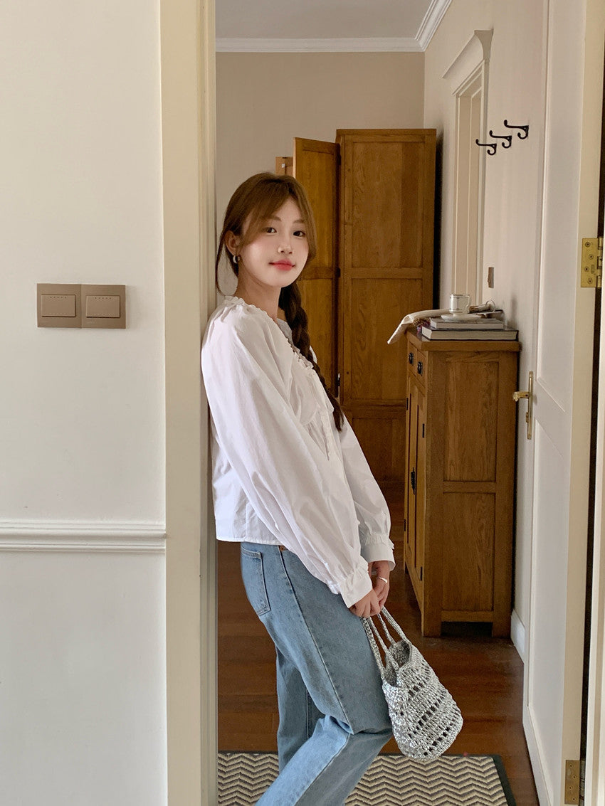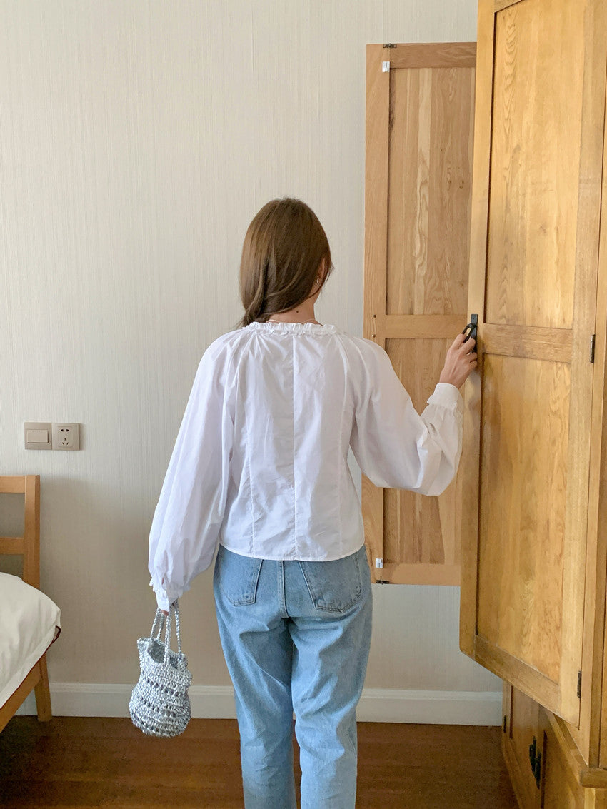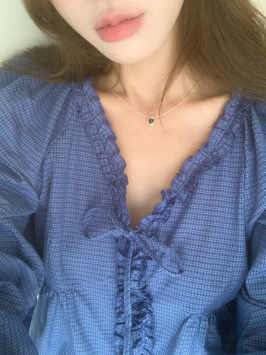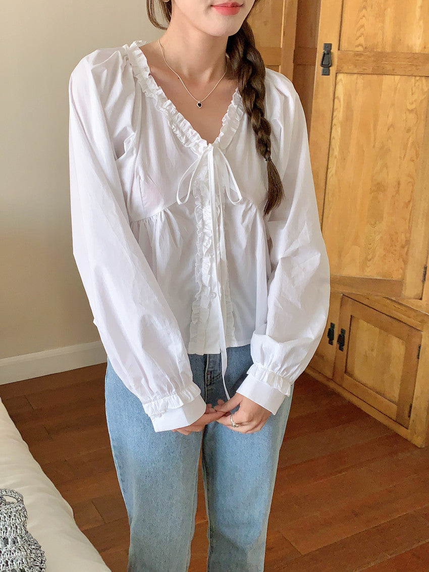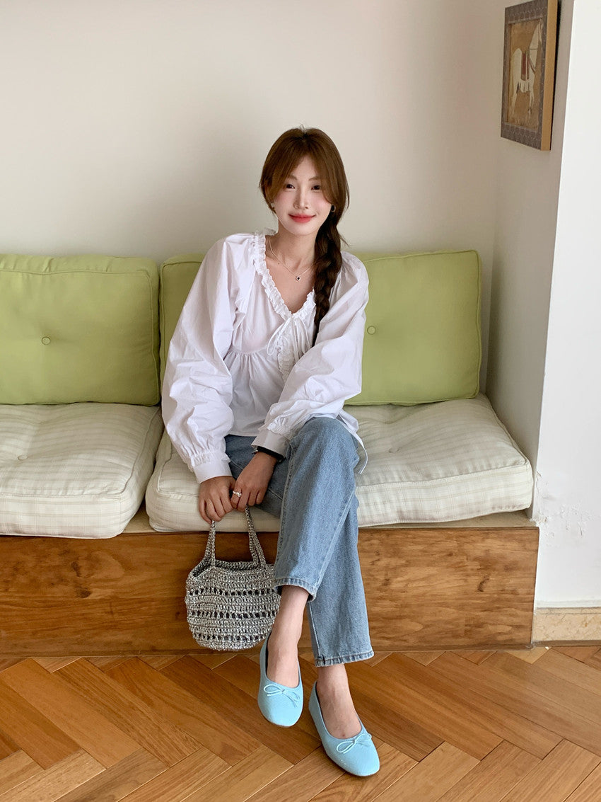 【F034292】實拍夏季清新荷葉繫帶長袖袖襯衫250325
