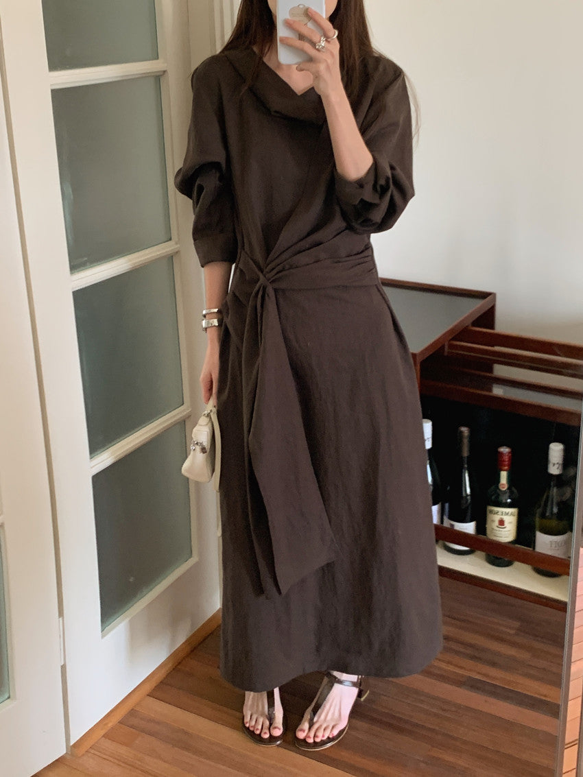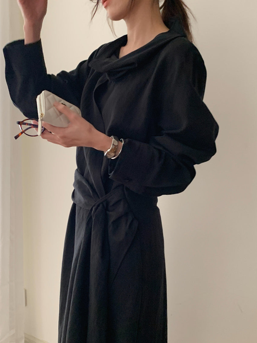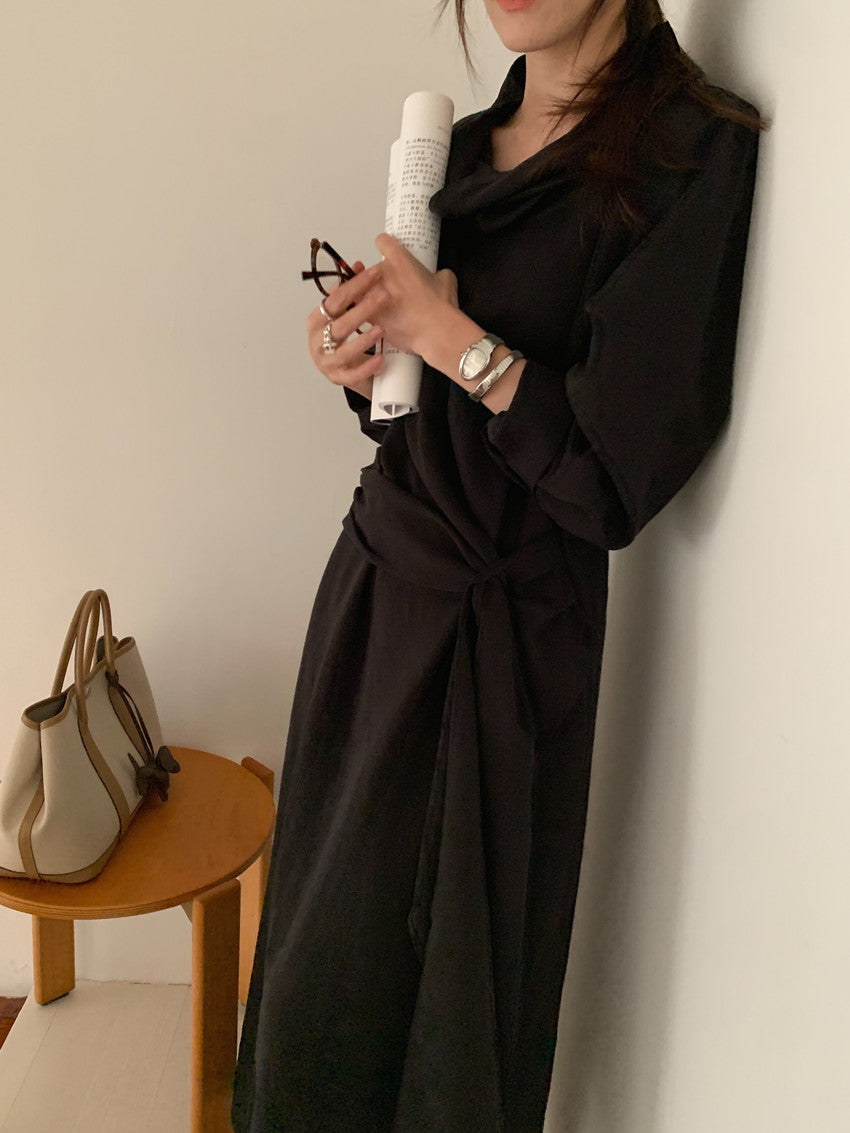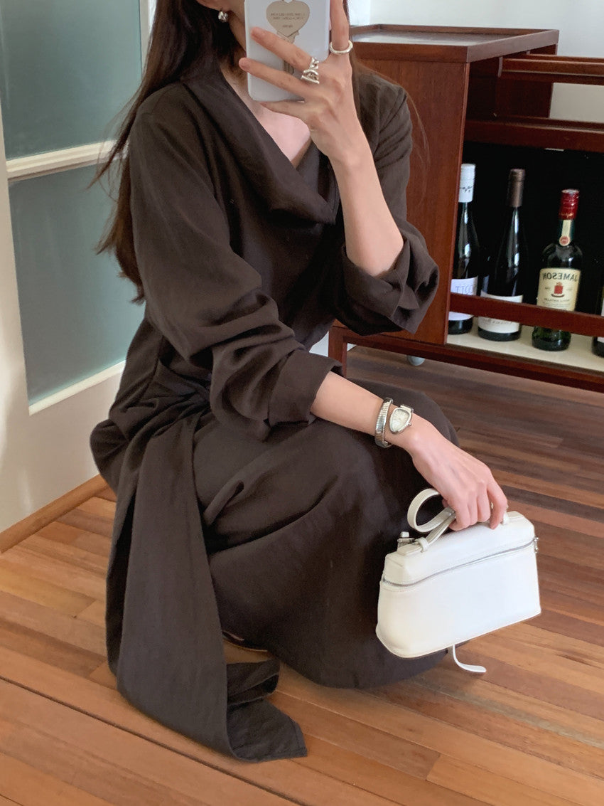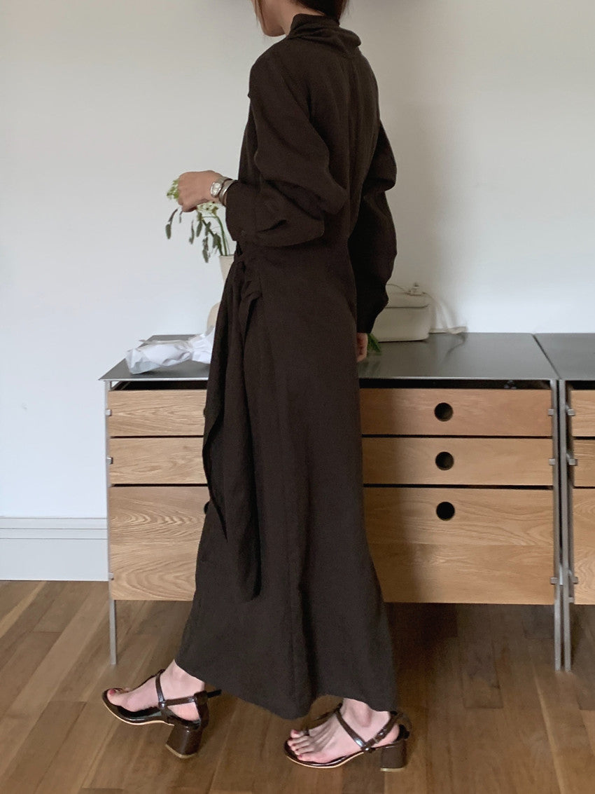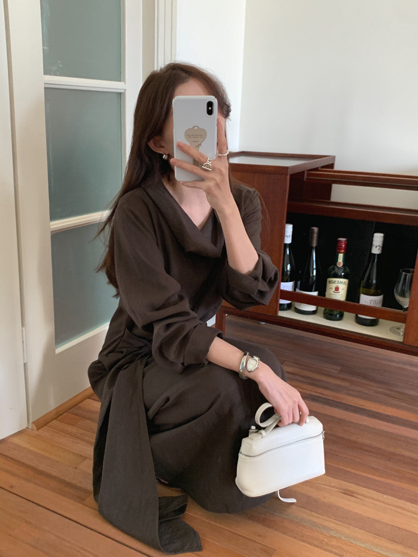 【F60136】實拍法式復古優雅氣質立領寬鬆大綁帶長袖洋裝250212