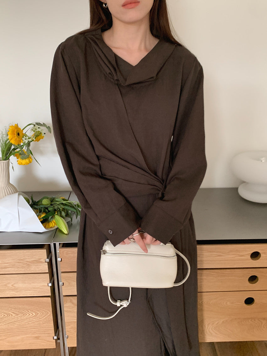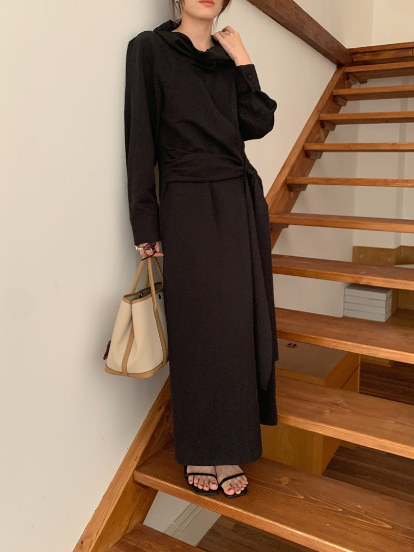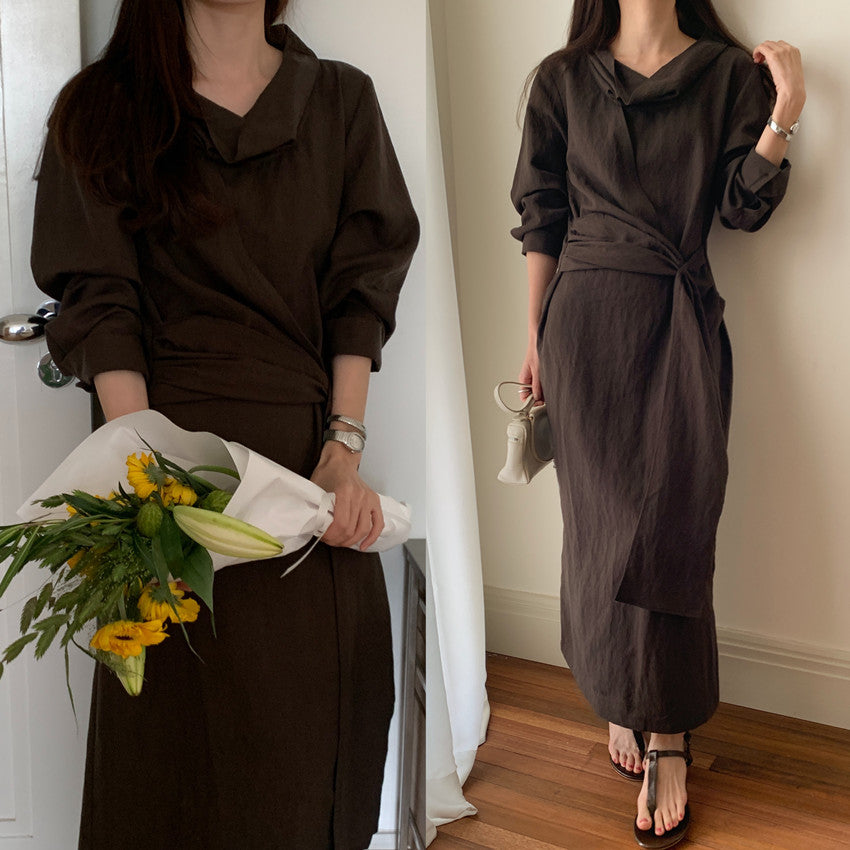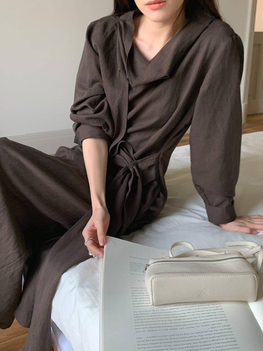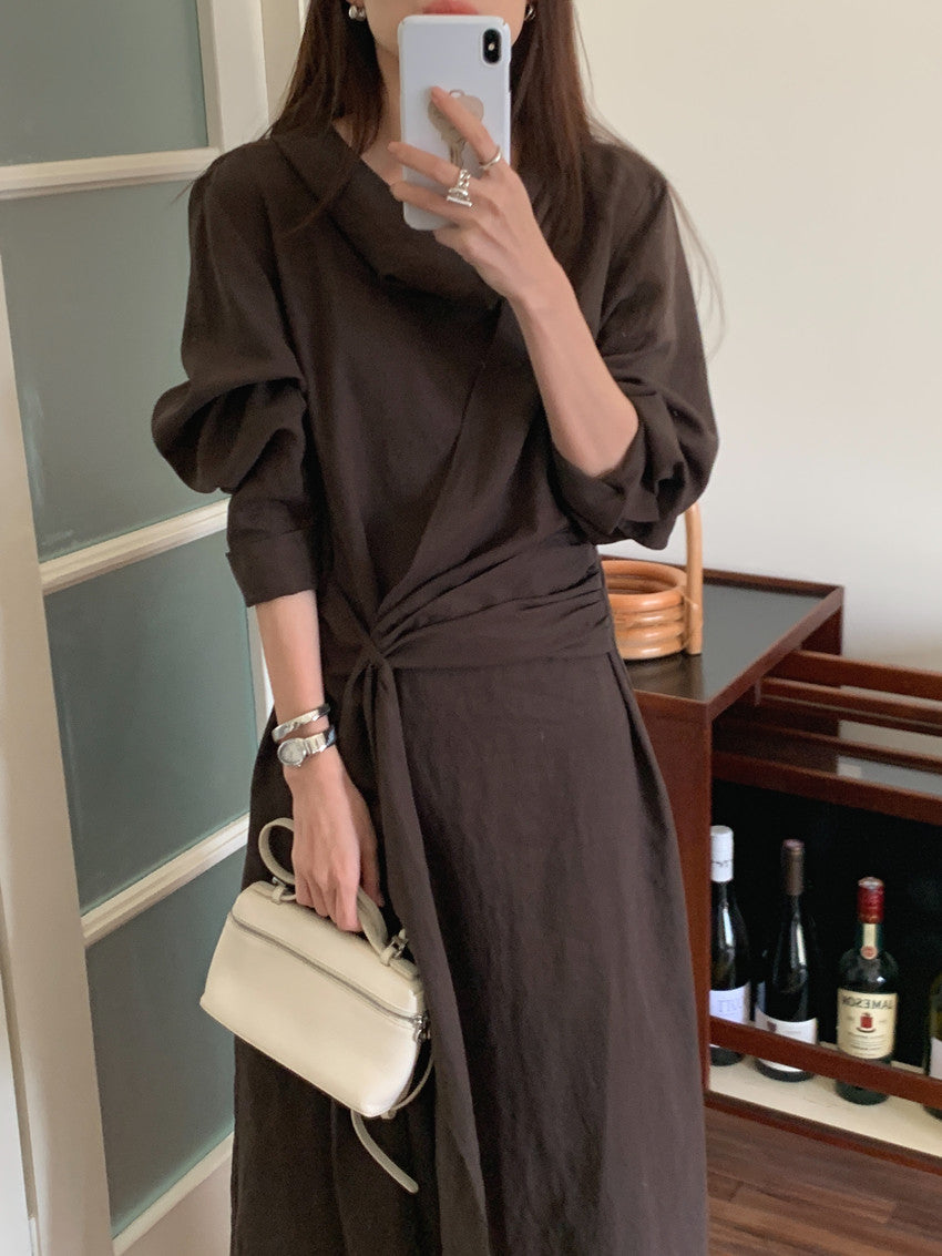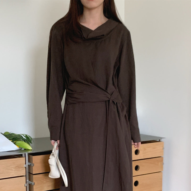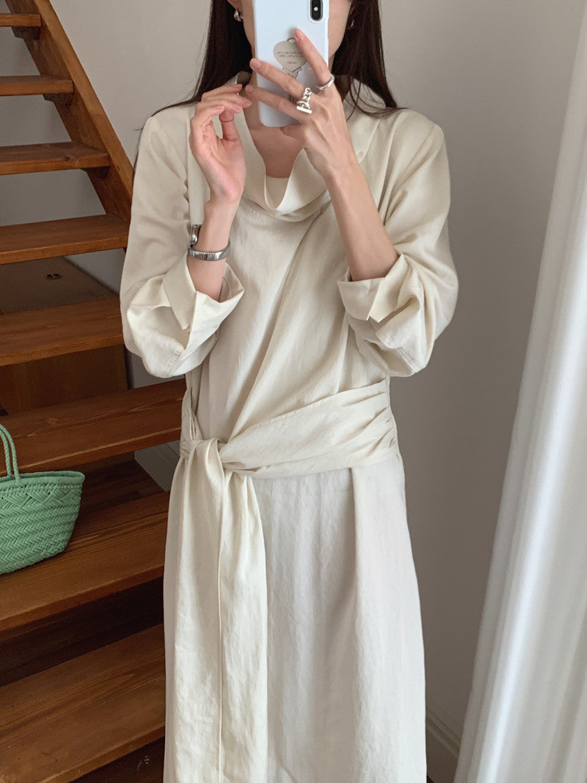 【F60136】實拍法式復古優雅氣質立領寬鬆大綁帶長袖洋裝250212