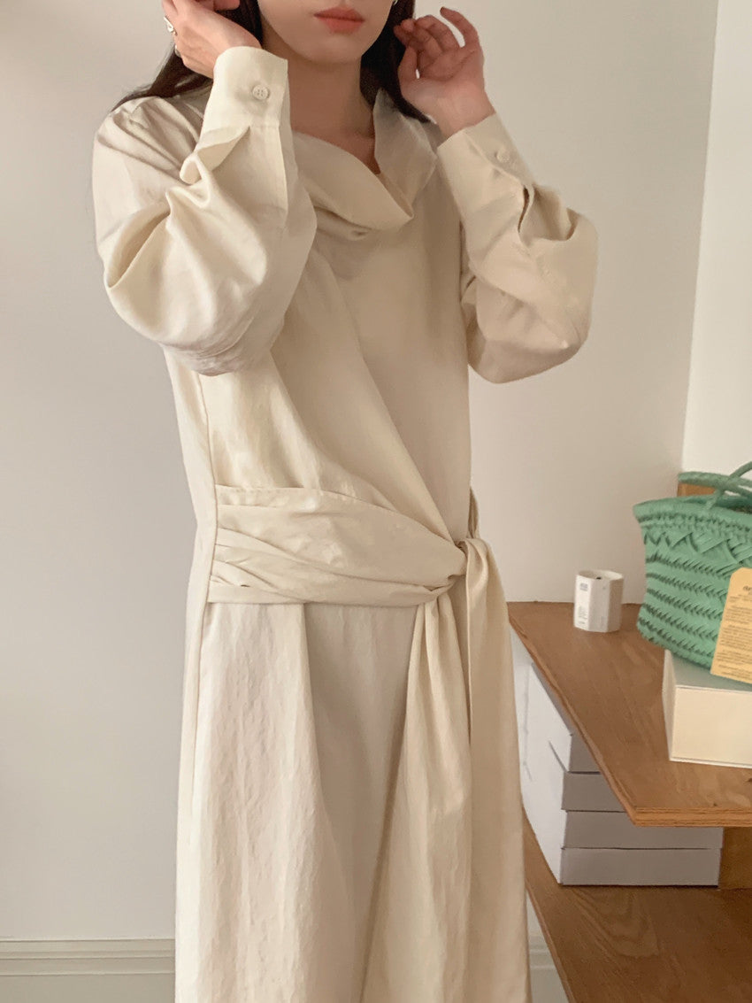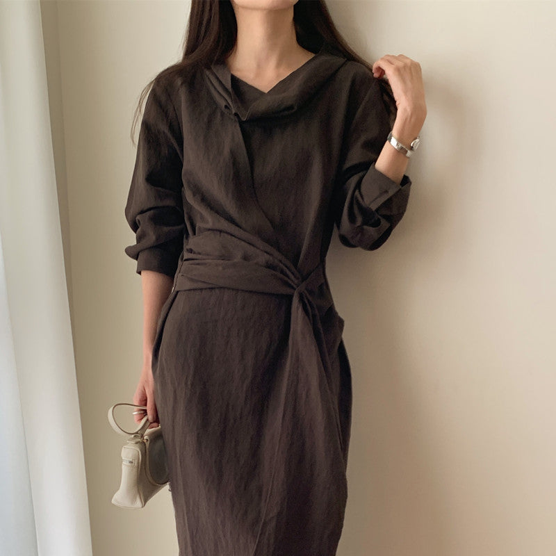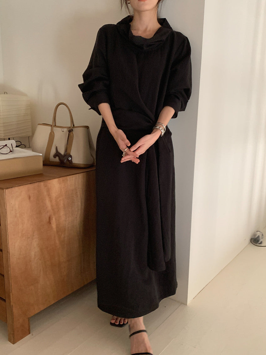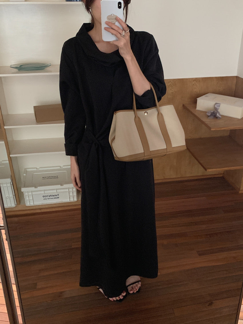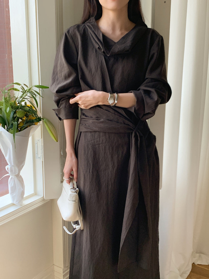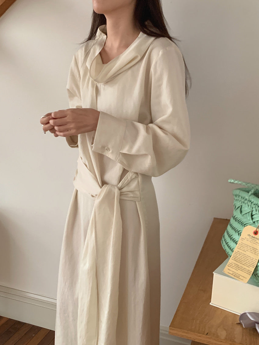 【F60136】實拍法式復古優雅氣質立領寬鬆大綁帶長袖洋裝250212