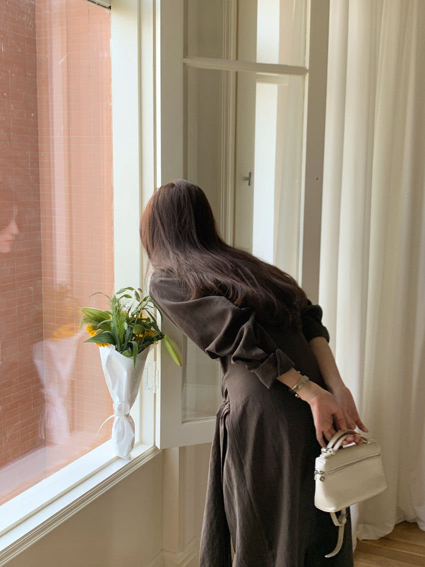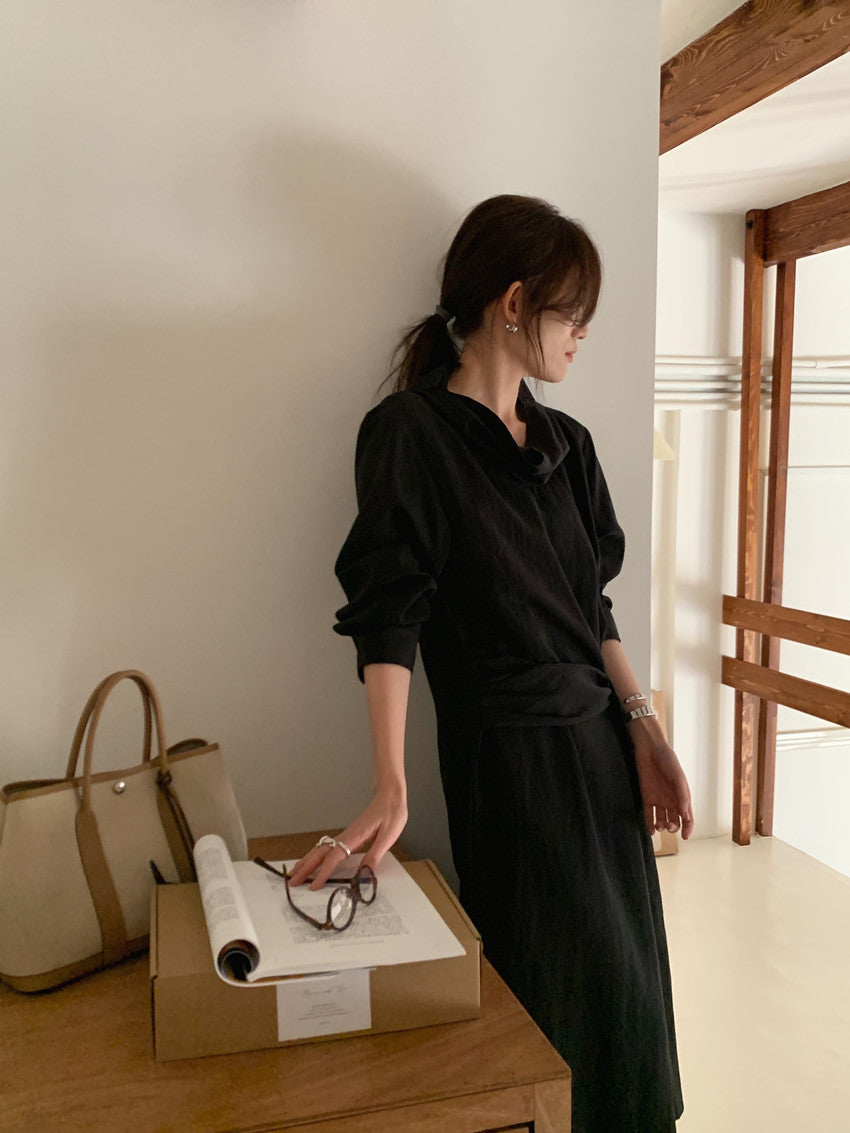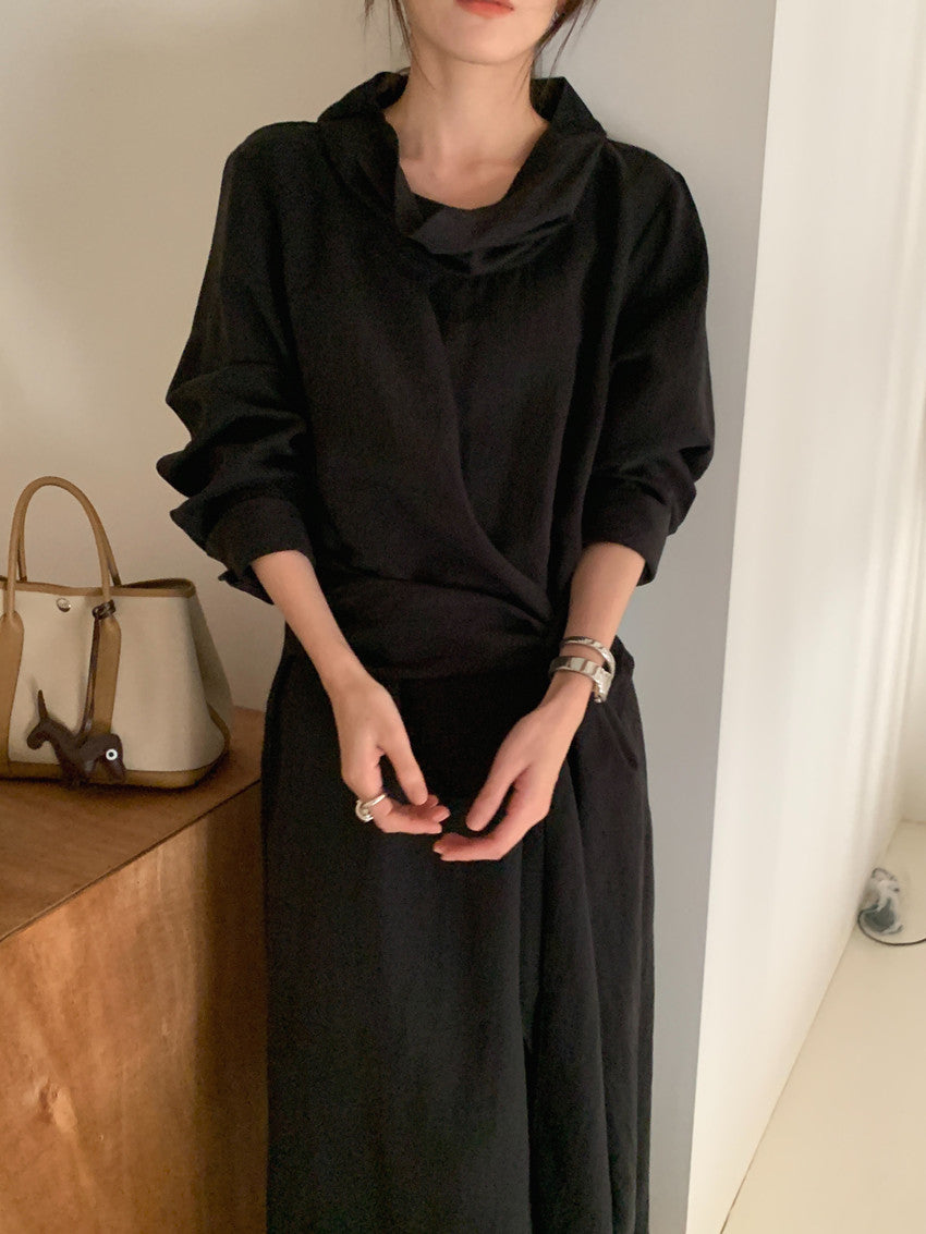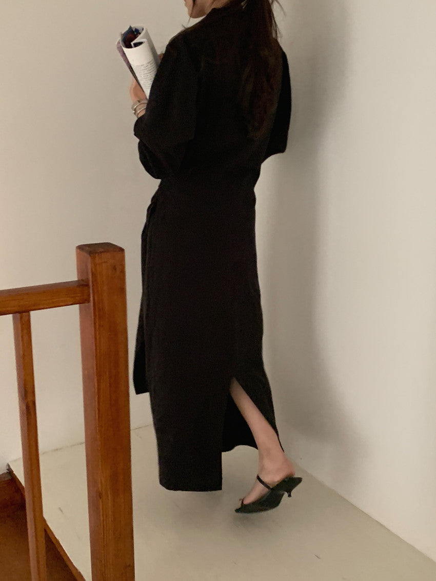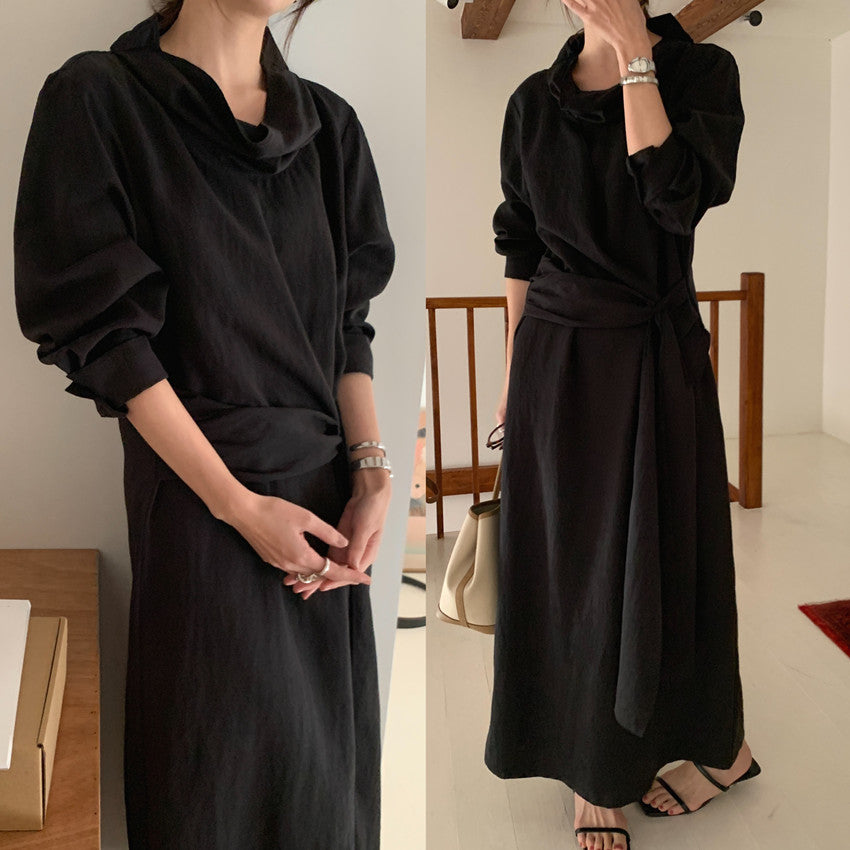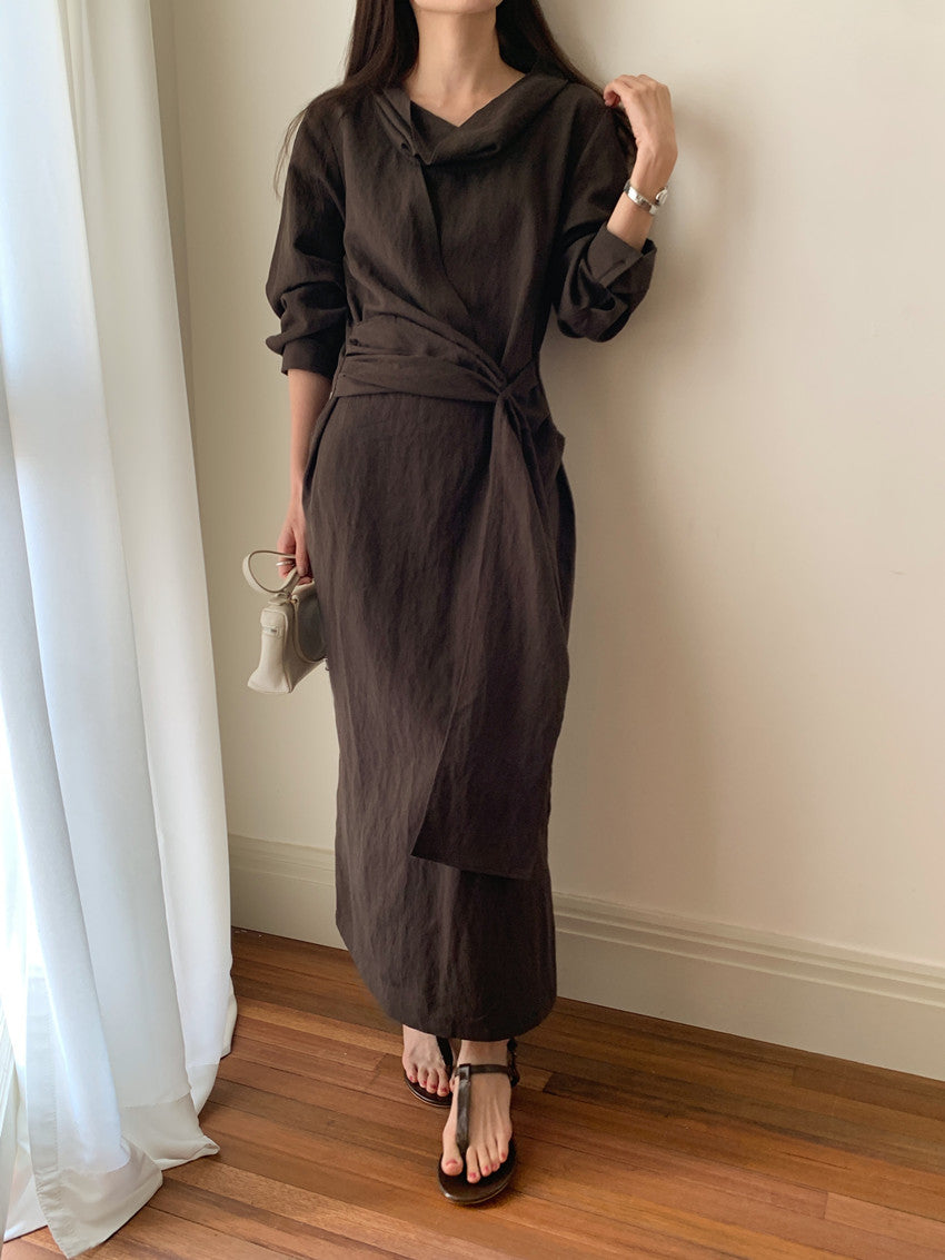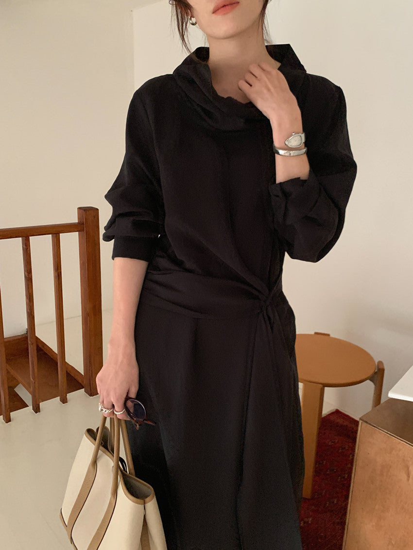 【F60136】實拍法式復古優雅氣質立領寬鬆大綁帶長袖洋裝250212