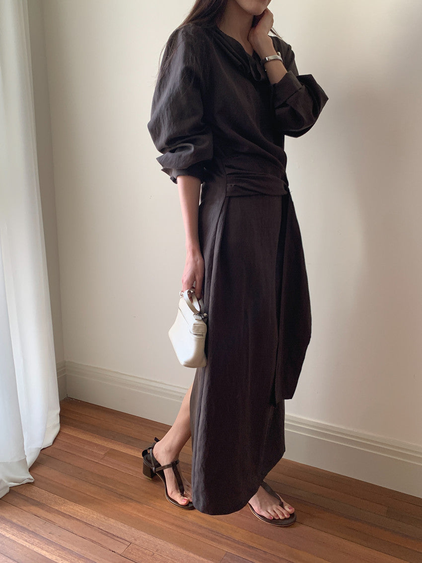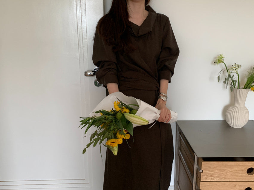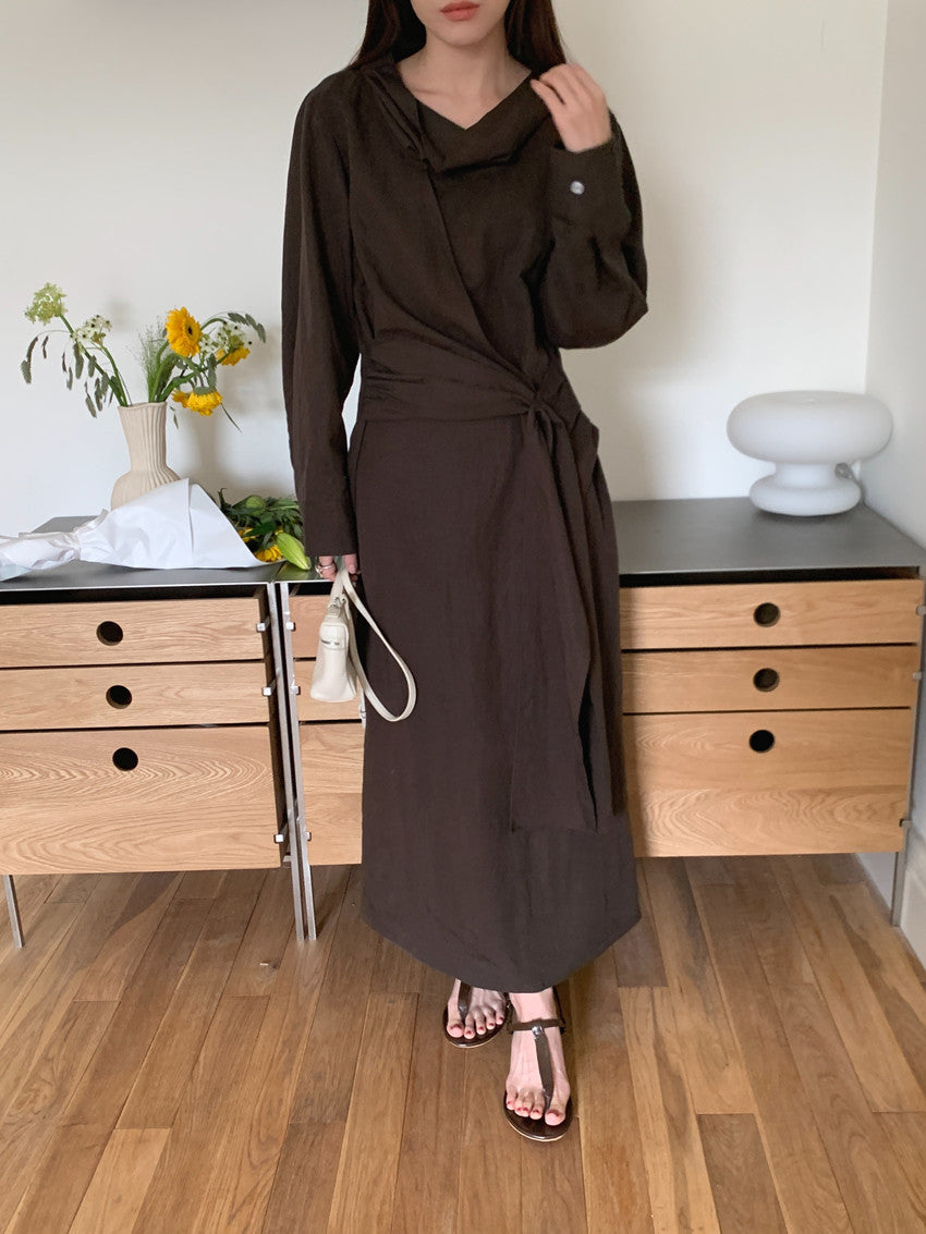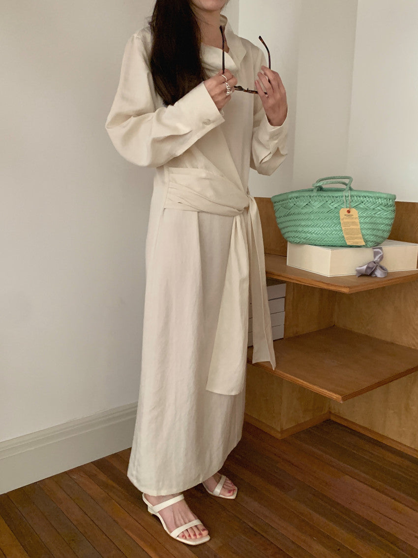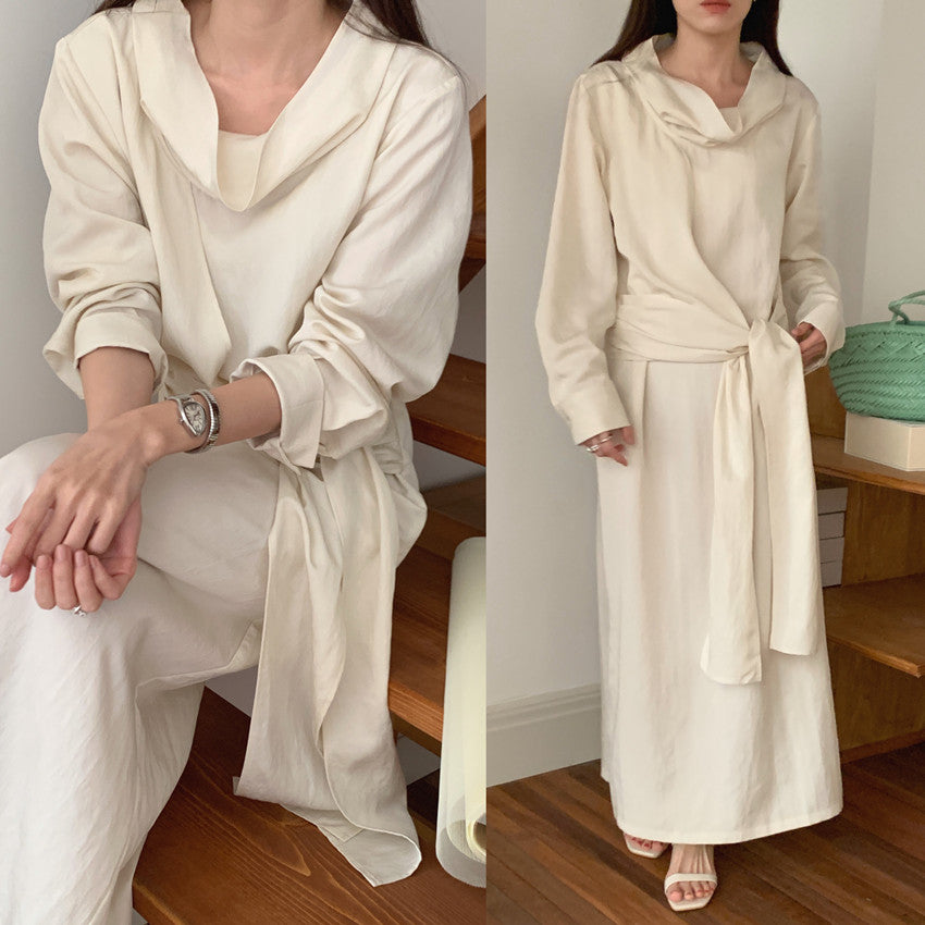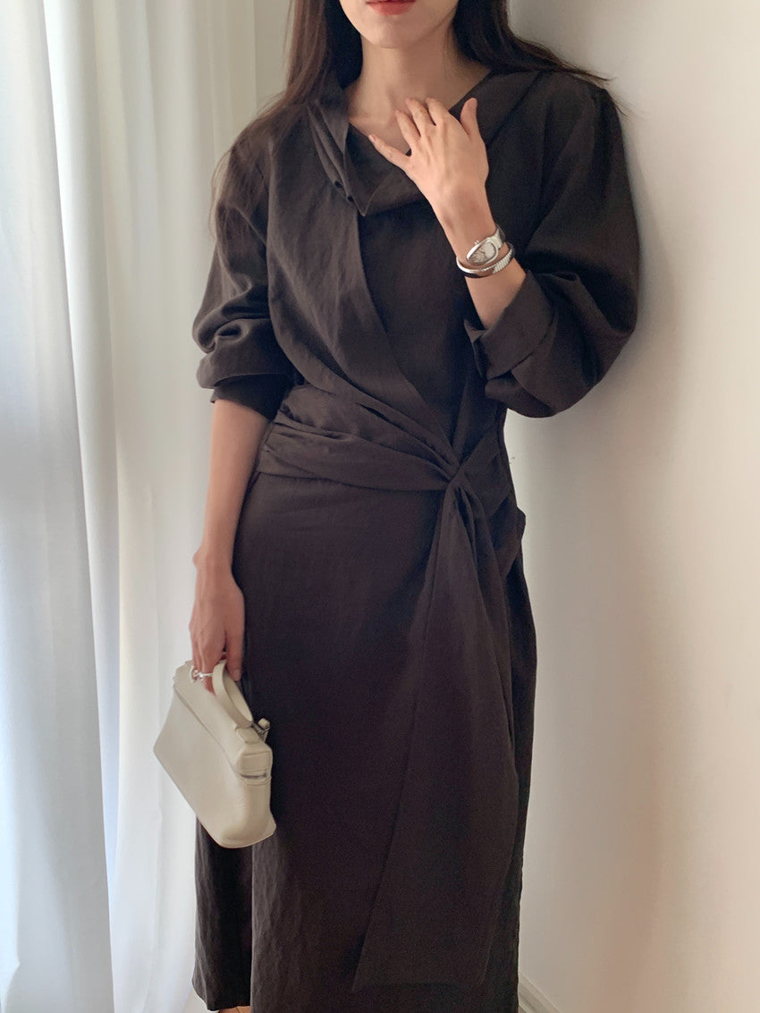 【F60136】實拍法式復古優雅氣質立領寬鬆大綁帶長袖洋裝250212